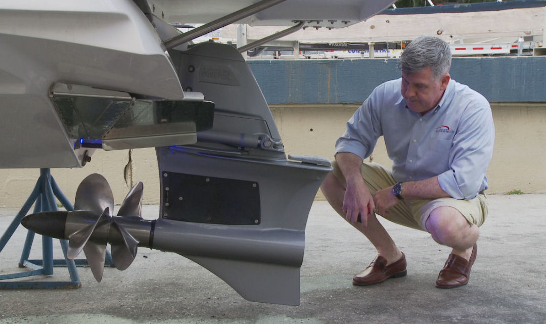 Сейчас АКП мотора стоит в самом нижнем положении лифта, далее задача гидравлики поднимать АКП мотора в верх. Полупогруженный винт будет подниматься ещё выше бывшей линии днища лодки
