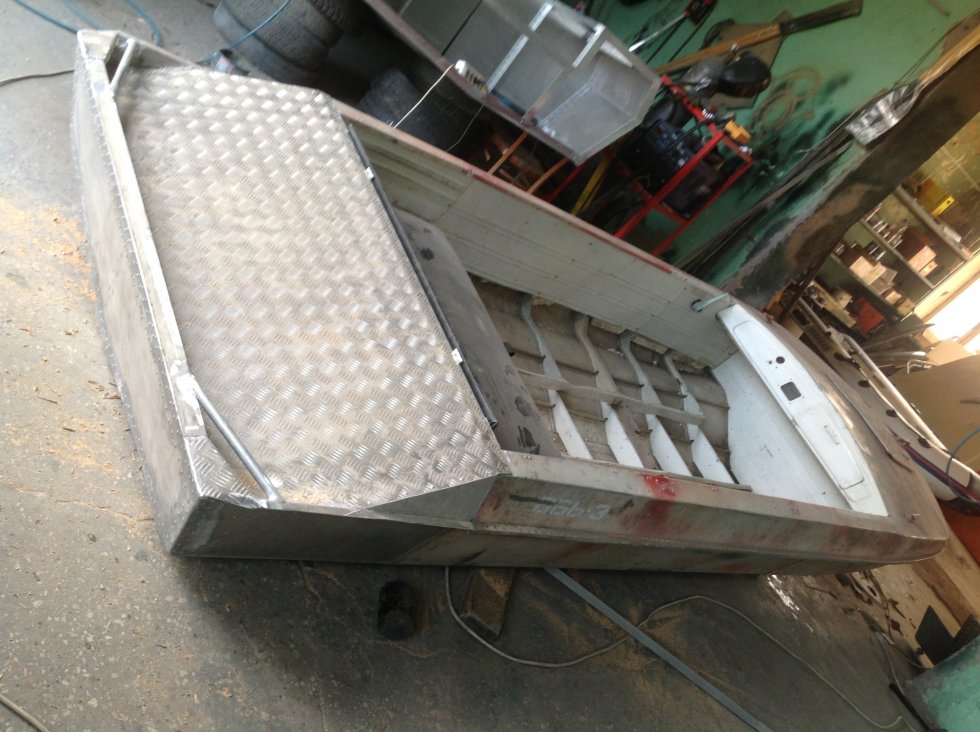 Делал у себя, но давненько. 2 слоя 26мм бакелитовой фанеры, обернул стеклотканью с эпоксидкой а поверху листом алюминия, укрепил транец 2-мя швеллерами за перегородку заднего сиденья. Мотор ямаху 50 держит. Если надо на следующей неделе сфоткаю как получилось. Рундуки остались, там разместились 2-а бака по 25 литров, аккумулятор под задним сиденьем. Очень удобно на охоте сидеть на моторе