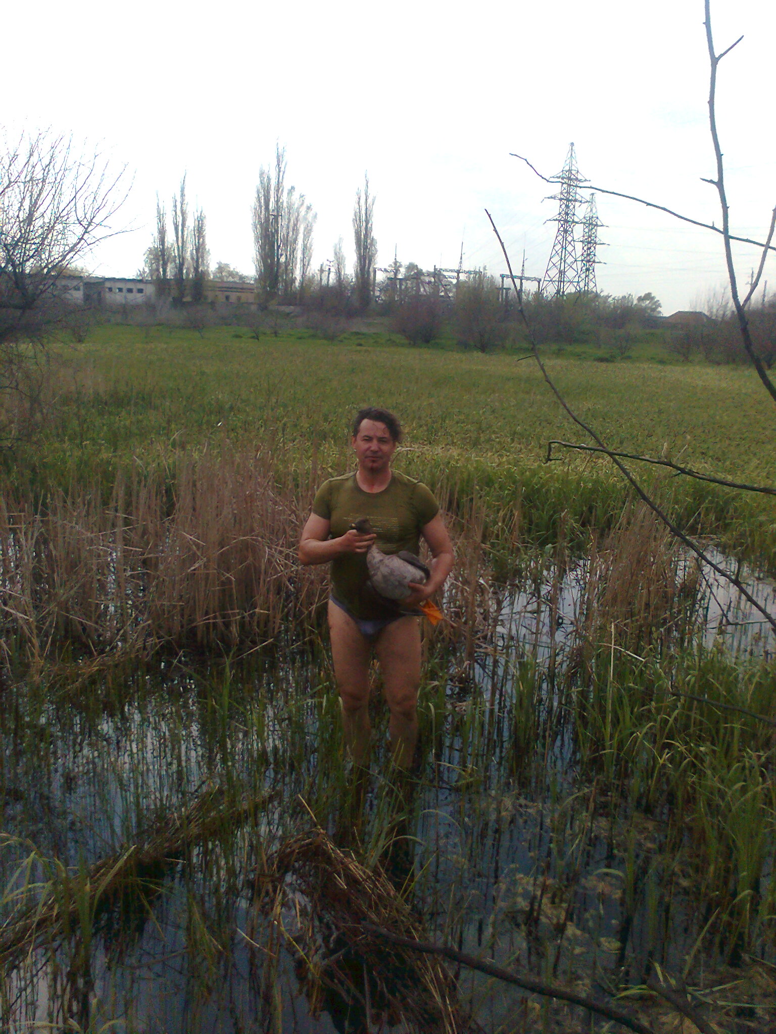 На следующее утро, после нескольких неудачных выстрелов (высоко летят) ,удача все же улыбнулась... ИЖ-54 1956г. ,цельнотянутые стволы 750мм и дробь "00" сделали свое дело ....Упал гусь подранком и гонял его по болоту еще минут десять....,поэтому прошу не ржать с меня на фото сразу после "рукопашной",Рэмбо ,1 кровь.. с гусем .Крепкая птица на рану и это с учетом того ,что одна дробина на вылет,ну а дальше ,свадьба ....