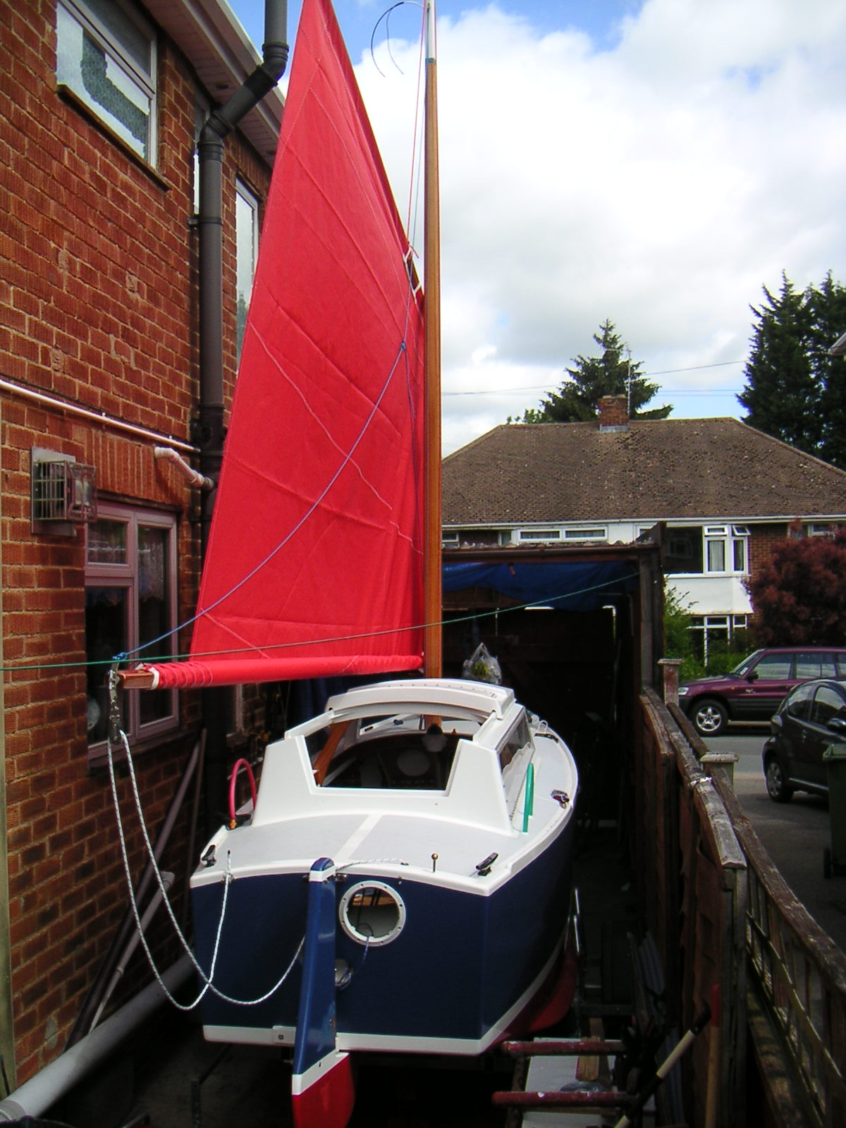 Навороченные варианты с двумя парусами (грот+стаксель) я считаю извращением из-за загроможденности кокпита, невозможности туго набить такелаж (помешает низкая жесткость корпуса), длительности сборки-разборки. Чтобы не мучаться с шитьем, попробуйте купить б/у парус от детского швертбота "Оптимист".