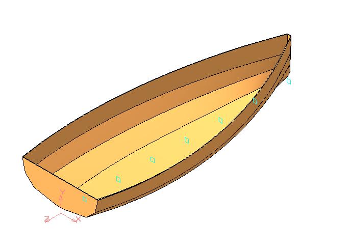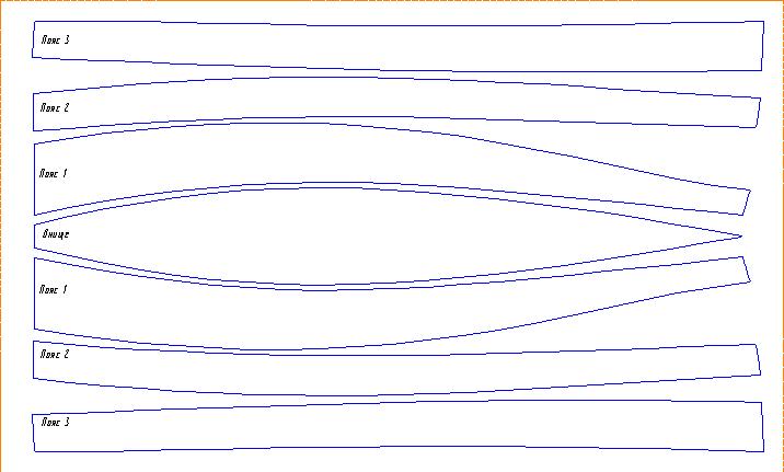 Охота пуще неволи. Решил начать с составления таблицы для плаза. Информации нет, зато много фотографий в интернете. Опыта у меня не много, но есть компьютер, что полезно в этом деле. Нашел несколько фотографий нужного ракурса и приблизительно, сначала увеличив их до натуральной величины лодки в компьютере, естественно, обрисовав корпус как в картинке-раскраске, перенес в программу САПР. Результат - приблизительный теоретический чертеж, а точный мне особо не надо, лишь бы было подобно заданной лодке. Сантиметр туда сюда роли не играет. По полученному теоретическому чертежу сделал компьютерную модель обшивки корпуса для проверки плавности обводов. Вроде похоже. И длина 11 футов, как на образце и ширина совпадает, и вид. Теперь надо проверить как она сядет в воде, но это немного позже. Надо развернуть обшивку на плоскость, чтоб знать сколько фанеры покупать. Вот как это выглядело.