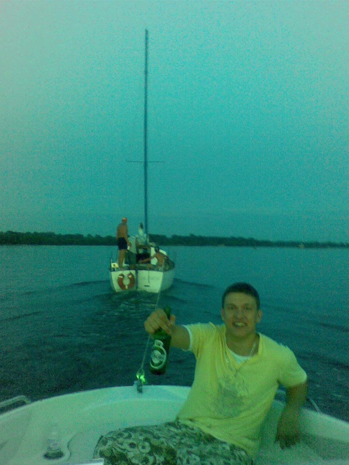 Ближе к 10-ти часам вечера на заправку подъезжает одновременно два судна —парусник, идущий на двигателе и 27-ми футовый Бэйлайнер. Капитан парусника сразу же согласился нам помочь, потому как экипаж ехал на соревнования в Переяслав-Хмельницкий и им нужно было заправить полный бак дизельным топливом. Капитаном белого катера, подъехавшего вместе с яхтой, оказался певец Понамарев и яхтсмены и заправщика начали фотографироваться со знаменитостью и брать автографы.