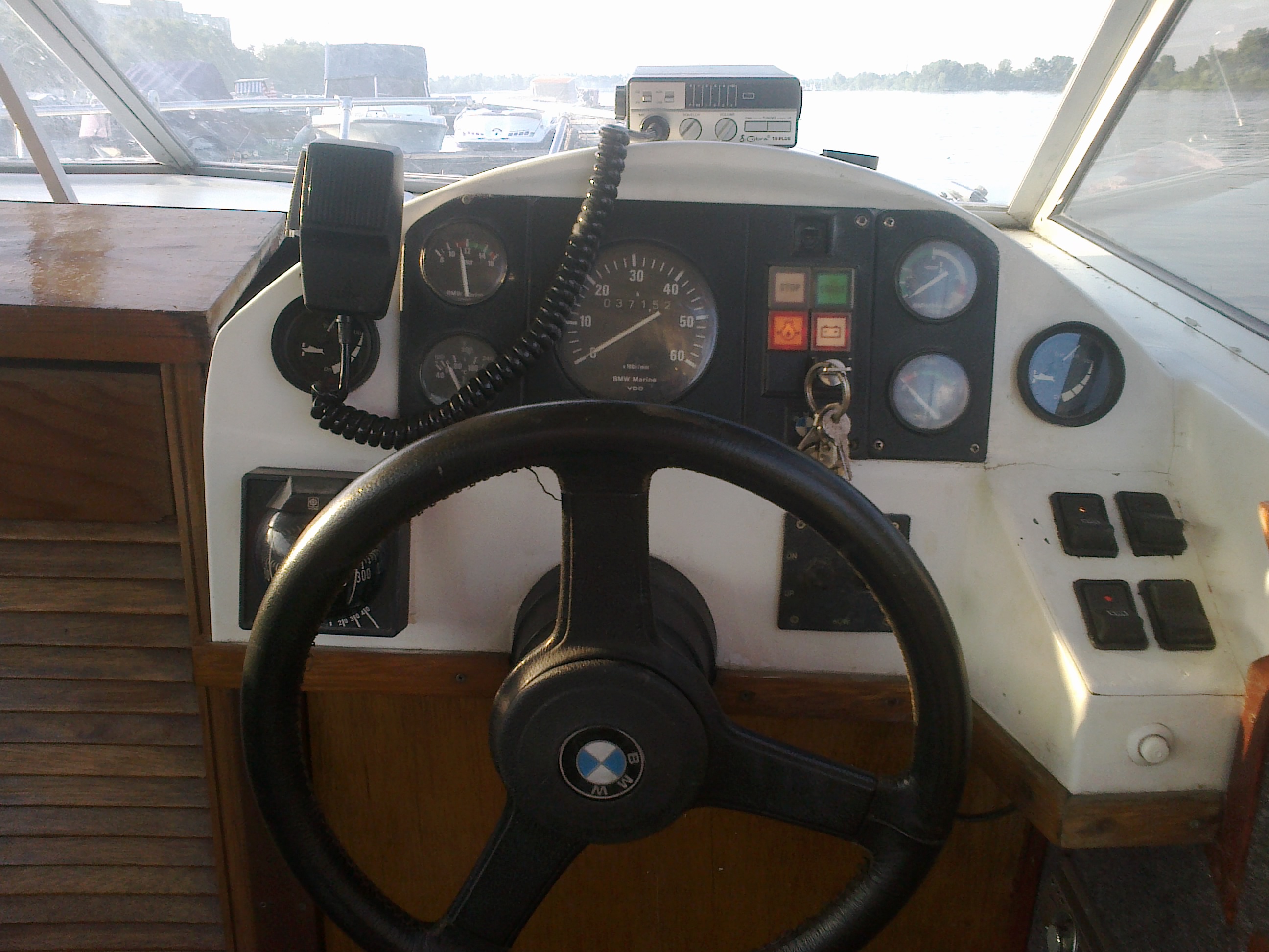 Мой сосед к стати, познакомились, я спросил что за мотор, говорит бмв, посмотрел через борт - да, обычный М-20, обратил внимание на зашарпанный корпус восьмидесятых годов, подумал что вкрячили автомотор в доходяжный корпус, ну то и ладно, тем более бмвешный шильдик на колонке смотрелся точно как "колхоз". НО,.. но потом, позже, присмотревшись ..... фото в студии