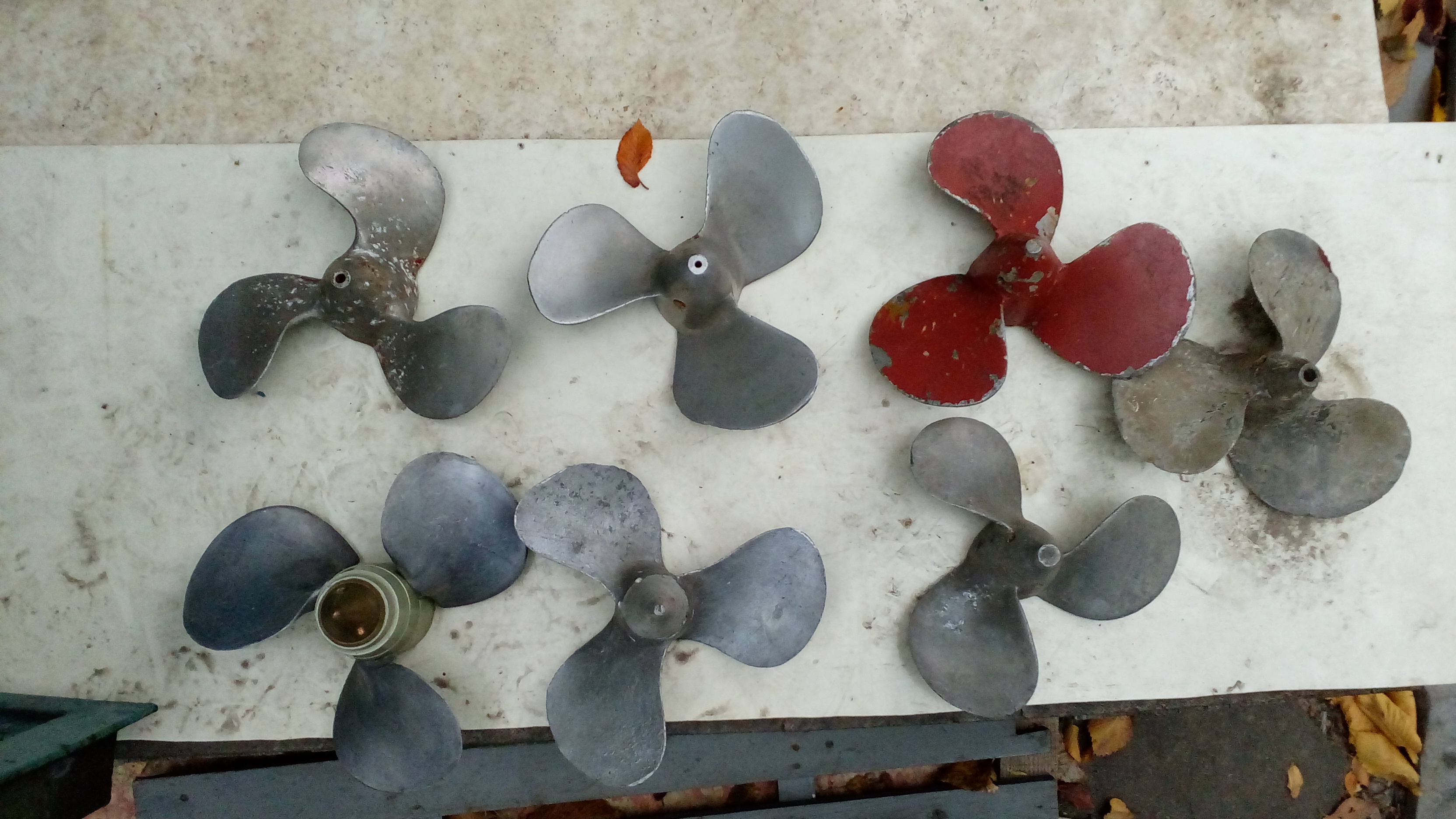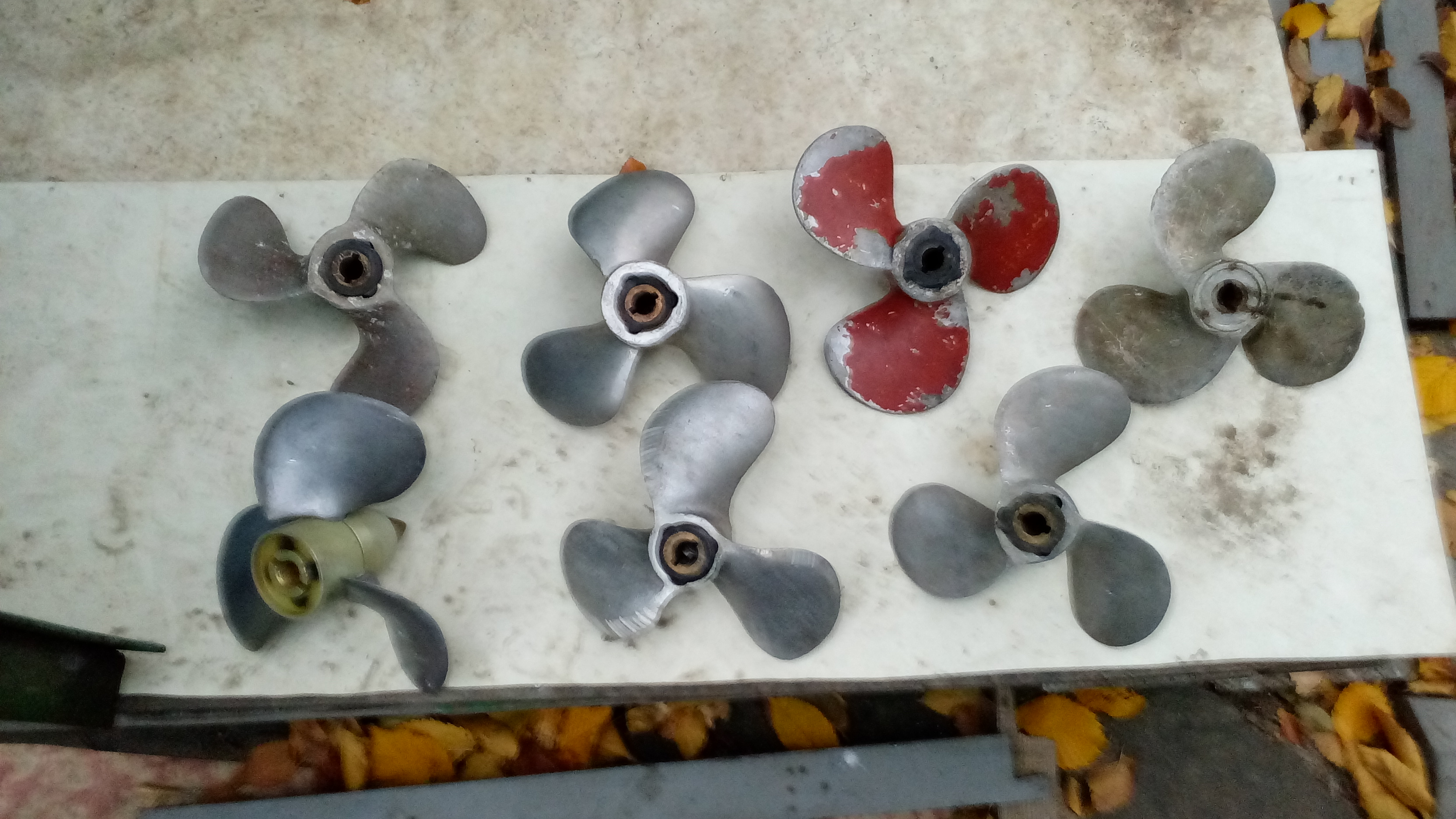 На фото есть ВРШ "ЕНИСЕЙ" хороший винт,есть чашка/свинное ухо шаг может быть как 240,так и 264 надо мерять и вроде есть винт с шагом 280,а так же подрезанный штатный.