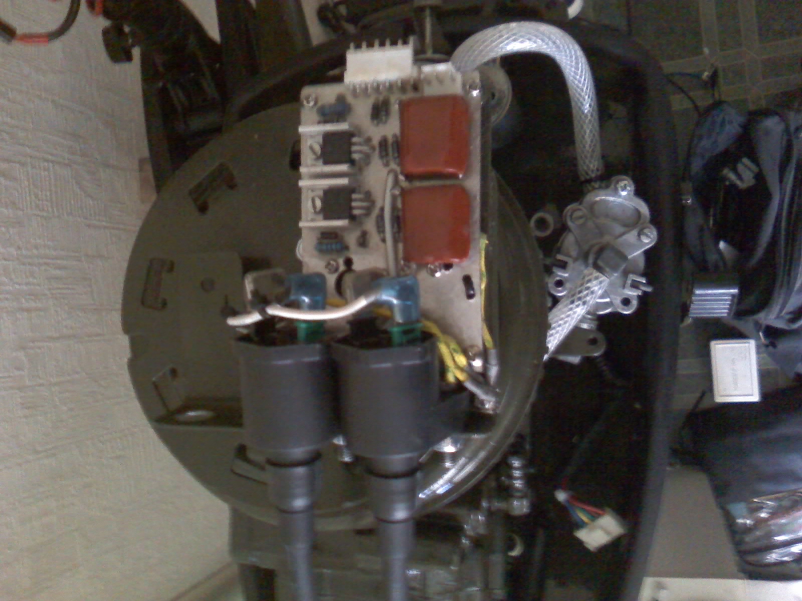 Вот на этой фотке видно. На дюралевой пластине (шасси), с загнутым краем, собран коммутатор. На загнутом крае крепятся катушки, и есть две дырки под резьбу свечи, такой себе свечкодержатель для проверки искры, продувки цилиндров (запасные можно хранить). На основной плоскости привинчена плата. Это шасси крепится двемя винтами вставки продувки к двигателю (т.е. масса).