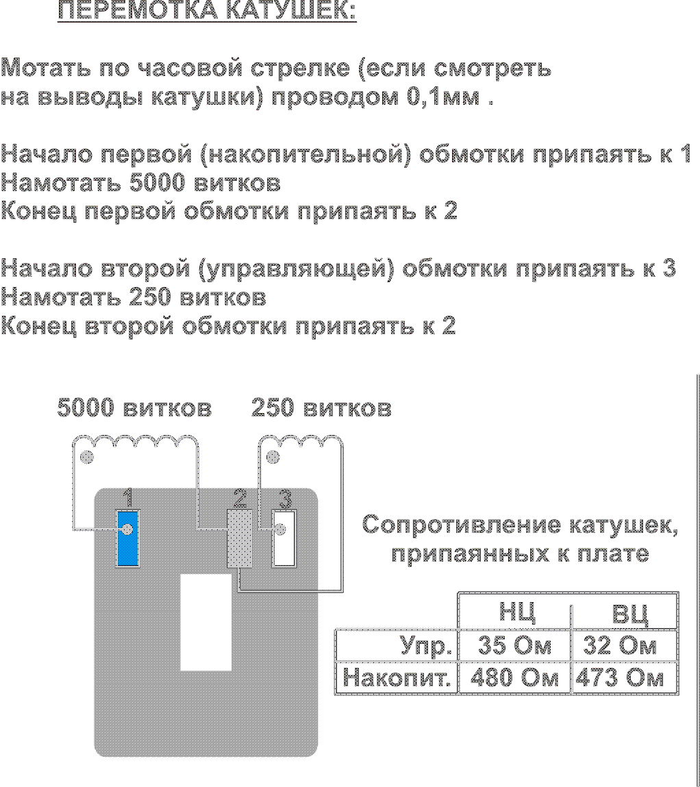 Тоже видел эту табличку. Но сопротивление накопительной у меня получилось ~800 Ом, проводом 0,1, при 5200 витков. Управляющая как в таблице.
