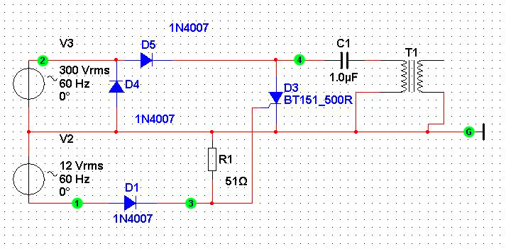 Слева на схеме - два генератора 300 и 12 вольтов синусоидального сигнала (имитируют катухи - накопительная и управляющая соотв.). Управляющая пущена в противофазе накопительной для симуляции ее противоположного расположения. Угол "холостого" пролета маховика смоделировать мне пока не удалось, но это не принципиально, все хорошо и так видно, нужно иметь ввиду, что между полными фазами есть "холостой" интервал времени, в который сигнал не формируется.