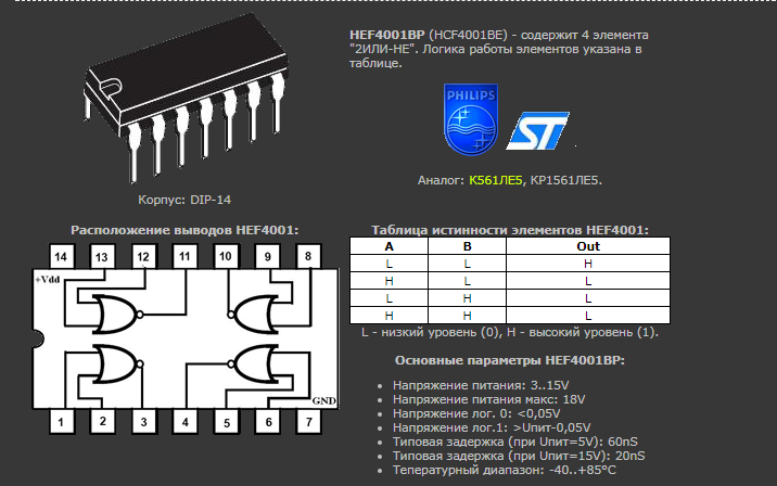 К561ЛЕ5= HEF4001BP, HCF4001BE, CD4001A.