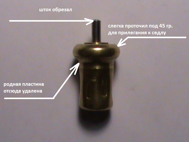 Наконец-то сегодня удалось более-менее нормально провести испытания. Пришлось испробовать различные варианты формы седла клапана. Дело в том, что поначалу происходило нехорошее явление: при подхватывании песка, что рано или поздно неизбежно, и закрытии термостата при снижении нагрузки, клапан упирался в песчинки. Вода при этом вода не перекрывалась и двигатель на малом и даже выше оставался холодным. Правда при значительном увеличении нагрузки термостат приоткроется и мусор пролетит. Теперь сделал седло с острой кромкой, таким образом при попадании песчинок и одновременном закрытии клапана, они останутся по ту или другую сторону кромки. Сейчас временно установлен второй термометр для одновременного контроля температуры поверхности головки блока и выходного канала. Двигатель сегодня разгонял до 4200rpm, температура в канале 65-70 гр. при любых условиях, за исключением малых в нейтрали: 60гр. Видимо дренажные отверстия великоваты, но в общем пока нормально Вот только возникли сомнения, не слишком ли горячий термостат. Порылся в инете, так на мерках, ямахах, хондах ставят в основном на 60гр. На некоторых только 72гр. У меня на 70гр. Завтра продолжу испытания, по тихой погоде сниму видео, в ближайшие дни сделаю чертежи, кому интересно и фото крупным планом отдельных деталей. Вот сделал чертежи. Двигатель с термостатом работает несколько помягче, а так же хороший старт с малого.Температура головки блока на номинальной нагрузке возросла в среднем на 20-25гр. по сравнению с работой без термостата при темп. забортной воды 15гр. В летнею жарищу эта разница будет меньше, где-то 10гр. Поздней осенью больше. Помпа работает с запасом! Получается, что двигатели мы всегда гоняли недогретыми. Этим и можно объяснить повышенный износ, особенно нижнего цилиндра, как более холодного. Ведь мотор и создавался когда-то для эксплуатации во всех климатических зонах и забортная вода в 30гр. и более не исключение и при этом он не должен заклинить от перегрева. При низких температурах воды мотор работать будет конечно же, но хуже и меньше, и сразу не заклинит.(производитель ведь лишний раз всегда перестраХУется). Расчитывал получить меньшие обороты холостого, но видимо золотниковый впуск с его обратным выбросом не обманешь. Но главная задача ставилась иная: получение оптимального теплового режима при любых нагрузках и окружающих температурах. И значит меньший расход горючки и повышение моторесурса и надёжности. Обнаружил некоторую инерционность системы: при достаточно резком увеличении газа темп. воды возрастает до 70-75гр. на 7-10 сек. но быстро приходит в норму: 65гр. Головка термостата используется на 70гр., но приоткрываться начинает при 63-67гр. Этот момент и надо "поймать" регулировочным винтом. Это делается просто: дуем в собранный термостат снизу, и одновременно закручиваем винт до момента начала открывания и чуть назад. Приоткрытие всего на 0,8-1,0мм обеспечивает полный проход воды. P.S. C пружиной есть некоторые вопросы. Родная с термостата ТС-108-03 слишком громоздкая. Я подобрал в первом попавшимся автомагазине, но не помню отчего. Покрасил грунтовкой, чтоб не ржавела, на сезон должно хватить.(родная из нержавейки) Востаннє редагував P_Petrovich: 13.05.2013 о 22:12. |