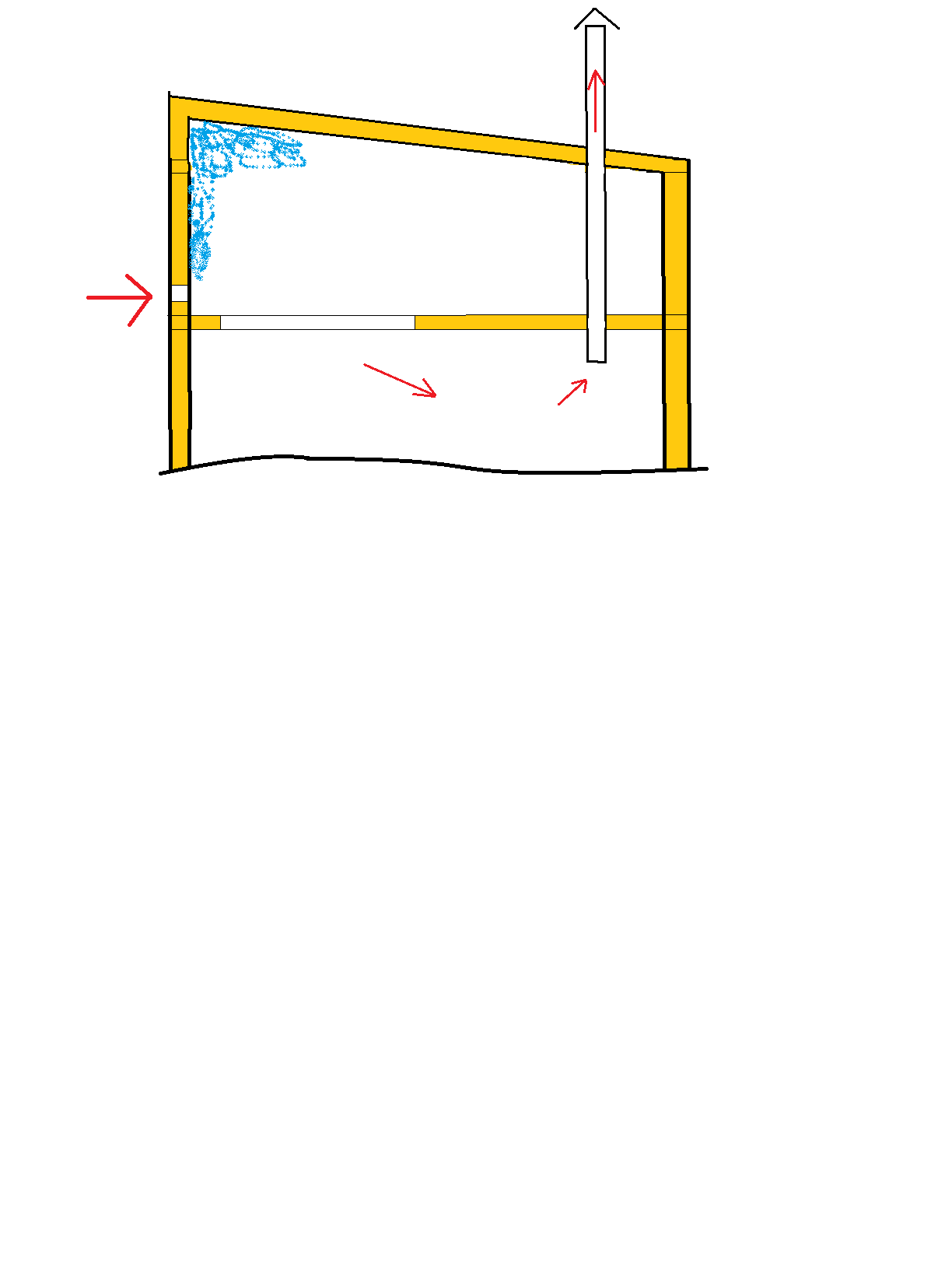 Так, то что не работает это и так понятно. Почему, что у меня не так? Значит так, приток сделан в воротах но со стороны трубы, труба идет с подвала (начало под потолком в подвале)на улицу и подымается на 2,5 метра в верх. Люк подвала открыт сейчас. Типа схемка