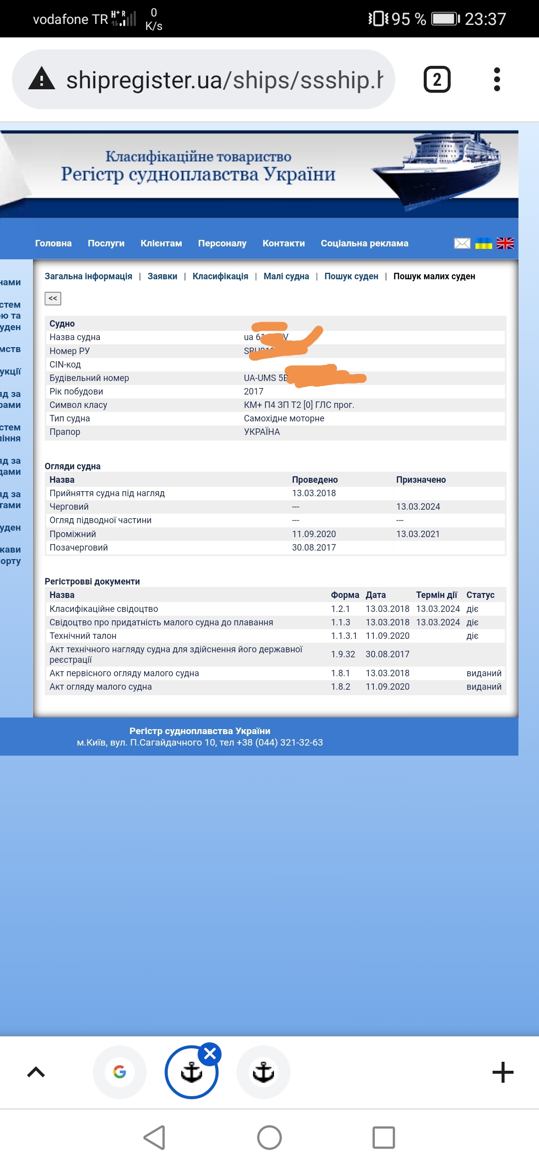 Фото для примера, что там можно увидеть. Я вводил номер лодки UA-XXXX и далее поиск, лодку находит, нажимаем на номер лодки и появляется вся, инфо