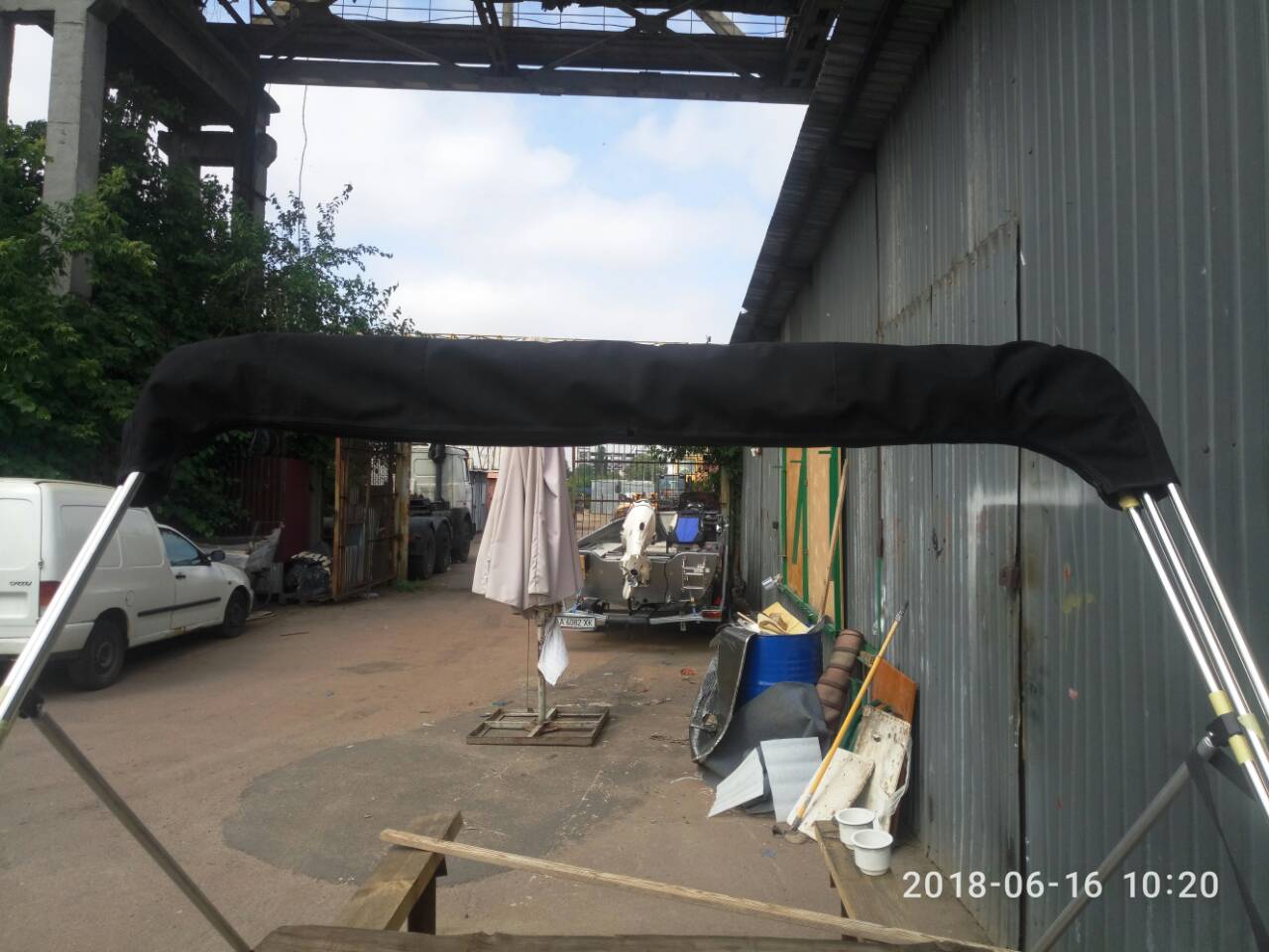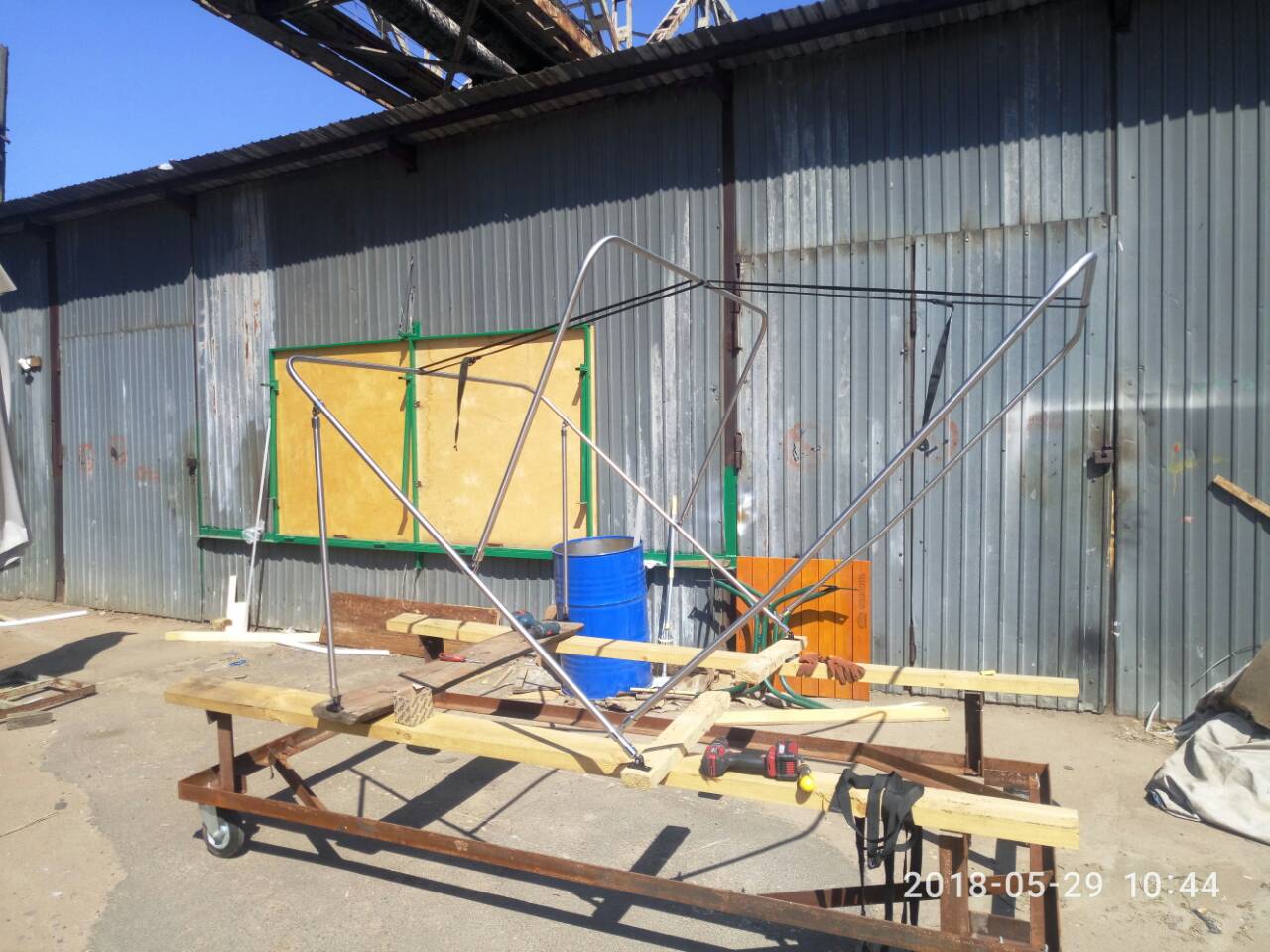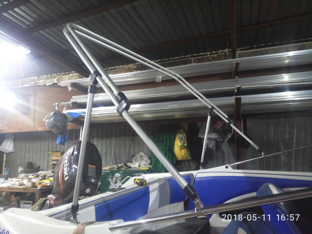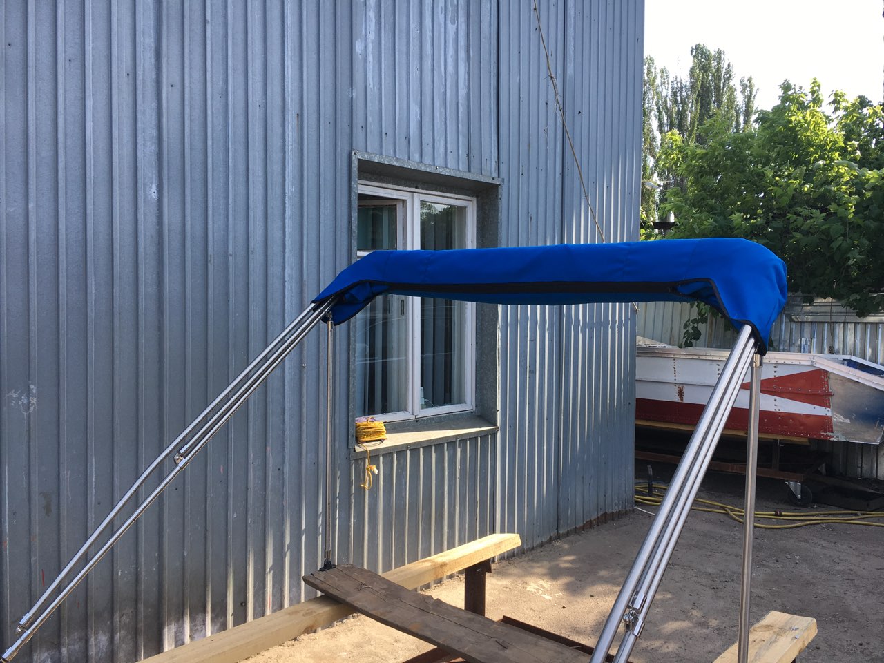 Вітаю водно-моторне братерство! Погнули дуги з нєржи, і зробили бімінітоп Антоновому другу. В дугах залишилось зробити ще два гіби по 15градусів і змінити на пристойну фурнітуру , але то в присутності клієнта. Все на фото Тканина Sambrella Молнії YKK Ще відзняв відео як варить наш новий зварювальник (аргонний напівавтомат) , приймаю замовлення по роботі.