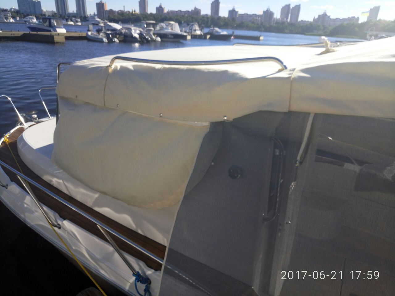 Хочу Вам показати одну з наших робіт. Тент з Яхтєнної тканини, москітна сітка по периметру палуби і штори на вікна по наружі. Бімінітоп по усій довжині, тим самим, закриває матраси від води, сонця і пилу.