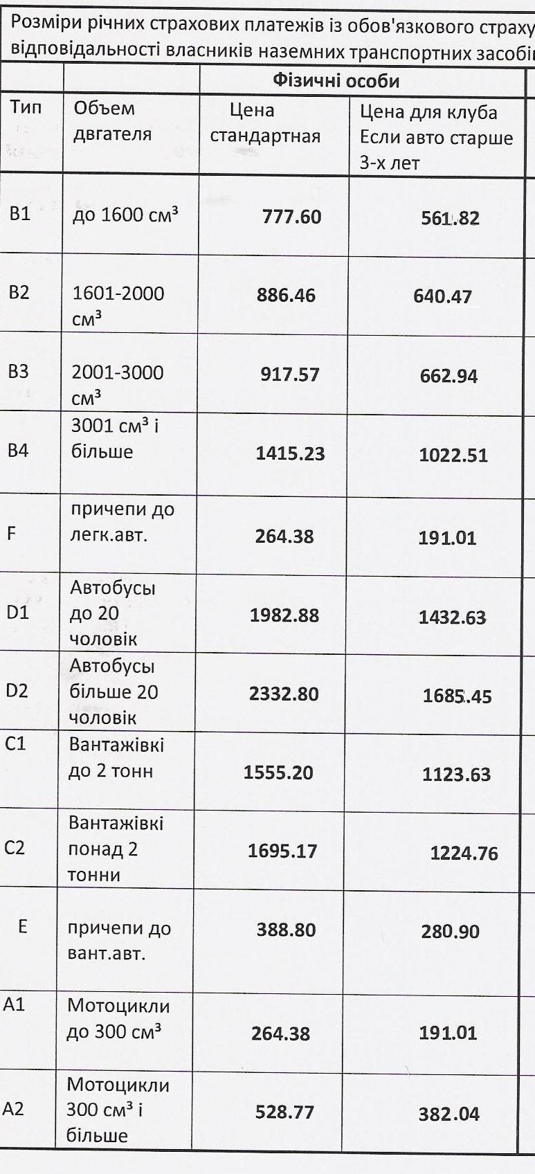 Условия для Т.С. 1) скидка бонусманус дается от возраста т.с. и безаварийности 0-20%. Если машина новая скидка 0% Если машине 1 год скидка 5% Если машине 2 года скидка 10% Если машине 3 года скидка15% Если машине 4 года и старше скидка20% 2) Скидка ВМК Фрегат 15% Приведу пару примеров. Тип В1 до 1600 см3 цена 1296 грн.00 коп машина старше 4 лет - 20% Скидка ВМК Фрегат - 15% ИТОГО: 1296,00 -20%= 1936,8-15%=881грн.28 коп Тип В4 от 3001 см.3 и выше цена 2358 грн.72 коп. машина старше 4 лет - 20% Скидка ВМК Фрегат - 15% Итого: 2358,72-20%=1886,98 - 15%1603грн.93 коп Ни Гвоздя ни жезла. |
