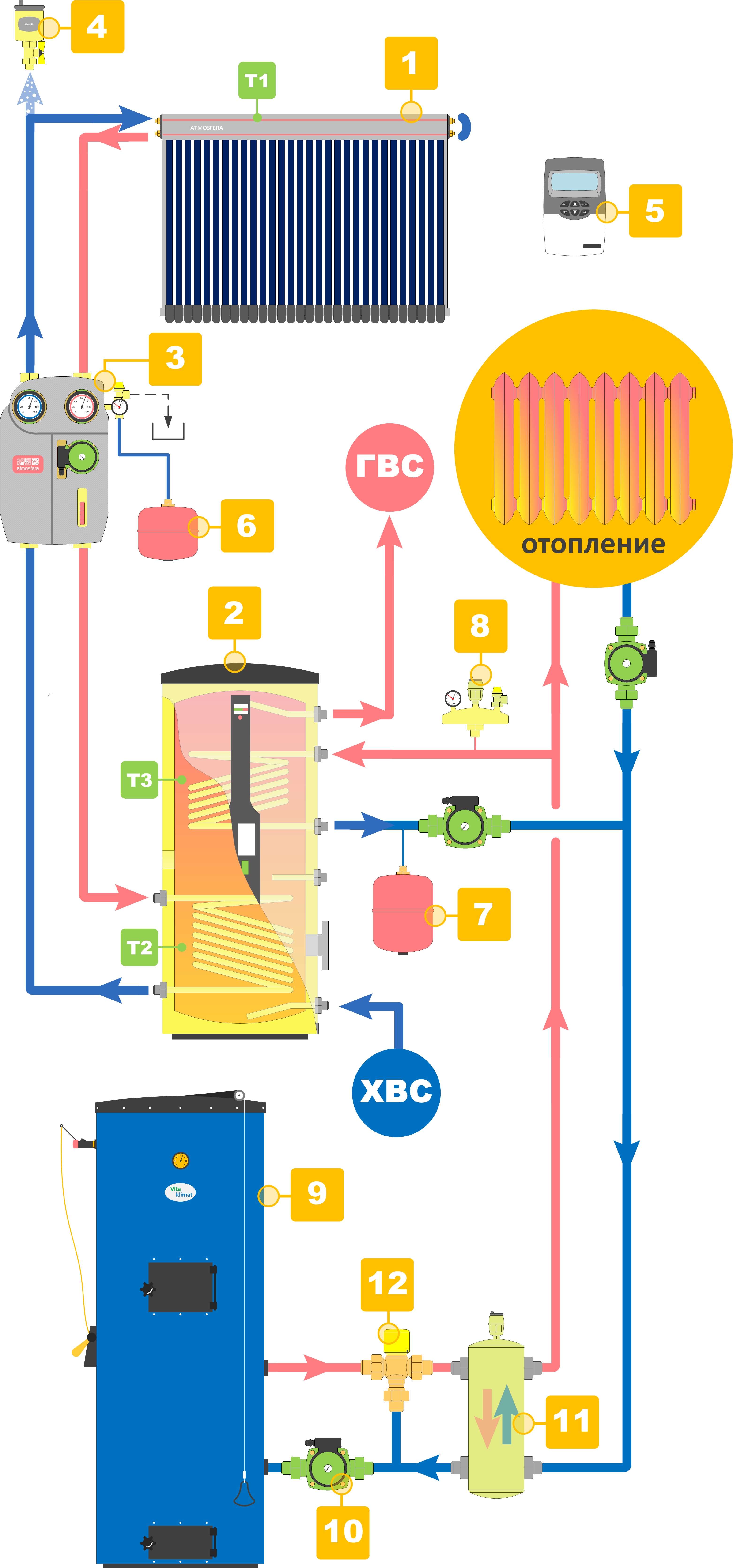 В итоге уже все работает как на рис 2. + газовый котел (включается автоматом, когда догорает твердое топливо)