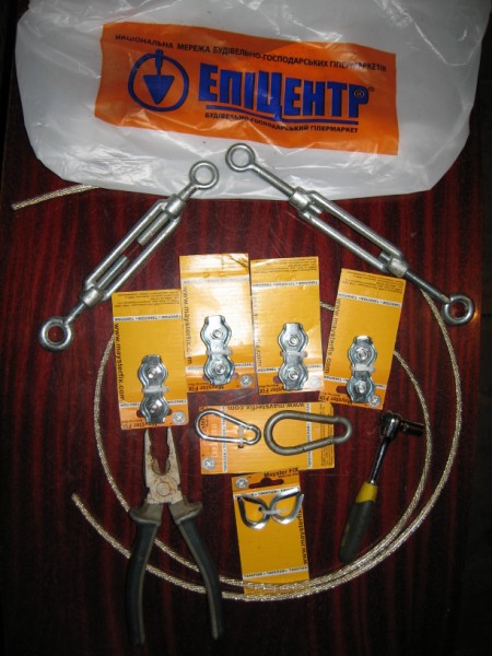 - Трос металлический в оплётке диаметром 6 мм, два куска по 1 метру;