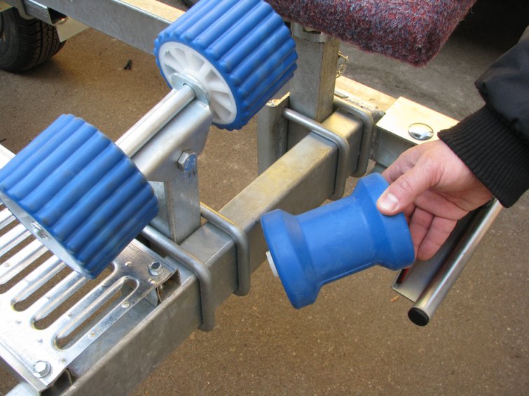 Ролики не резиновые, они из пластмассы , внутри труба оцинкованная и подшипники. Они реально прочные и выдерживают куда большие нагрузки,чем П4. При транспортировке можно поднять лодку ложементами как в классическом лафете, а можно оставить контакт киля с роликами и при транспортировке просто распределив нагрузку на ролики и регулируемые домкратами ложементы. Ролики имеют реально большую регулировку по высоте установки. При спуске просто чуть опускаем ложементы и лодка уже по роликам катается. |