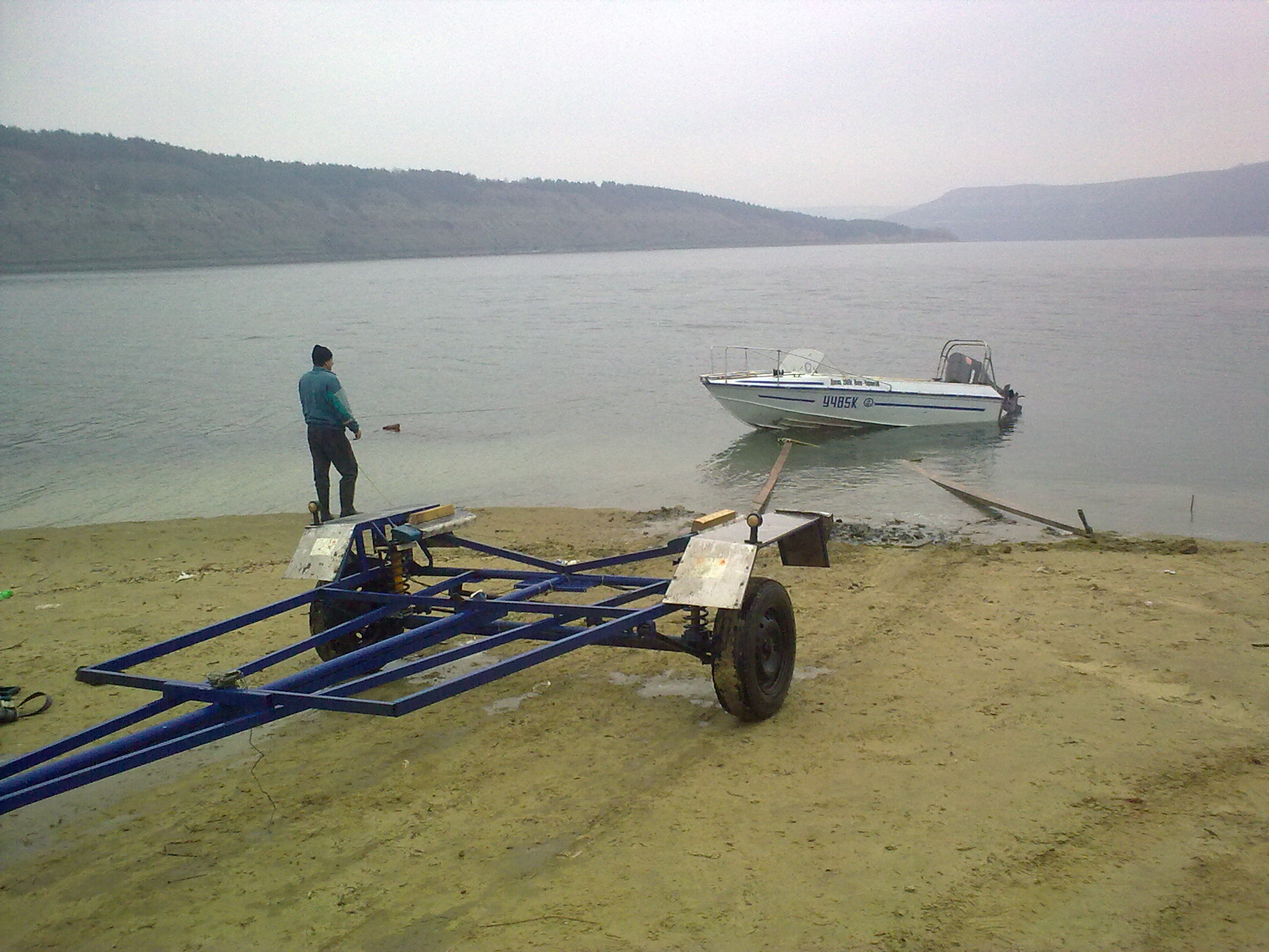 Лодка лежит на ложиментах, корма желательно что бы не выступала. Раму лафета делай под длину лодки (совколодки в основном4,2-4,7м ). делай 4.7м сможешь возить практически все. Дышло делай с запасом, как все соберешь лишнее отрежешь и прикрутишь сцепное. Только обрезай с запасом, ну что бы задняя ляда или распашенка практически любого авто открывалась без необходимости отстегивания лафета с фаркопа. Стремись лодку как можно ниже к земле опустить (гнутые поперечены, ширина рамы), чем ниже лодка, тем меньше в воду заежать. Если будешь делать на торссионной оси обрати внимание что по мимо обыкновенных есть ступицы водонипроницаемые. Из необходимых регулировок не забудь, про регуируемую по дышлу стойку лебедки и регулируемый подрамник под ось (развесовку под любой комплект будет проще отрегулировать). "ворота" и трапик не забудь - очень удобно