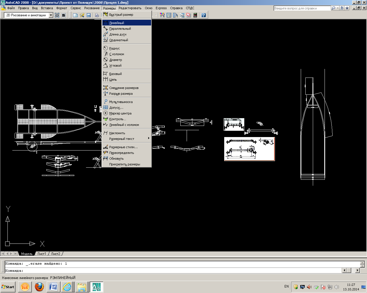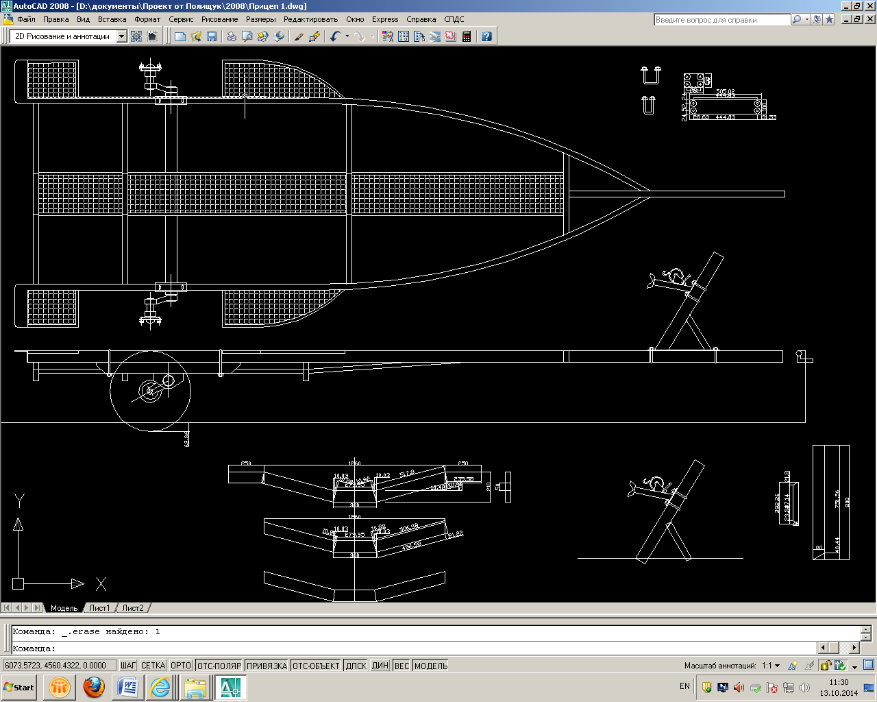 Ща повествовать я буду Итак, хотя подобные темы уже есть, но я к вопросу создания прицепа для лодки я решил подойти со всей пролетарской ненавистью к рыбалке и всему, что с ней связанно. Объясняю почему: сам я не рыбак (за всю жизнь был на рыбалке, ну максимум 10 раз) и считаю, что рыбалка это одно из самых глупых и бестолковых занятий, которая только забирает время (простите меня рыбаки и папа), но вот мой отец просто заядлый рыбак и неделя прожитая без пары-тройки выходов на воду - это для него бесполезно прожитое время. Было у моего отца несчетное количество лодок и моторов, сколько точно, наверное, даже он не сможет ответить, и каждый раз то лодку воровали, если она хранилась на берегу, то резиновые просто портились от времени, то еще какая фигня случалась, и вот ему подарили пластиковую лодку 4,5 м и вдохновленный обновкой папа взял мой прицеп (стандартный грузовой, по-моему «Пчелка» называется) погрузил на него лодку и поехал на рыбалку… Ну, что случилось дальше некоторые уже поняли, лодка осталась целая, но вот прицеп просто, извините в г…но, борта погнул, порвал, в общем прицепу – вафли. Отремонтировал я его, через некоторое время батя опять решил повторить подвиг и второй раз результат тот-же, правда с меньшими последствиями. Психонув и немного поворчав на прародителя, я решил, что надо заиметь прицеп для лодки, дабы не портить отношения с родственником, но тут возникла проблема: я бы мог купить его, тем более что цена вполне приемлемая по старым ценам (когда я начинал это неблагодарное дело) 8-11т. грн, но об этом сразу узнала бы моя вторая половинка, потому, что скрыть исчезновение большей части моего месячного заработка было бы просто невозможно и я на какое-то время я лишился покоя в семье и качественного и регулярного его самого =), поэтому я решил сделать прицеп сам, (еще из простого любопытства). Поскольку мое первое образование техническое и помня, что настоящий инженер должен уметь владеть инженерной графикой первое с чего я начал – это проект, точнее чертеж, не вдаваясь в тонкости ГОСТов, освоив Автокад за пару дней (отдельное спасибо разработчикам и особенно тем нашим соотечественникам которые умудрились сделать дорогущую програмулину бесплатной ))))))))) ) я навоял то, что хочу. Ниже в приложенном файле сам чертеж плюс сделаю пару принтскринов, для тех кому лень скачивать Автокад, сразу отмечу, что размеров на чертеже специально не ставил потому, что чертеж сделан в натуральную величину и любой интересующий размер Вы можете узнать сами (далее описание только для чайников ): 1. Скачиваете Автокад версией не старше 2008 года, кто не найдет - пишите скину ссылку када который не нужно устанавливать достаточно просто открыть файл. 2. Открываете кад, далее в вкладке файл нажимаете «открыть» выбираете нужный файл. 3. Для того чтоб узнать размер нажимаете вкладку размер и выбираете линейный (если деталь в вертикальном или горизонтальном положении на чертеже) или параллельный если деталь находится под углом (крутить колесиком мыши - масштаб). 4. Далее наводите крестиком на точку нажимаете на левую кнопку мыши и на вторую точку и нажимаете второй раз на левую кнопку. Далее выводите стрелки размера на некоторое расстояние и нажимаете третий раз и вуаля видите размер с точностью до сотых долей миллиметра. Если размеры в которых начерчен прицеп вам 