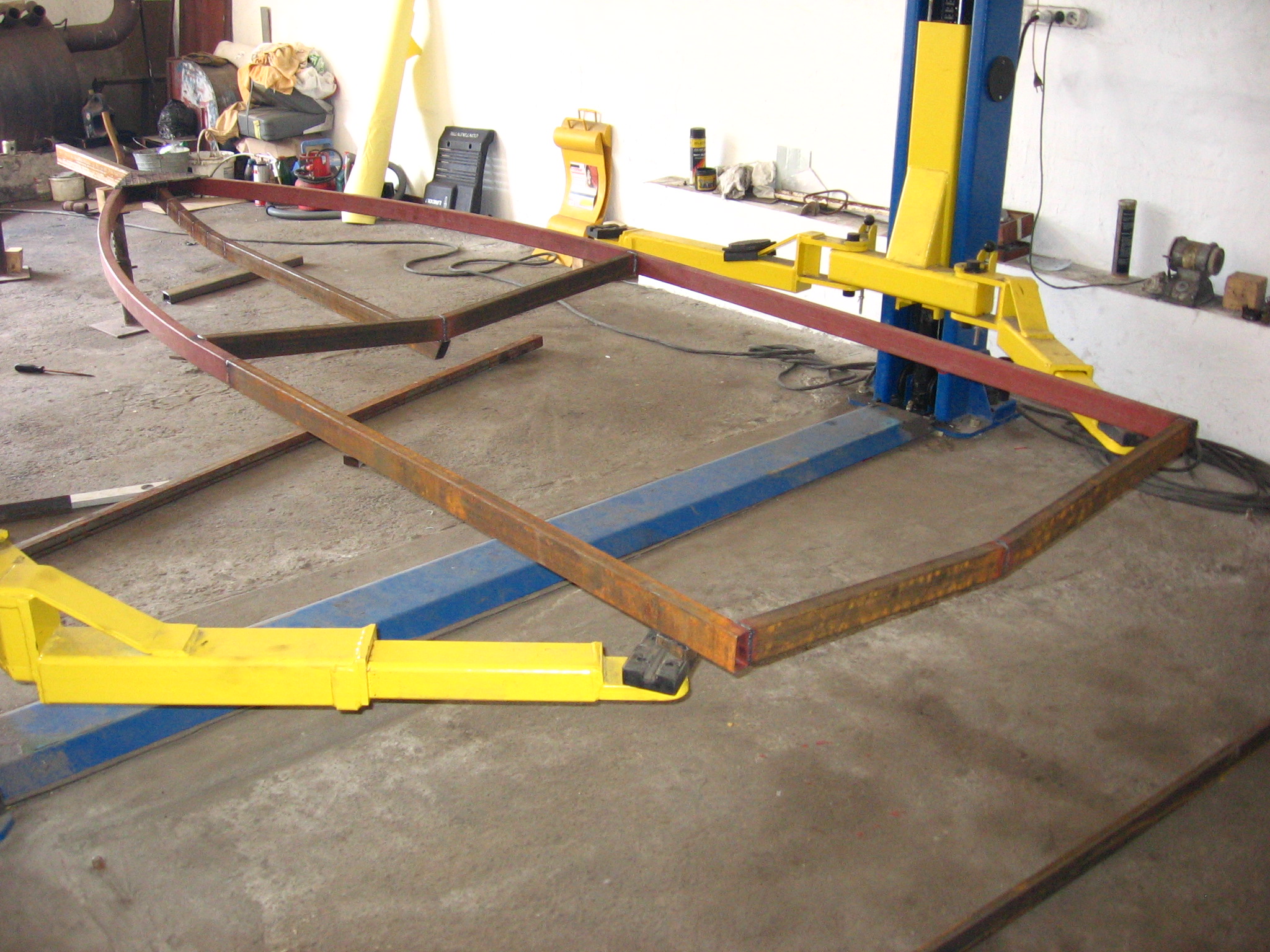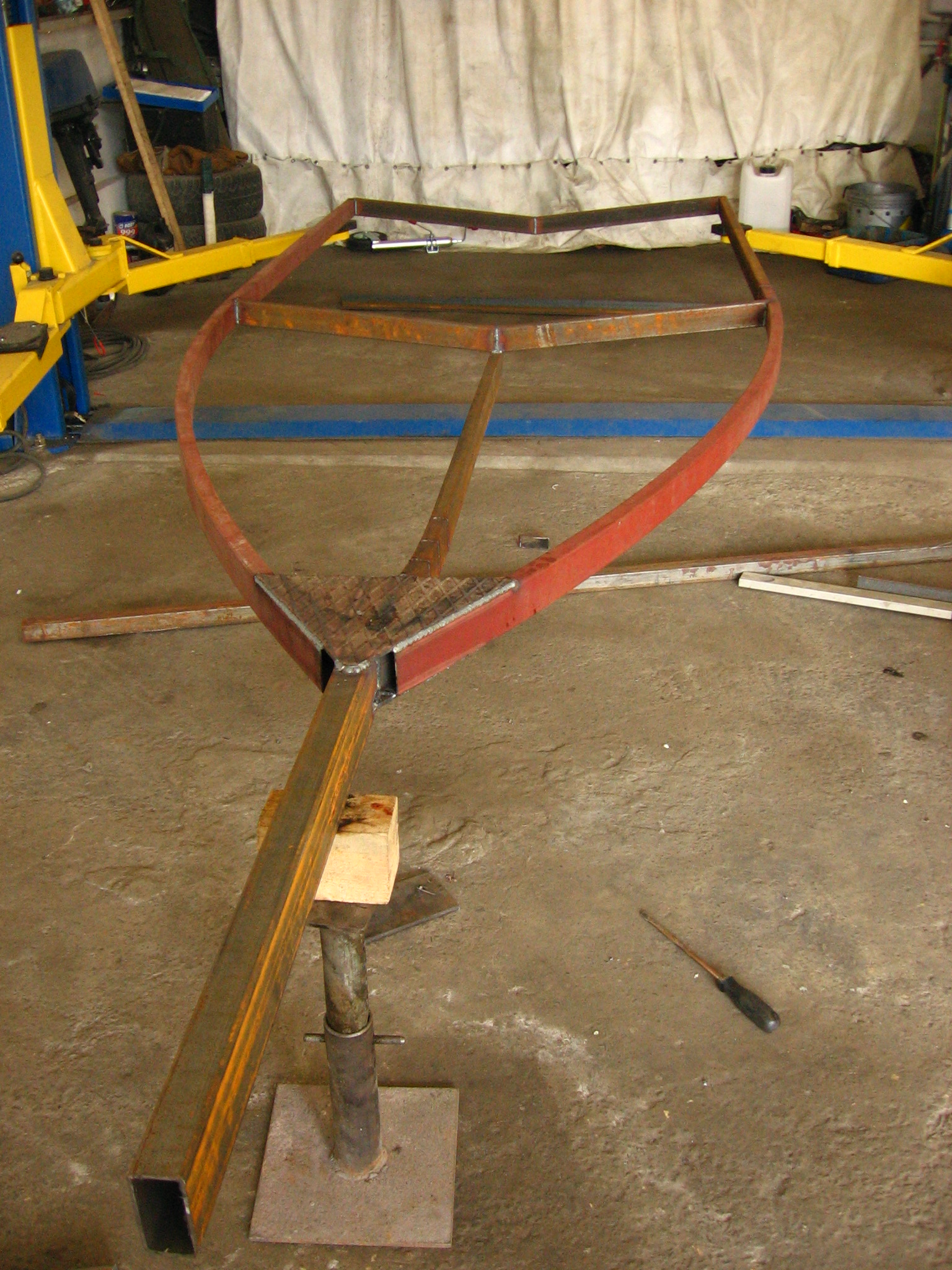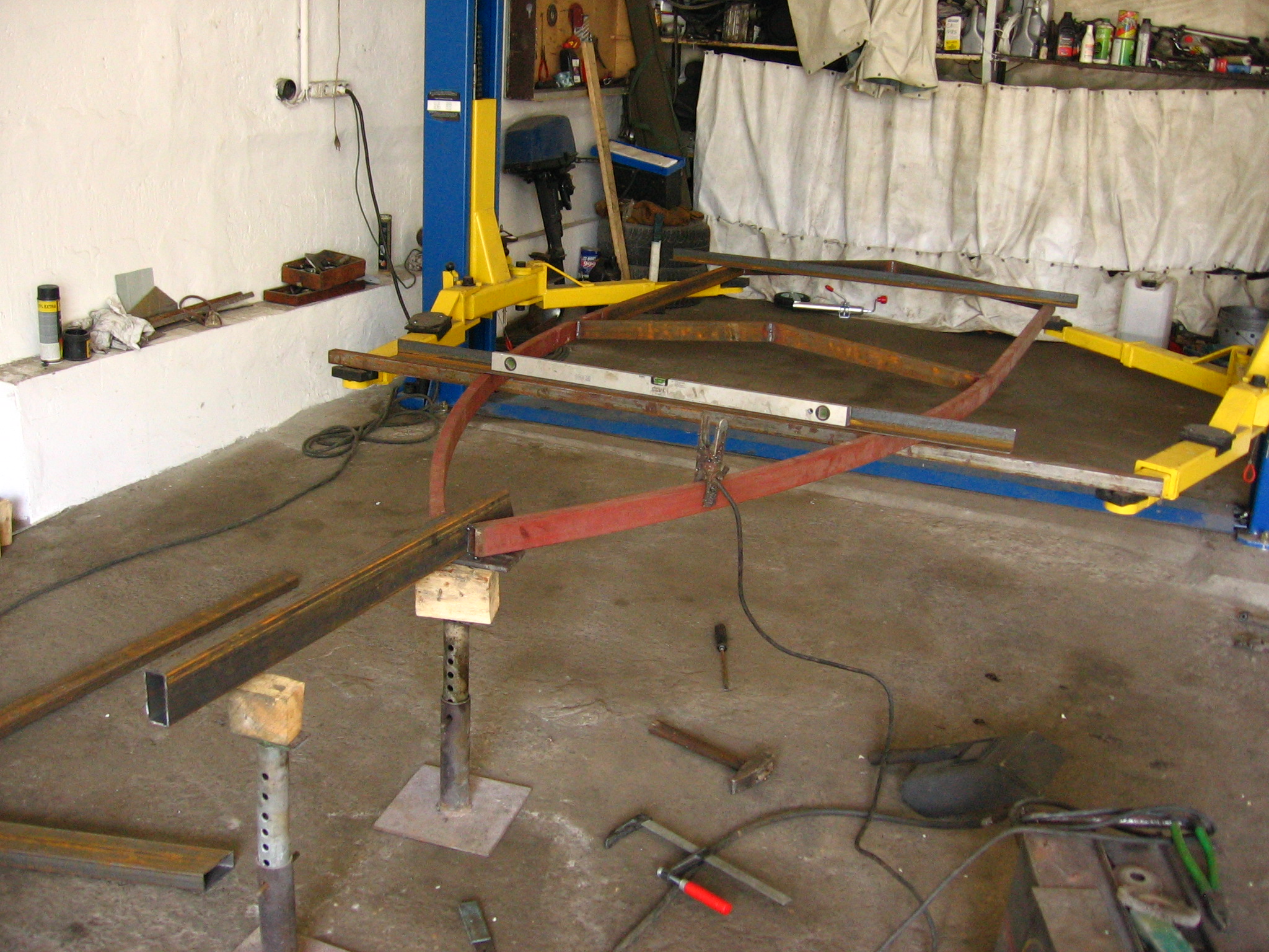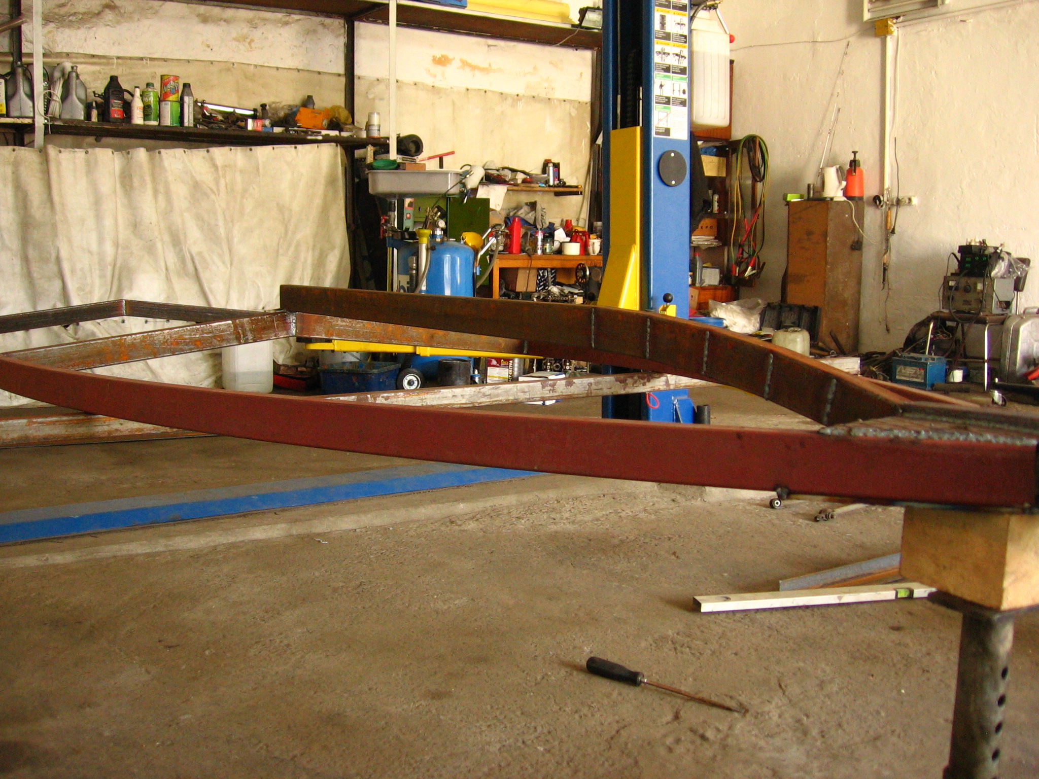 Для желающих изготовить лафет самостоятельно выкладываю краткий отчет и приблизительную смету сего мероприятия. Лафет делался под лодку Лира-420 (4,2 х 1,7 м общий вес с мотором и начинкой до 450 кг). Для изготовления рамы был закуплен профиль 80х40 в кол. 15 пог.м и стандартный набор комплектующих с торсионом АЛ-КО. Первый день ушел на раскрой профиля и сварку основной рамы. На второй день варили носоприемник с основой под лебедку, заднюю балку с креплениями под фонари и "рога" (ворота). Вечером все это железо обработали и погрунтовали. На третий день все покрасили. Четвертый и пятый день ушли на сборку, установку и подключение светотехники, изготовление и установку ложементов и конечную регулировку с лодкой.
