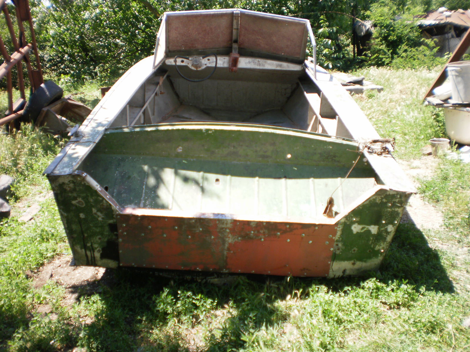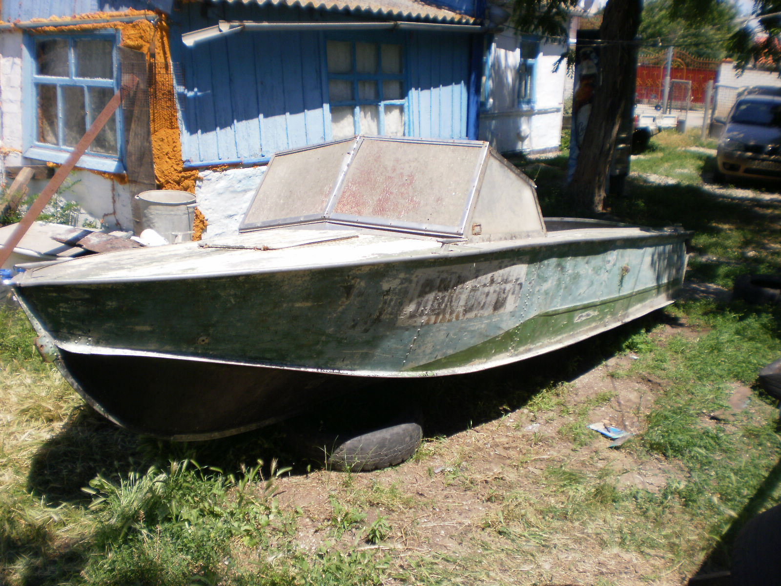 Корпус тонул?(нет?, а чего стекла такие, пролили герметик внутри?) Латка на транце. Транец если, я не ошибаюсь вытяжными клепаный (видно "дюрочки")! Давай больше фото..