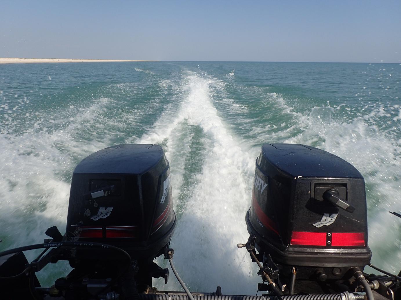 Все это развлечение с разгрузкой топлива, толканием лодки, погрузкой шмоток и прочим заняло примерно полтора часа времени, так что в пролив на моторах мы вышли где-то в 21.30, когда уже стемнело, а на море появились волны. Выходить через мелкую промоину в море с волнами в темноте вообще хреновое удовольствие. Нас подбрасывало набегающими волнами и с размаху ударяло перьями моторов в песок. В какой-то момент мы перешли на мелководный режим. Идти на нем даже по ровной воде не очень, а против набегающей встречной волны вообще треш. Еще 10 минут у нас ушло на то, чтобы пройти несчастные 100 метров пролива.