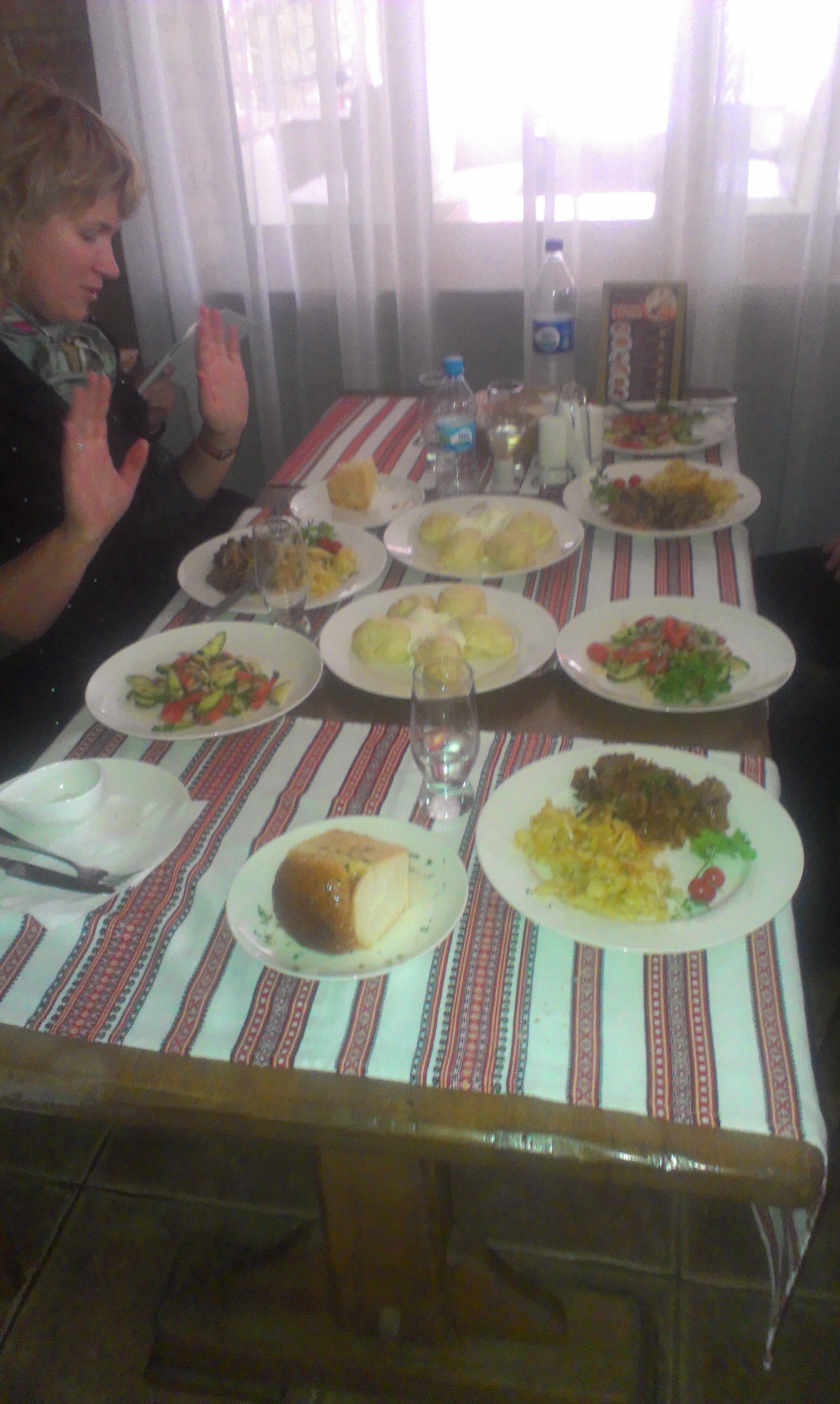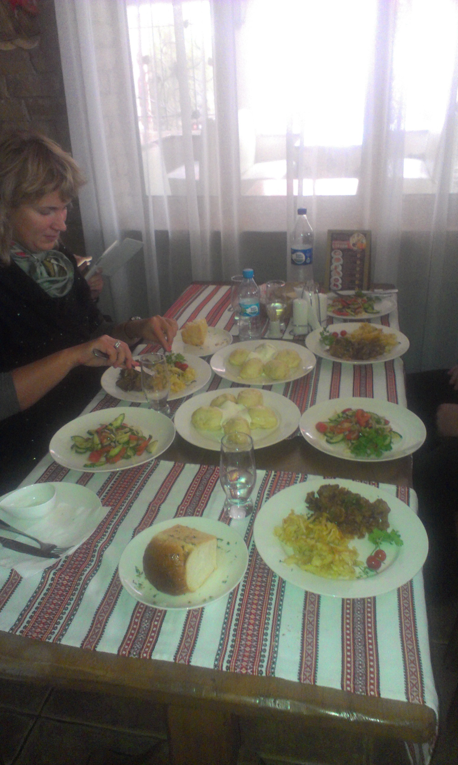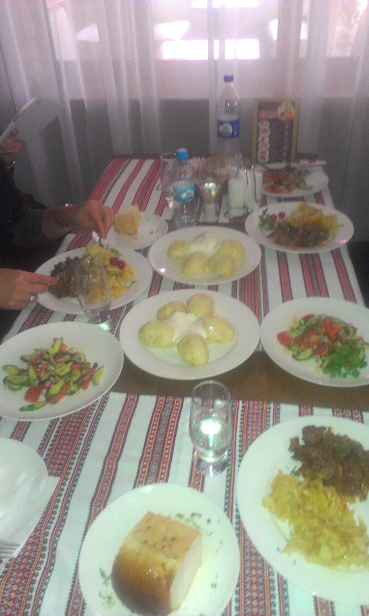 Ужин в ресторане на троих с выпивоном 400-500гривен. Обед на четверых (вареники это уже после борща с пампушками) 350гривен.