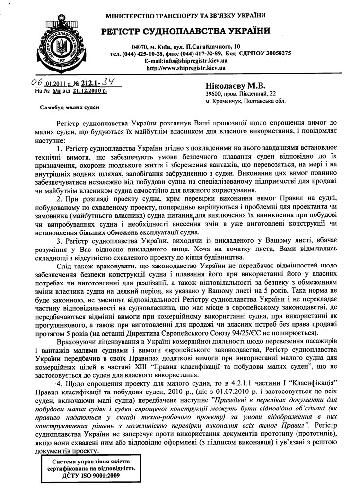 Надо разбиратся с минтрансом, который путает свои и чужие бараны. Не могу пока точно сформулировать, но в общих чертах мысль такая: есть Конституция, Закон Украины о собственности, Гражданский кодекс, которые регилируют права и обязанности собственника пользующегося своей собственностью (лодкой с мотором) и законные вмешательства государства в такие права собственника, с какими-то обоснованными разумными ограничениями. Общие сылки Регистра на Правила и т.п., что все нельзя потому-что нельзя -- неубедительны.