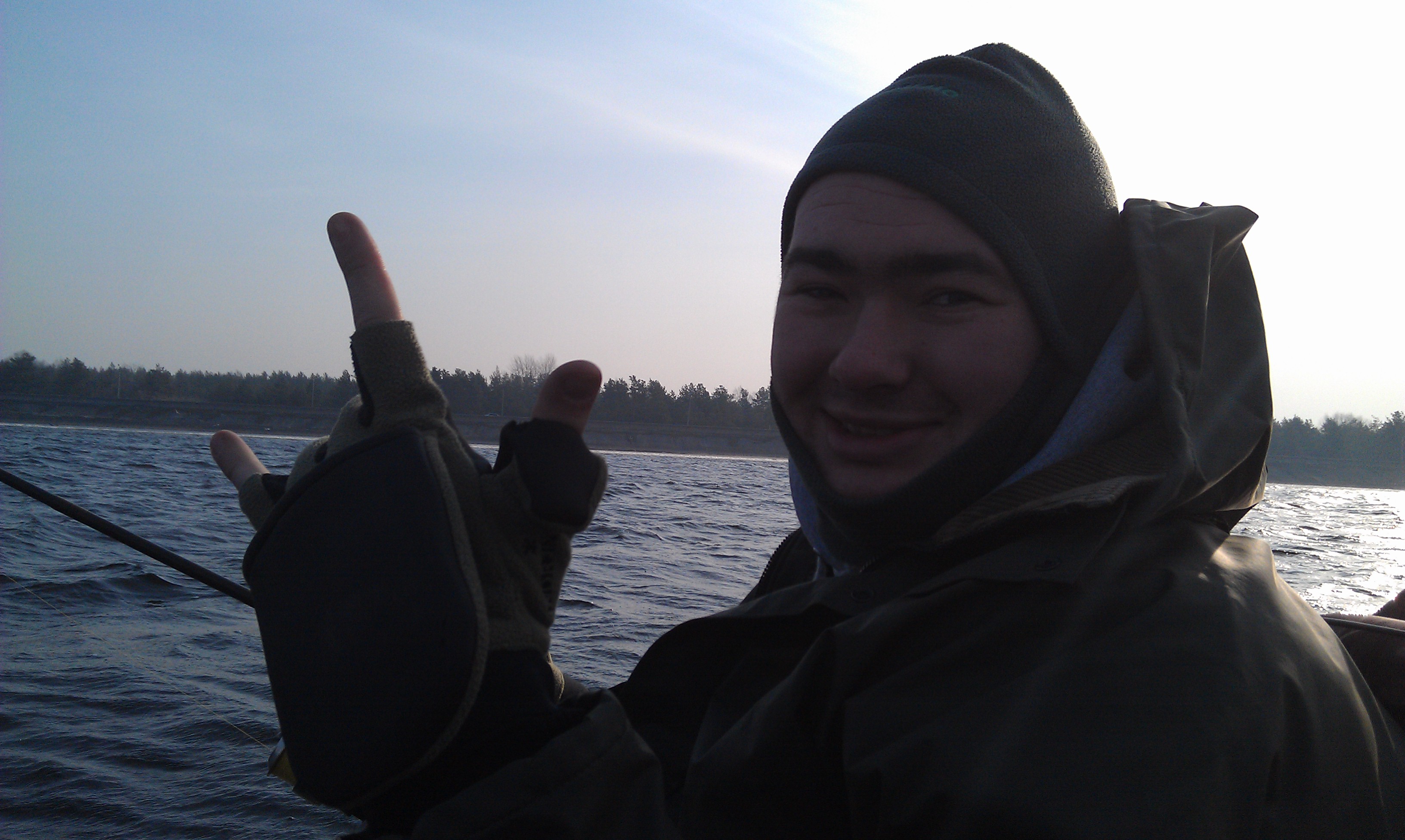 У чуваков там своя атмосфэра. Все в плакатах "рейдерский захват яхтклуба" и все такое. В общем своя революция, своя самооборона. Но на порыбачить сброситься пустили без особых приключений. Сначала пробовали по стороне левого берега рыбу искать - нифига. А потом вспомнили, ёпть, так можно же и к Межгирью теперь. В принципе ветерочек был, но волнушка такая, лайт. Неспешно, под рюманечку, дошли до бывшей Яныка заимки. Там по эху все было уже куда интересней. И, кстати, лодочек пару тоже там тусовалось. К паре подходили - говорят фонарь, нет рыбы. Мы не поверили ![]() В общем и рыбу видели, и инспектора к нам приезжали. Бдят, что в общем то не может не радовать. Оказалось, что территория напротив "базы" - это тоже кусок зимовальной ямы. Чемно заплатили причитающийся штраф за "в неположенном месте", размер судаков особых претензий не выявил и у нас его не конфисковывали. Милые люди. Поболтали чуть. Запрет , говорят, ориентировочно ждем с 1 апреля. Приказ уже якобы готовят. В час решили двигать в сторону дома. А ветерок все усиливается. Шли уже по барашкам, раз носом черпанули, раз на боковой волне очень ссыкотный крен поймал. Рус мокрый как огурец на задней лавке сидел, говорит аж до трусов промок. Пока поднялись - на море уже полный гондурас. Вовремя смылись. Вода очень низкая, рыба на эхе есть, а по факту вся мегапассивная (впрочем погода меняется кроме всего прочего). Ну и видели дядек сумашеччих на виндсерфе (не сфоткал, в руль ехал вцепимшись, а они вокруг нас по волнам скакали) и чувака на кайте (этого с берега уже сфоткал). Вот где психи ![]() В любом случае распечатались по жидкой воде. Все довольны ![]()