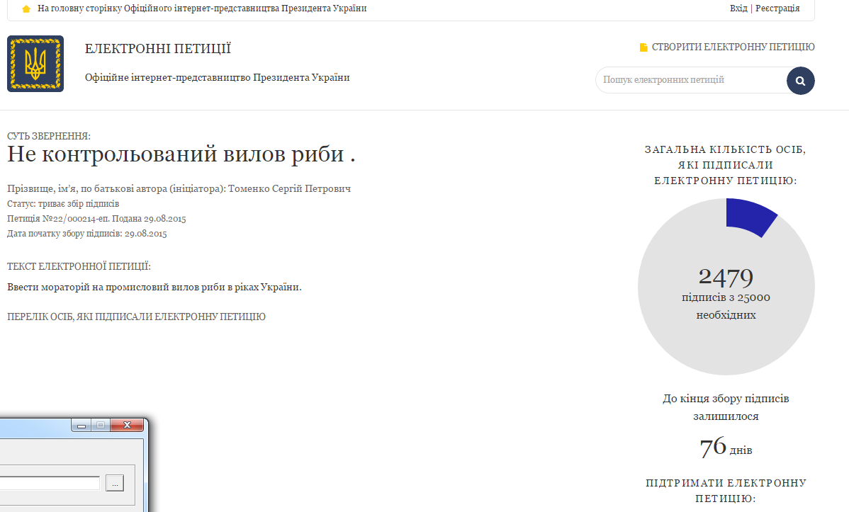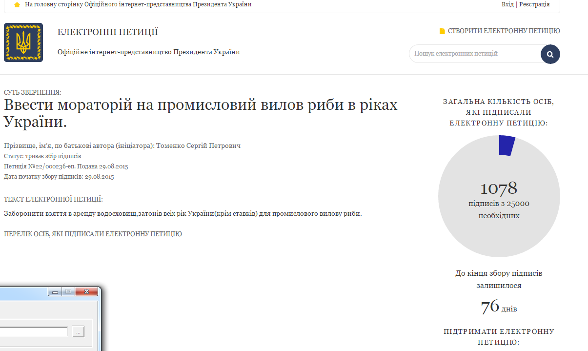 А Шо происходит? Хде делась - петиция "Заборонити взяття в аренду водосховищ,затонів всіх рік України(крім ів) для промислового вилову риби"