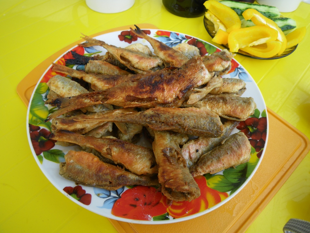 ,Хе-е из судака....,до следующего вечера подмели... На темной тарелочке рапан в маринаде перед сковородочкой...без них в Крыму НИКАК...))).