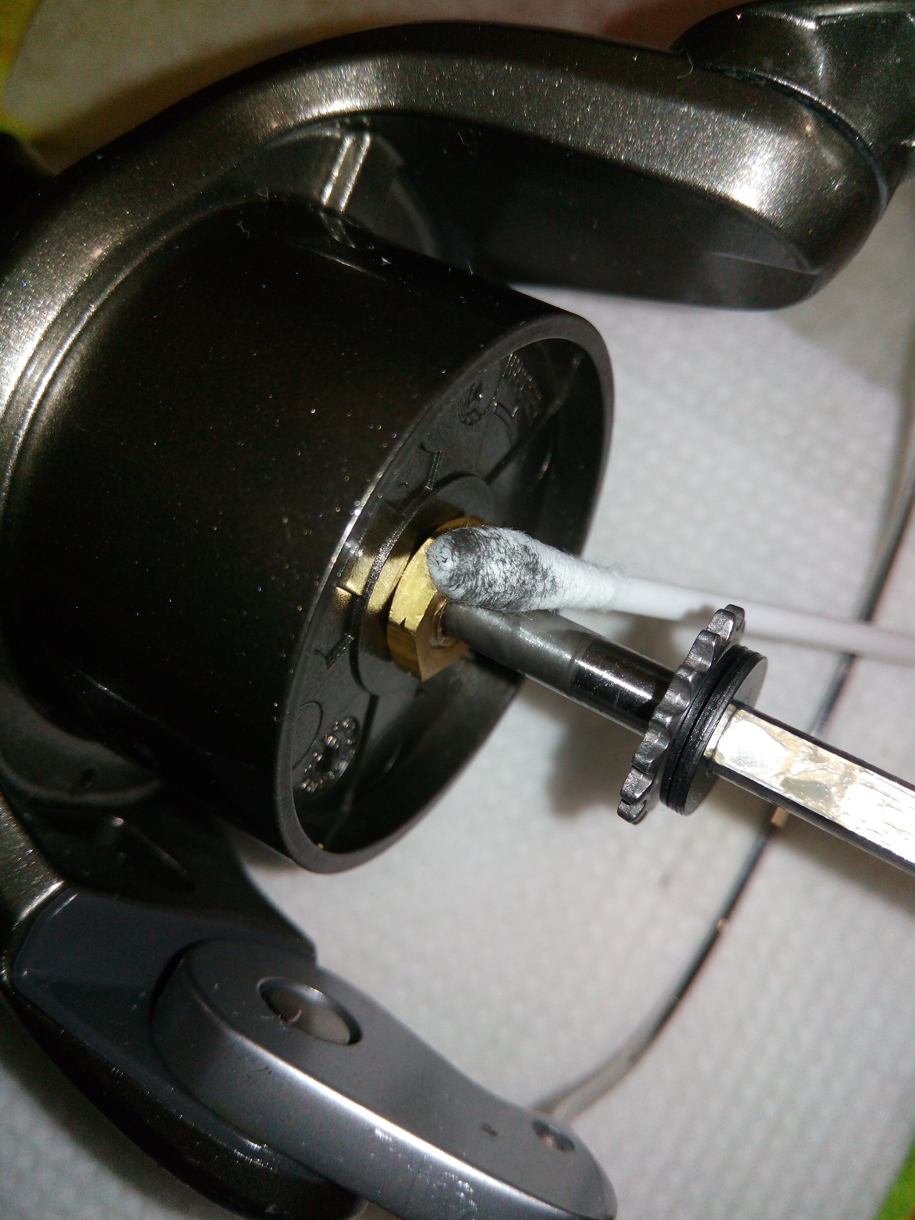 Катушка RYOBI Ecusima 4000Vi. Шумный, шарудящий ход характерный для данной модели, иногда даже появляется после нескольких рыбалок, а иногда и с магазина. Люфт ГП, держателей дужки и конечно в складной рукоятке, это больное место. Люфт в кнобе (не разборной) приглушил шайбой. Смазка отработанная и, что меня уже не удивляет, ослабленный винт на каретке, который прижимает шток, ещё немного и он шляпкой задевал бы зубья ведущей шестерни, такие случаи не редкость. Поэтому и был сильный цокотящий продольный люфт шпули вместе с штоком. После ТО ход стал плавнее и значительно тише.