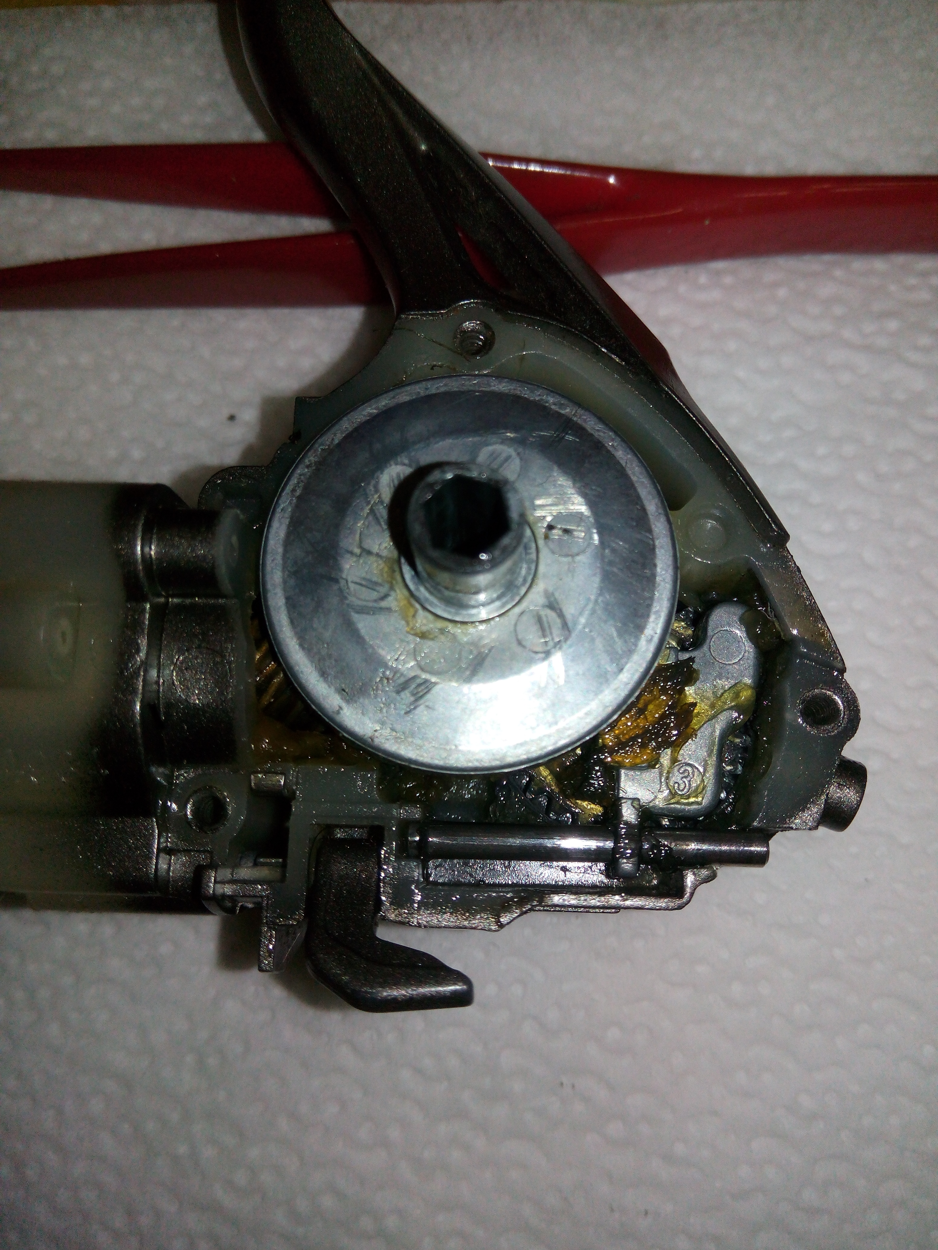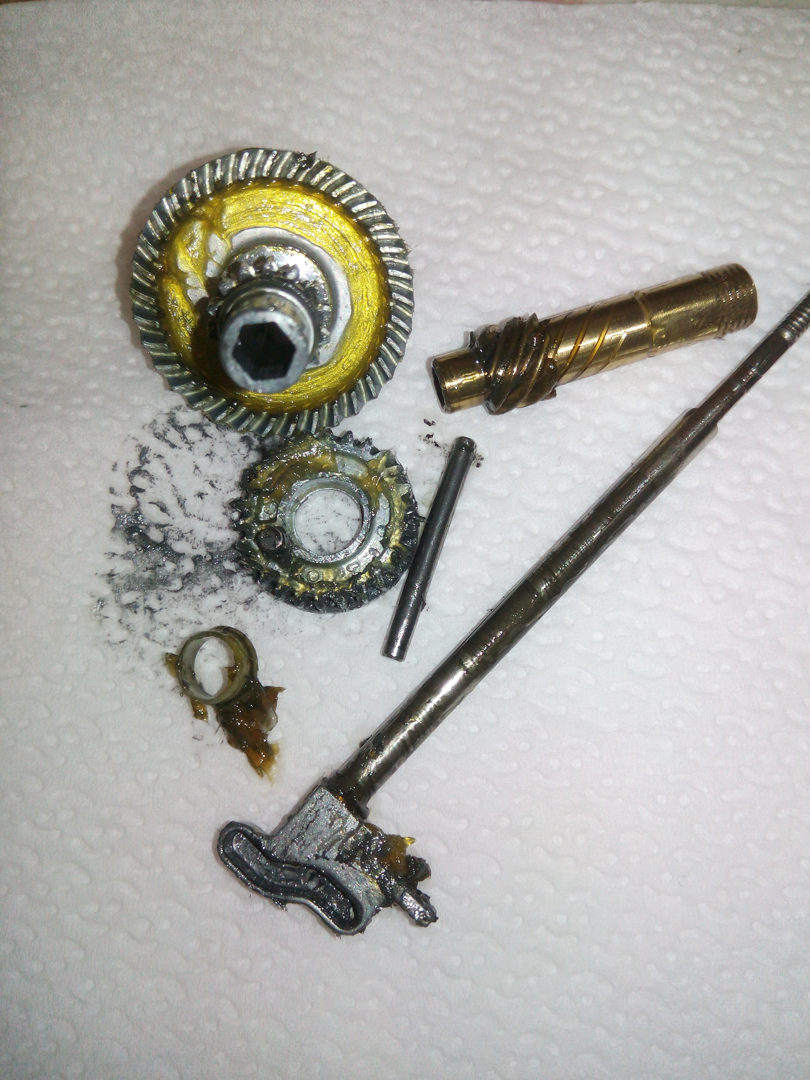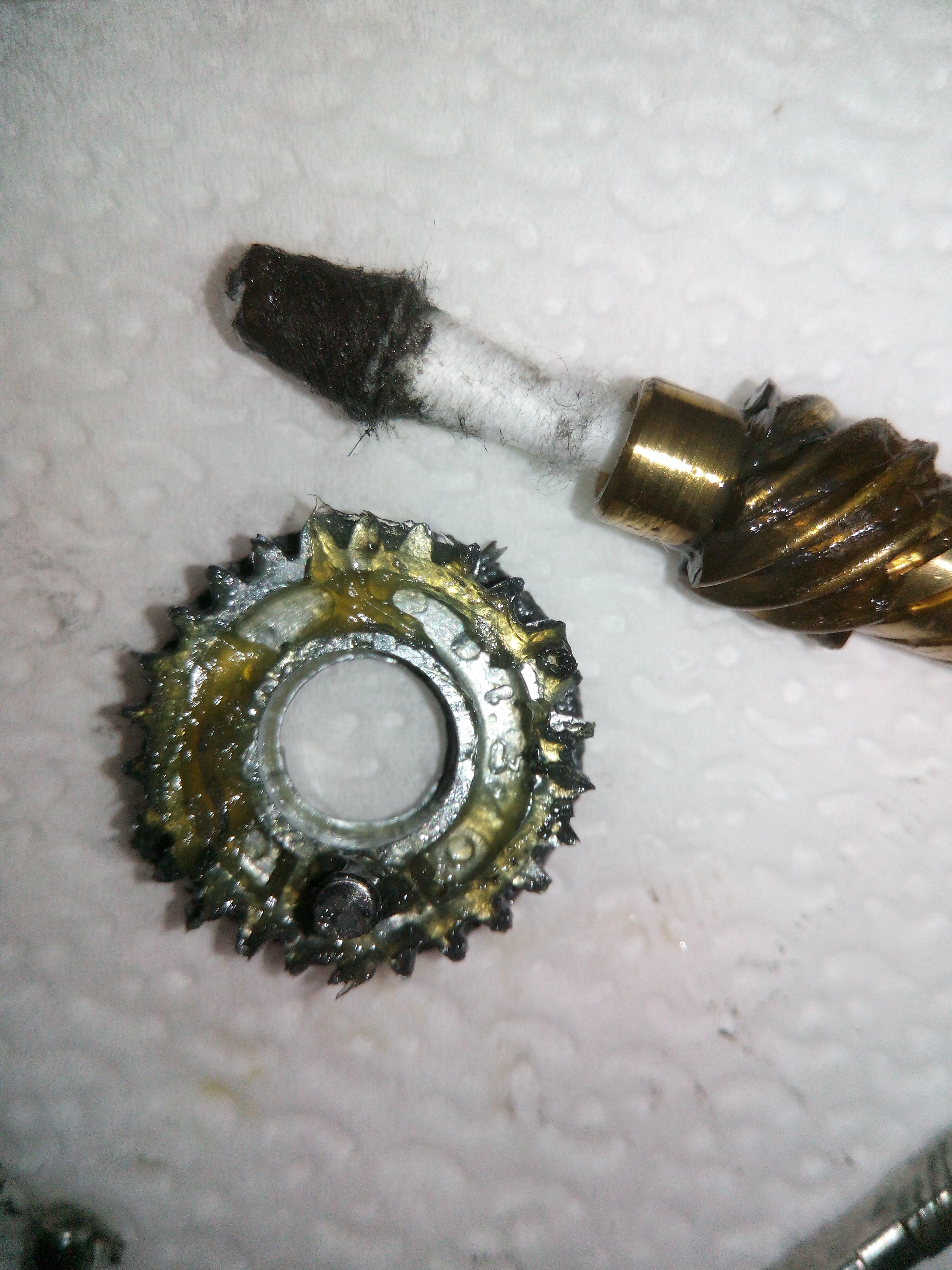 Ход катушки плавный и тихий, но внутри она была почему-то грязная. Щелчки в крайних положениях шпули обусловлены тем, что в пазу каретки появилась незначительная выработка, это довольно частое явление и на общий рабочий механизм не влияет, кроме как посторонних щелчков. На ГП выработка тоже незначительная, в виде равномерной косой притирки зубьев. Что случилось со смазкой после ТО я не пойму. В суставе рукоятки присутствовал приличный люфт, который можно было без особого труда убрать, так как шток вышел как по маслу. Ещё один интересный нюанс в виде лопнувшей пружины в отбрасывателе дужки. По идее в процессе ТО такие бросающиеся в глаза неисправности должны были устраниться.