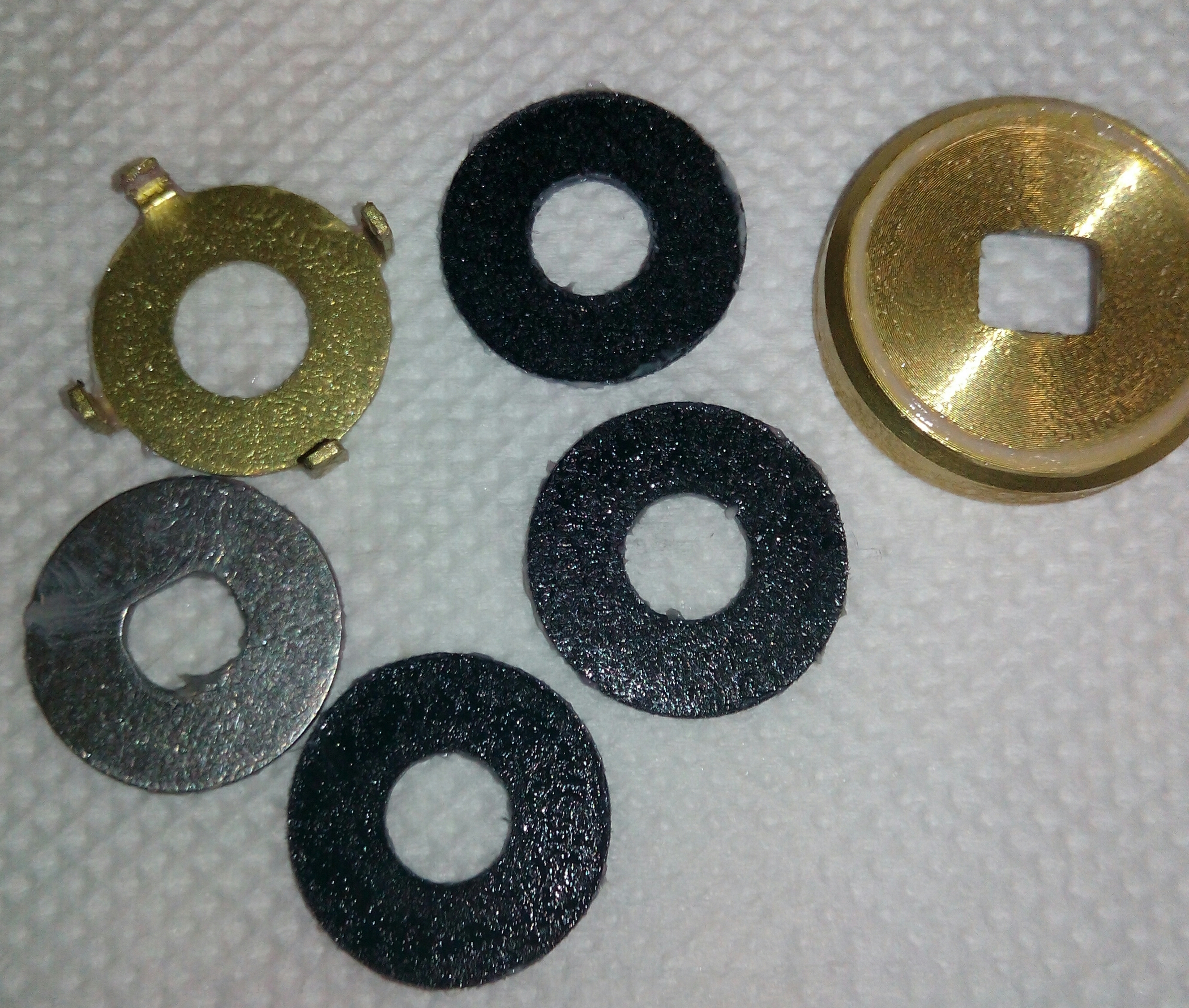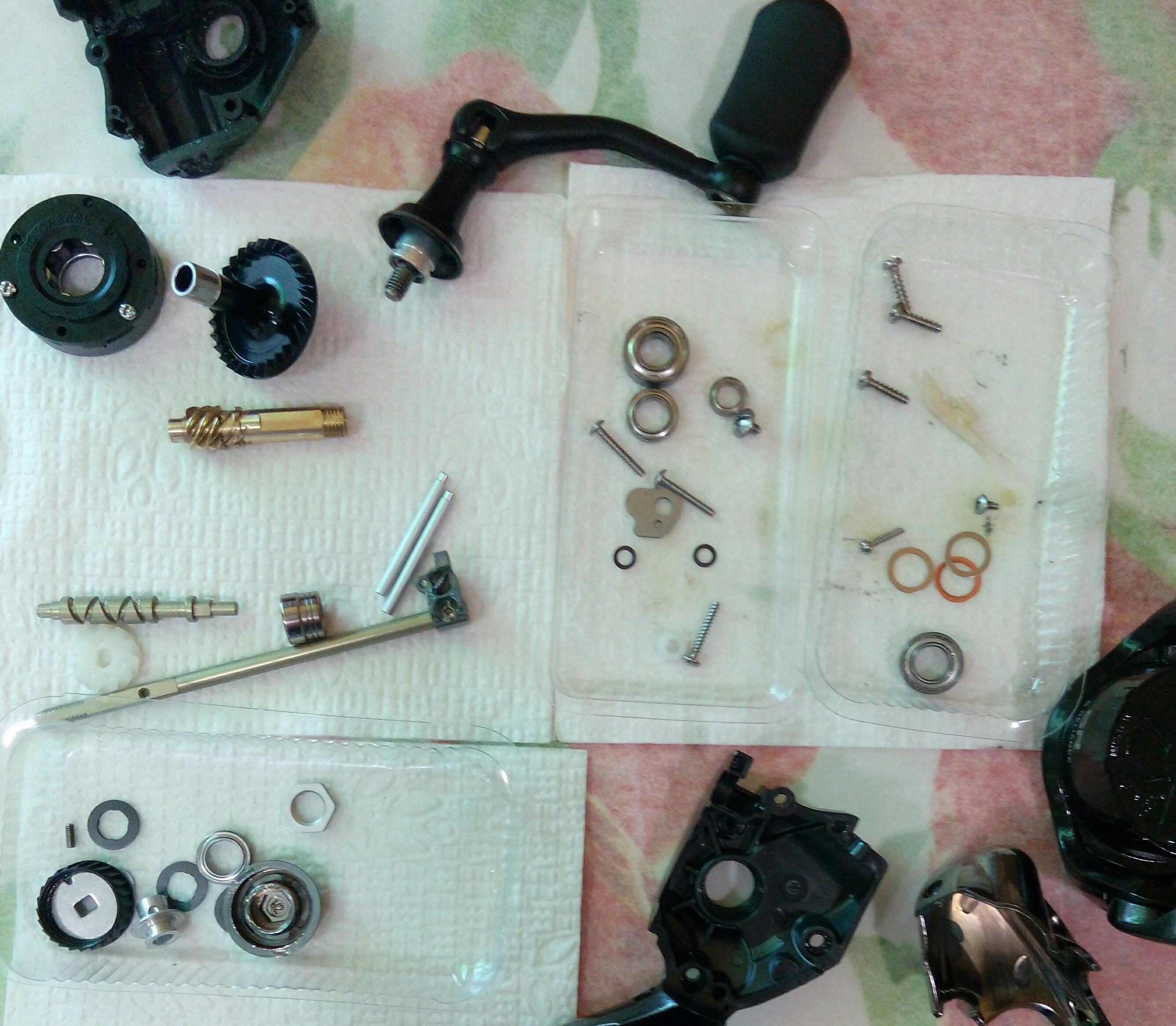 Катушка Shimano13 Complex CI4+ 2500S F4. Незначительный люфт ГП и люфт кноба. Всё остальное в идеале. Катушку раньше уже смазывали. Всего в ней 9 подшипников: на ГП-4, в кнобе-2, под шпулей-1, в самой шпуле-1 и в ролике л/у -1. Поставил ещё один подшипник вместо втулки на вал бесконечного винта. Итого 10+1. Интересная конструкция рукоятки, разбирается на мельчайшие детали. А вот фрикцион немного расстроил. Не смотря на резиновый уплотнитель на гайке шпули, фрикционные шайбы были грязные от попадания пыли