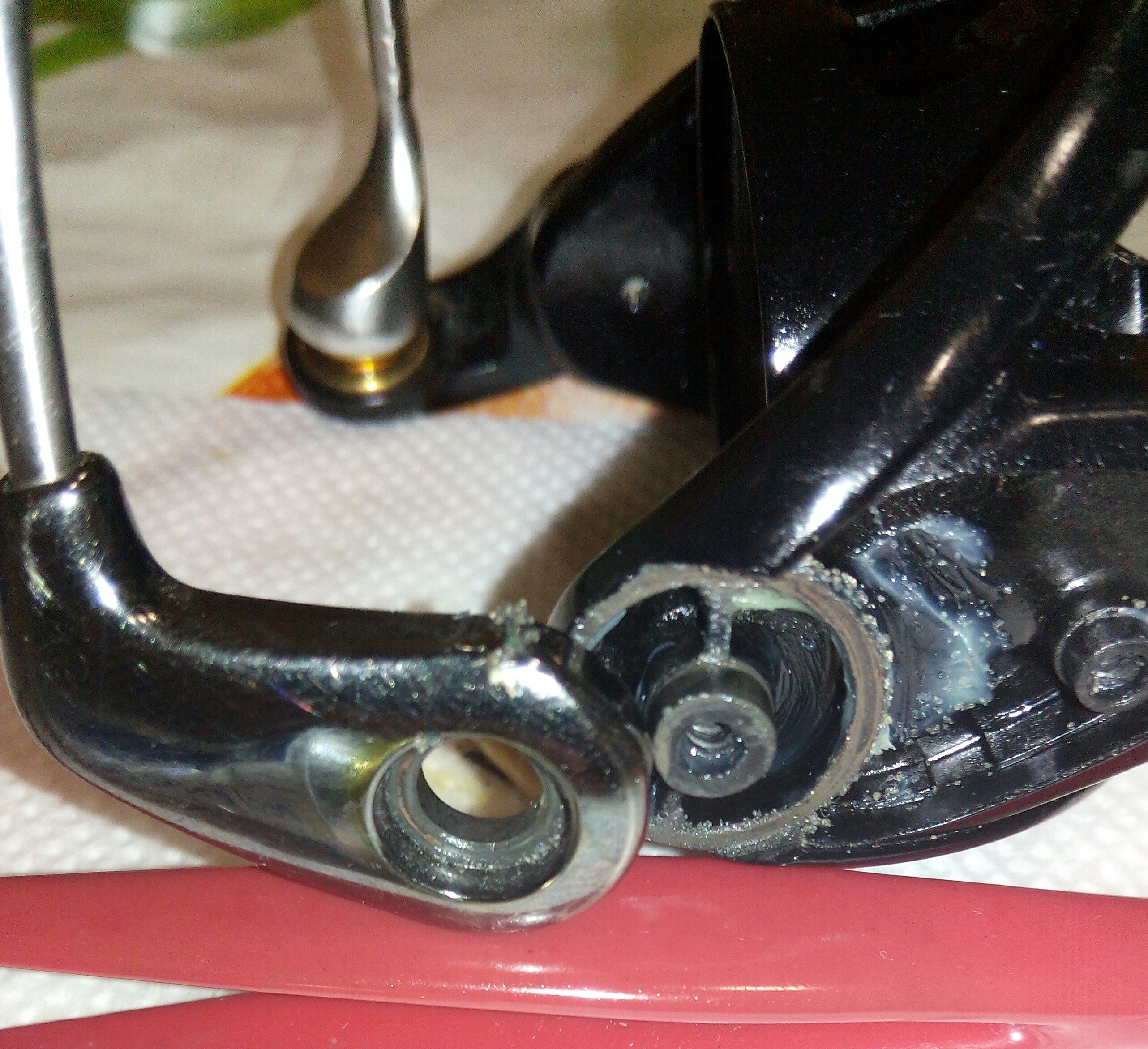 Заслуженная народная Катушка Ryobi Ecusima 4000Vi. Катушка эксплуатируется около семи лет. Ни разу не проходила ТО. Был очень большой люфт и рокот ГП. Внутри катушки была, давно уже отработанная смазка, больше похожа на грязь. Винт штока был отвинчен и своей шляпкой цеплял зубья ведущей шестерни при работе, когда каретка заходила под неё. Так же была уже с овальной выработкой втулка, которая стояла на одном из штоков вед. шестерни, из-за этого она крутилась «восьмёркой» и появился сильный люфт. Замена её на подшипник и устранения люфтов исправили ситуацию. Ролик л/у был сухой, подшипник убитый. Фрикционные шайбы тоже были суховаты на мой взгляд. После устранения всех неполадок и смазки катушка ожила. Ход стал плавный и тихий.