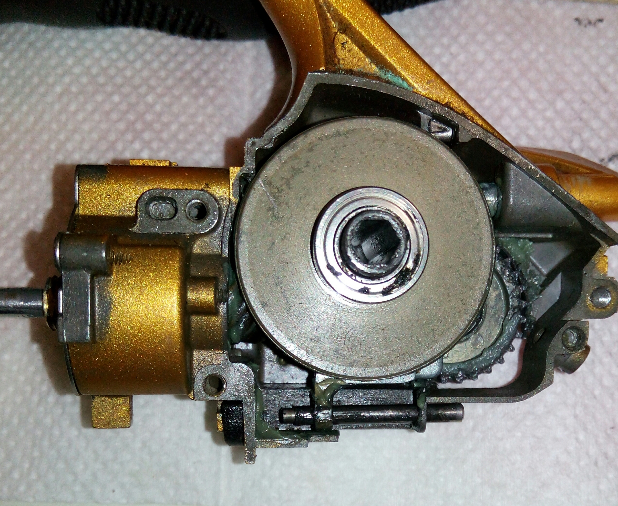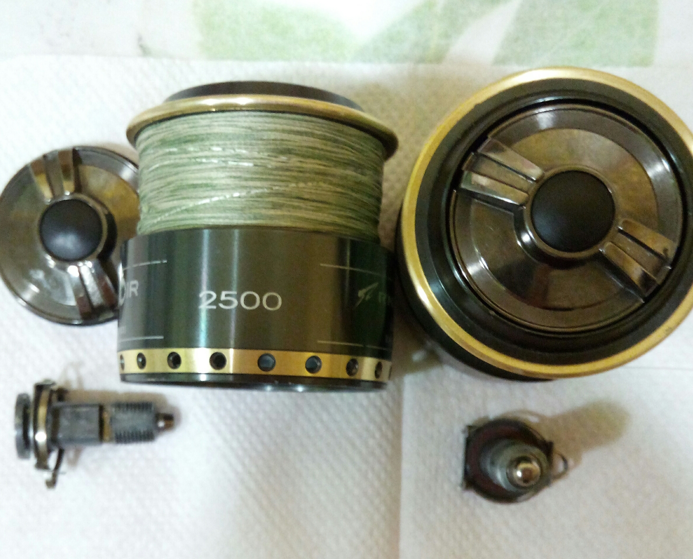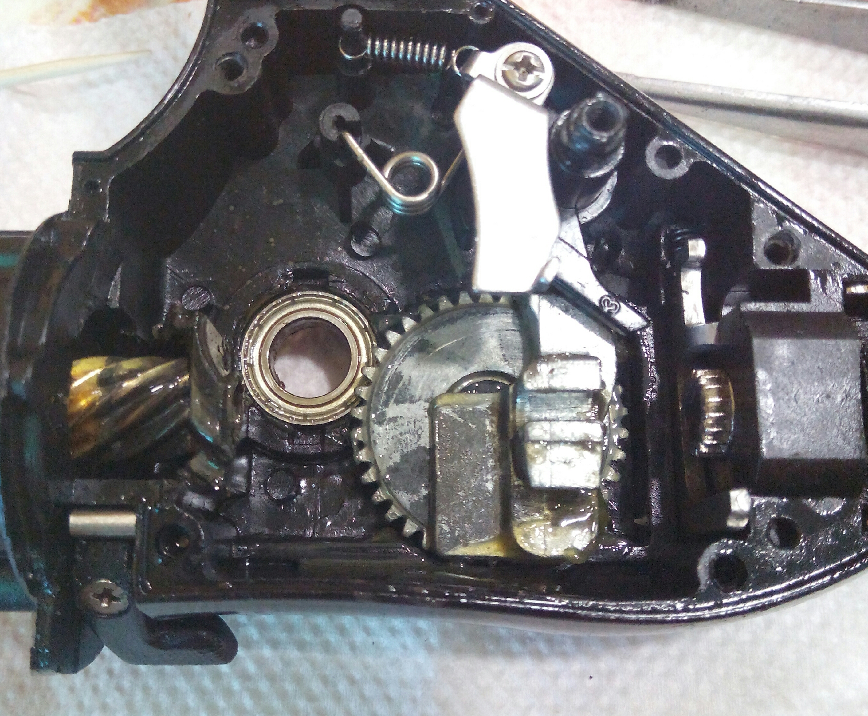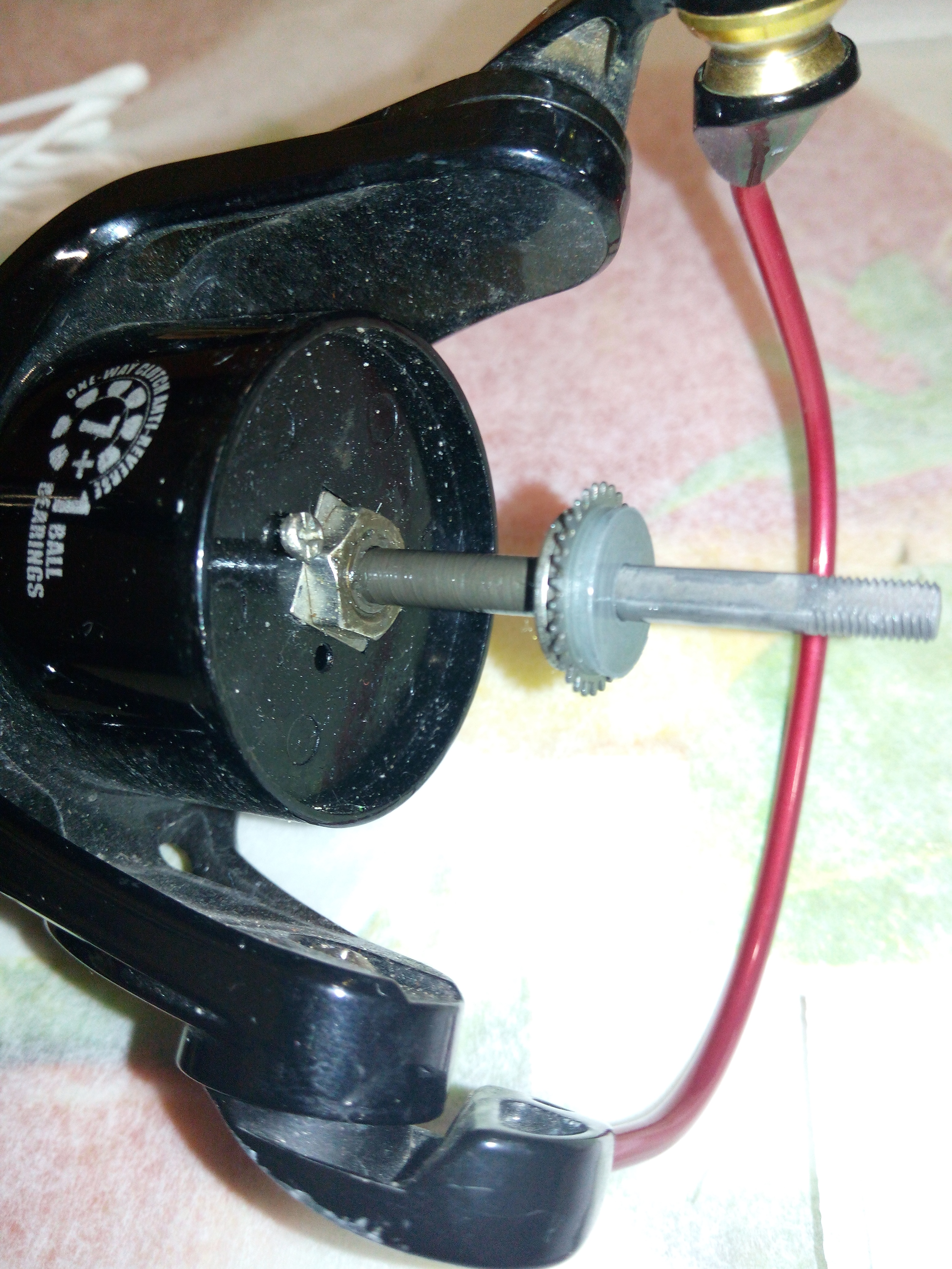 Катушка Okuma Longbow. Крутилась очень туго, по ощущениям напоминала забившуюся ручную мясорубку. Не удивительно, так как эта катушка случайно провела не определённое время на дне реки. В итоге три ржавых заклинивших подшипника: на ведущей шестерне, на ведомой и в ролике л/у. Так же под колпачком на роторе возле пружины поселился какой-то речной жук