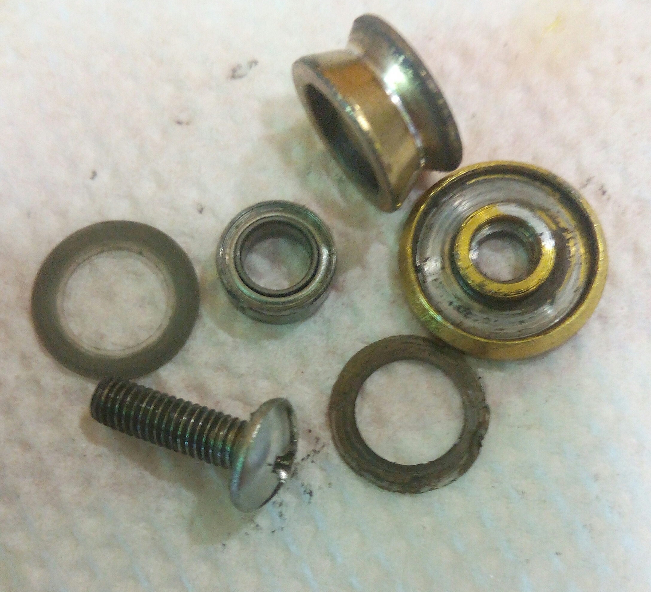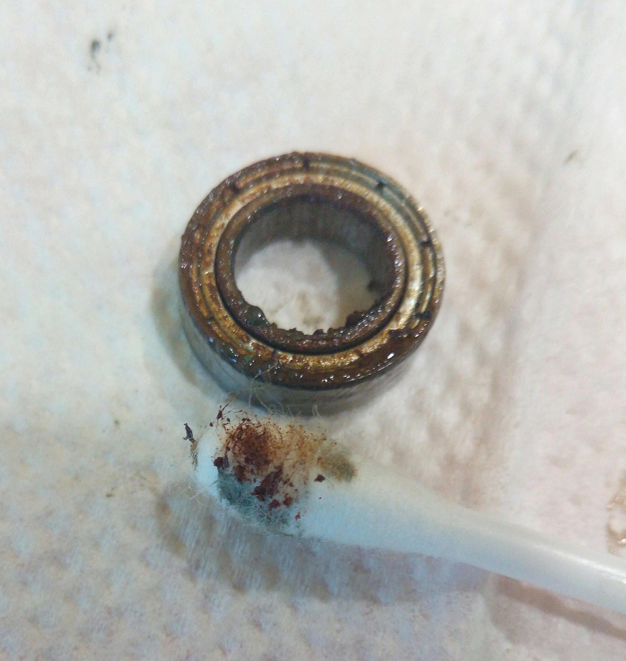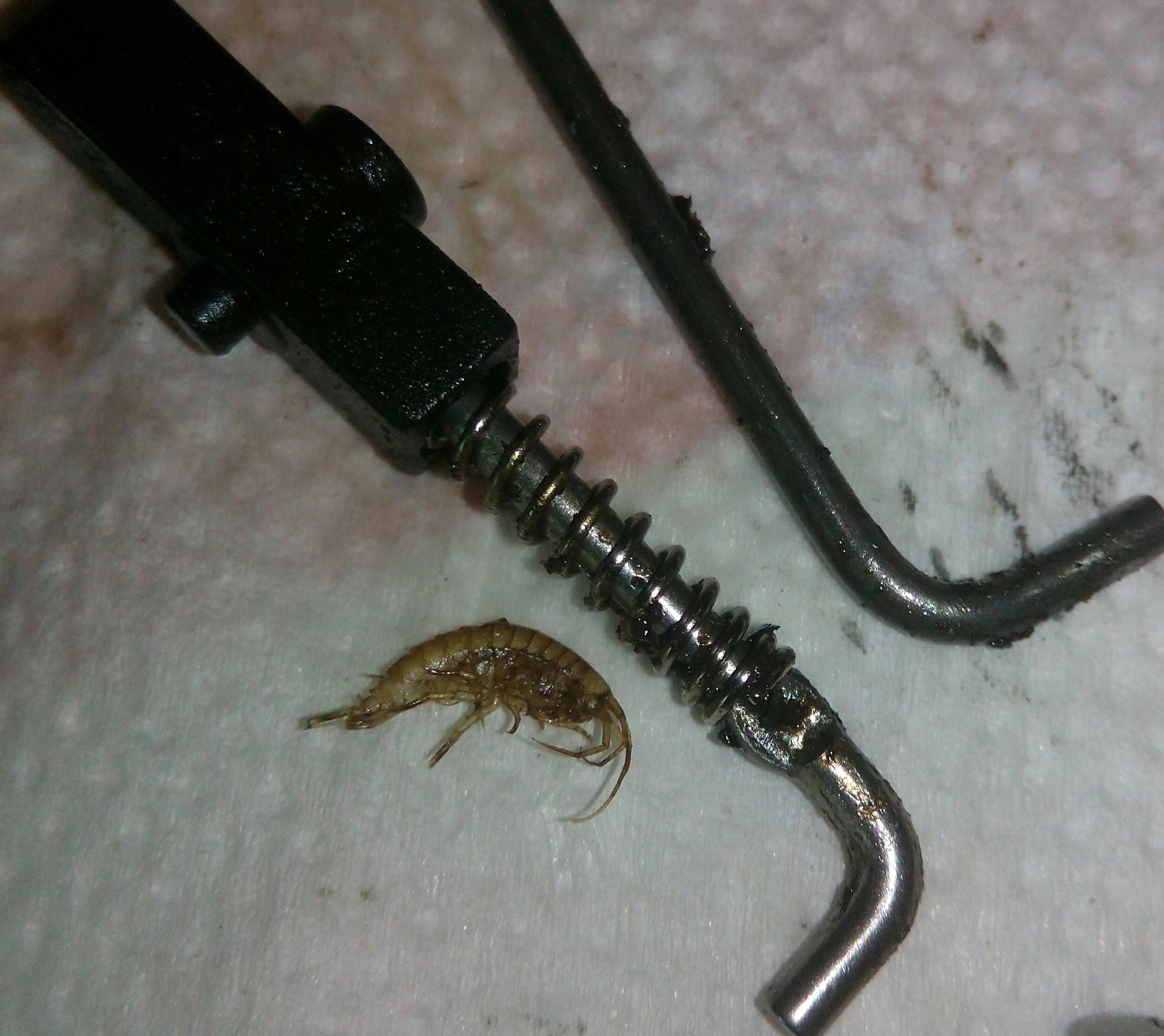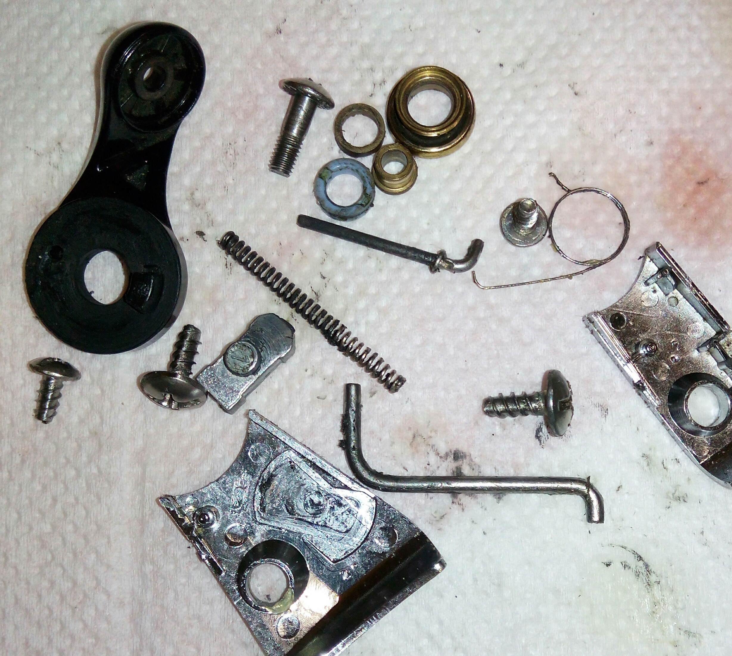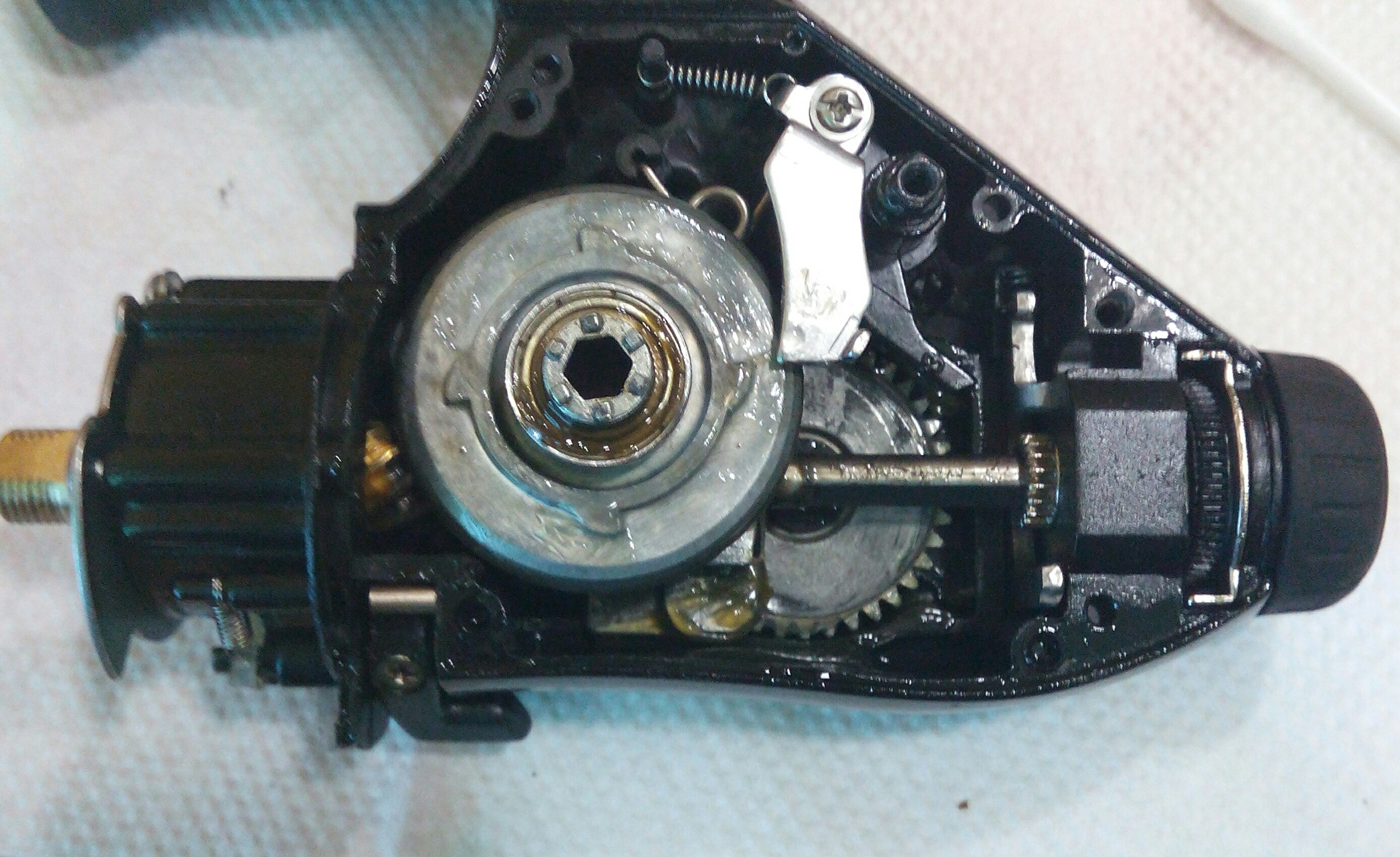 Катушка Okuma Longbow. Крутилась очень туго, по ощущениям напоминала забившуюся ручную мясорубку. Не удивительно, так как эта катушка случайно провела не определённое время на дне реки. В итоге три ржавых заклинивших подшипника: на ведущей шестерне, на ведомой и в ролике л/у. Так же под колпачком на роторе возле пружины поселился какой-то речной жук