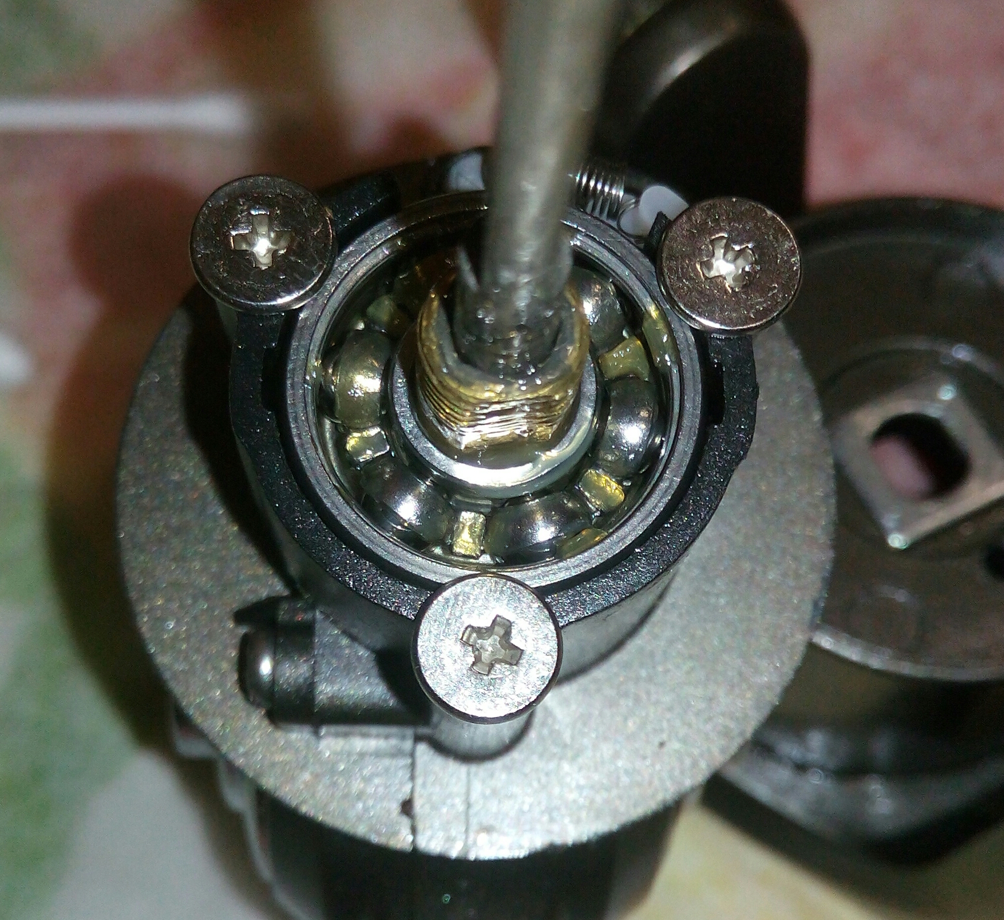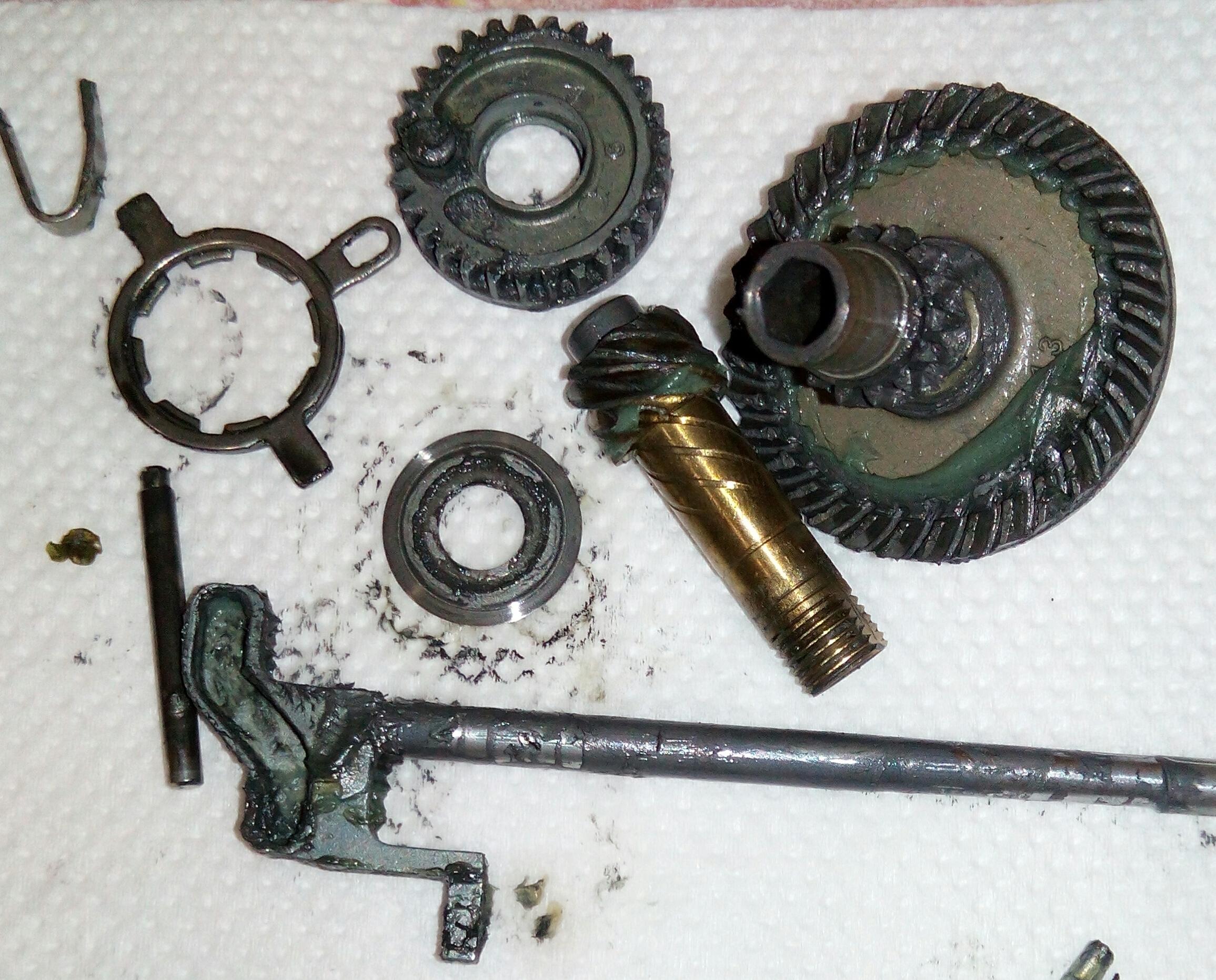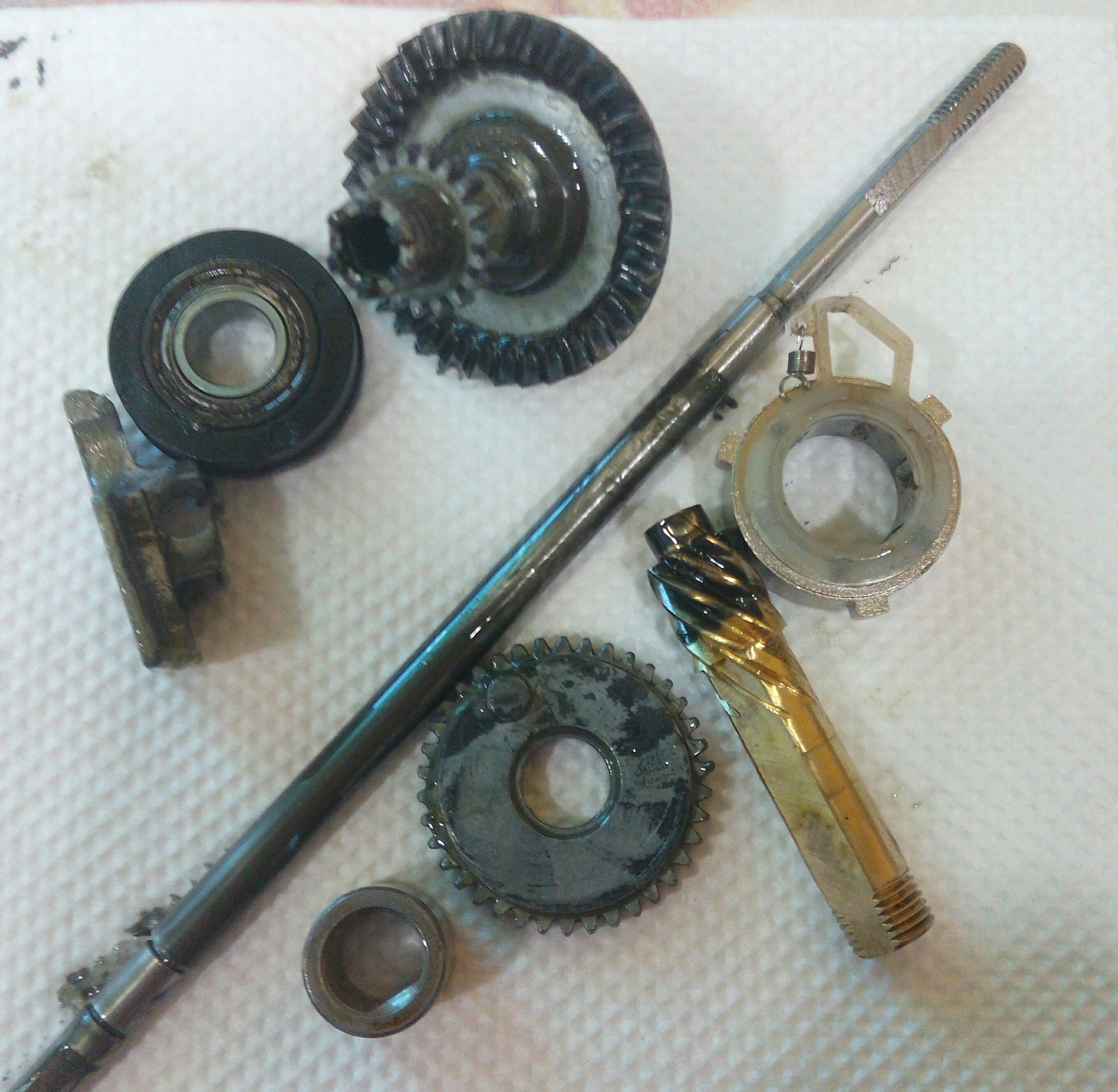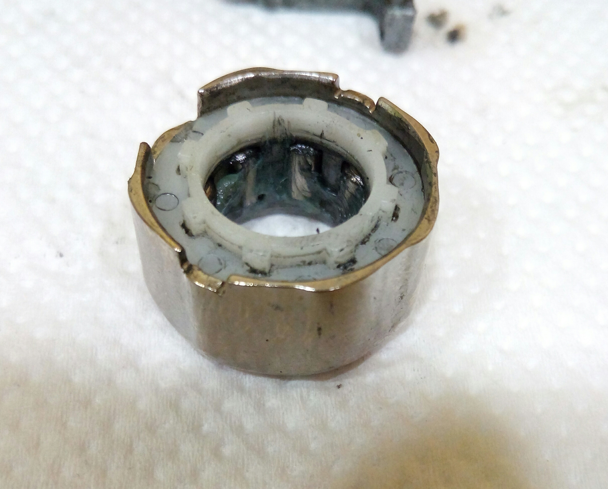 Катушка Okuma Longbow. Крутилась очень туго, по ощущениям напоминала забившуюся ручную мясорубку. Не удивительно, так как эта катушка случайно провела не определённое время на дне реки. В итоге три ржавых заклинивших подшипника: на ведущей шестерне, на ведомой и в ролике л/у. Так же под колпачком на роторе возле пружины поселился какой-то речной жук