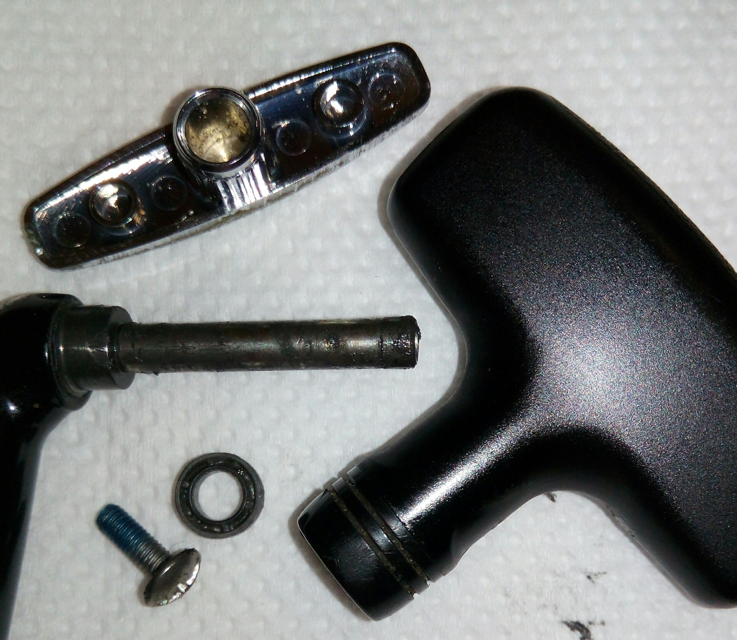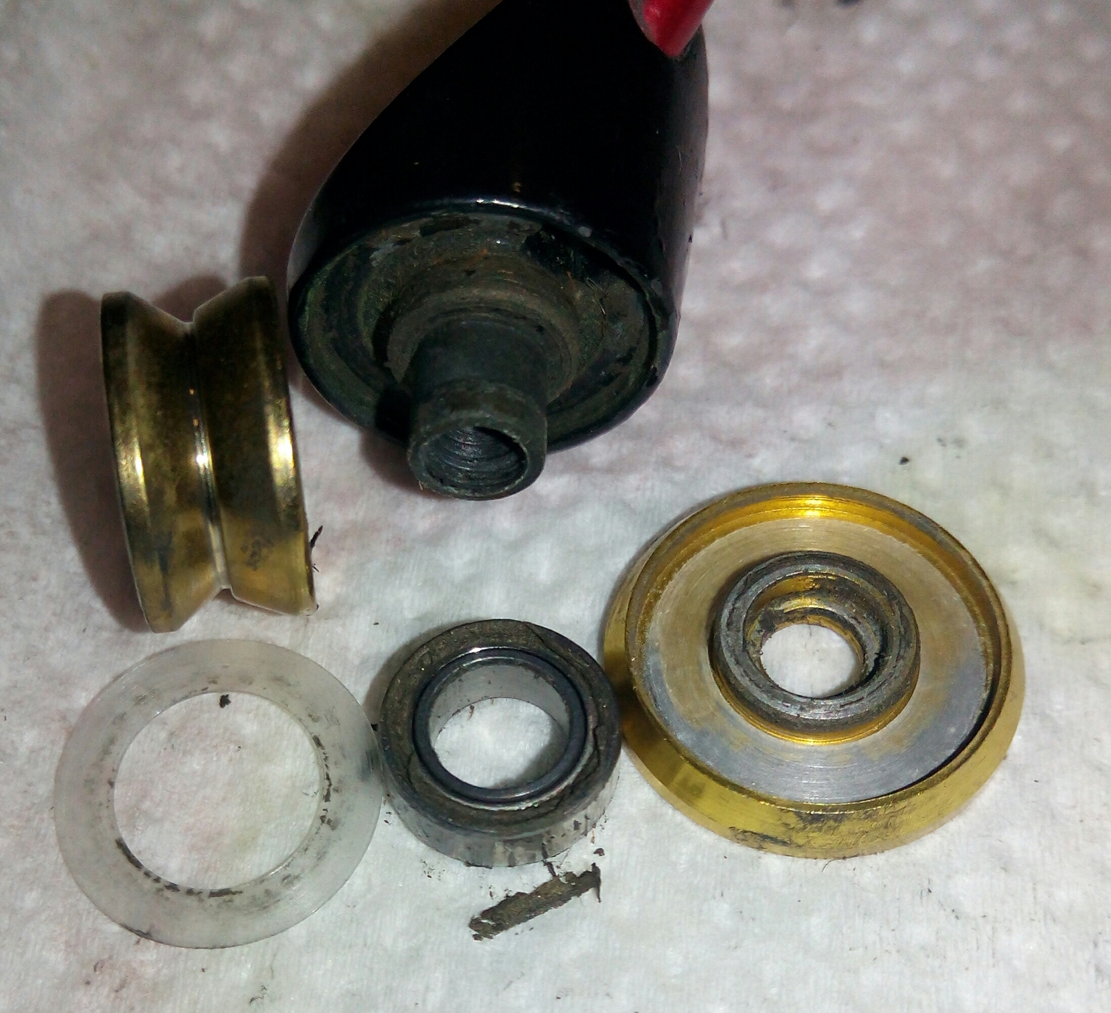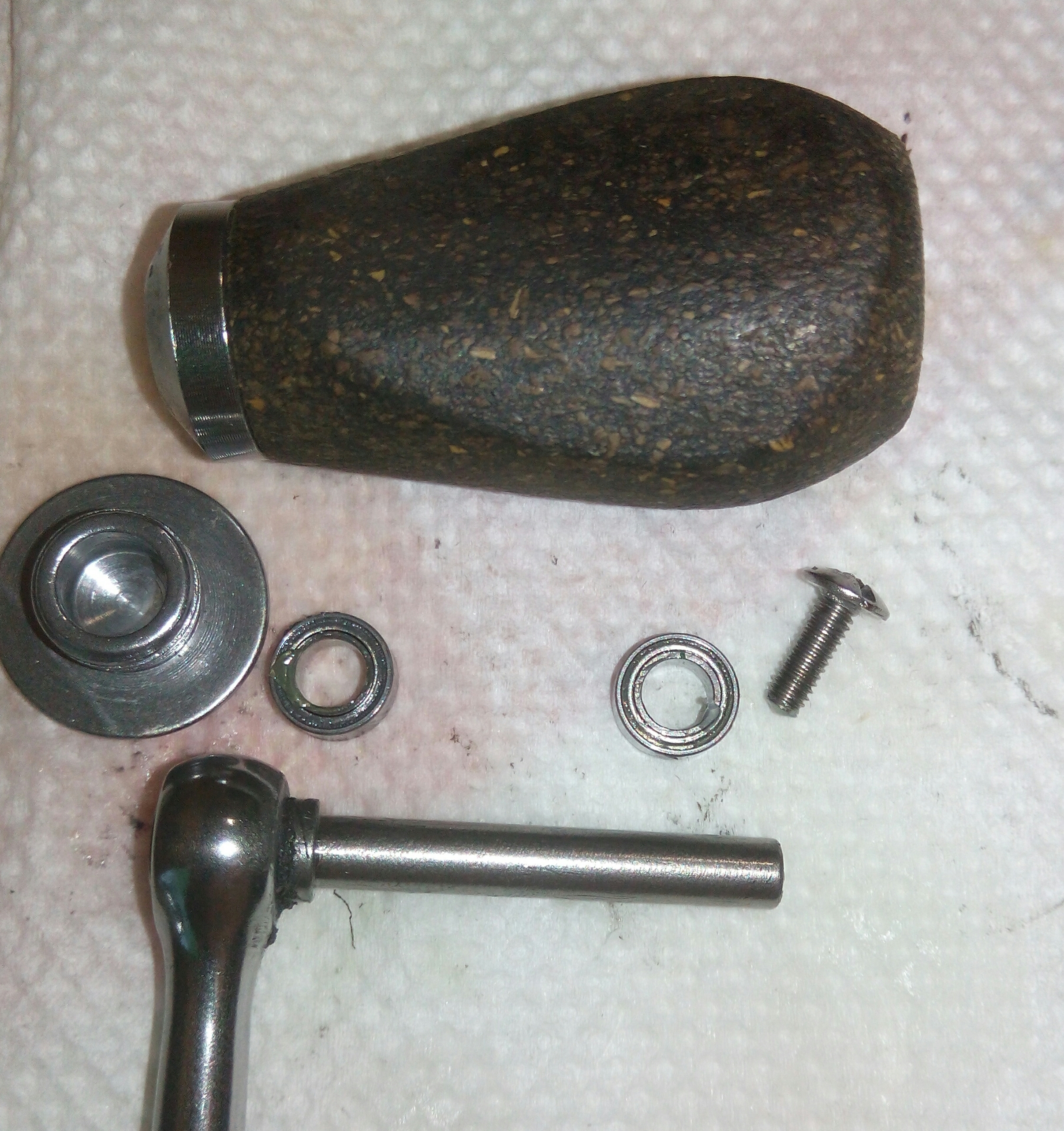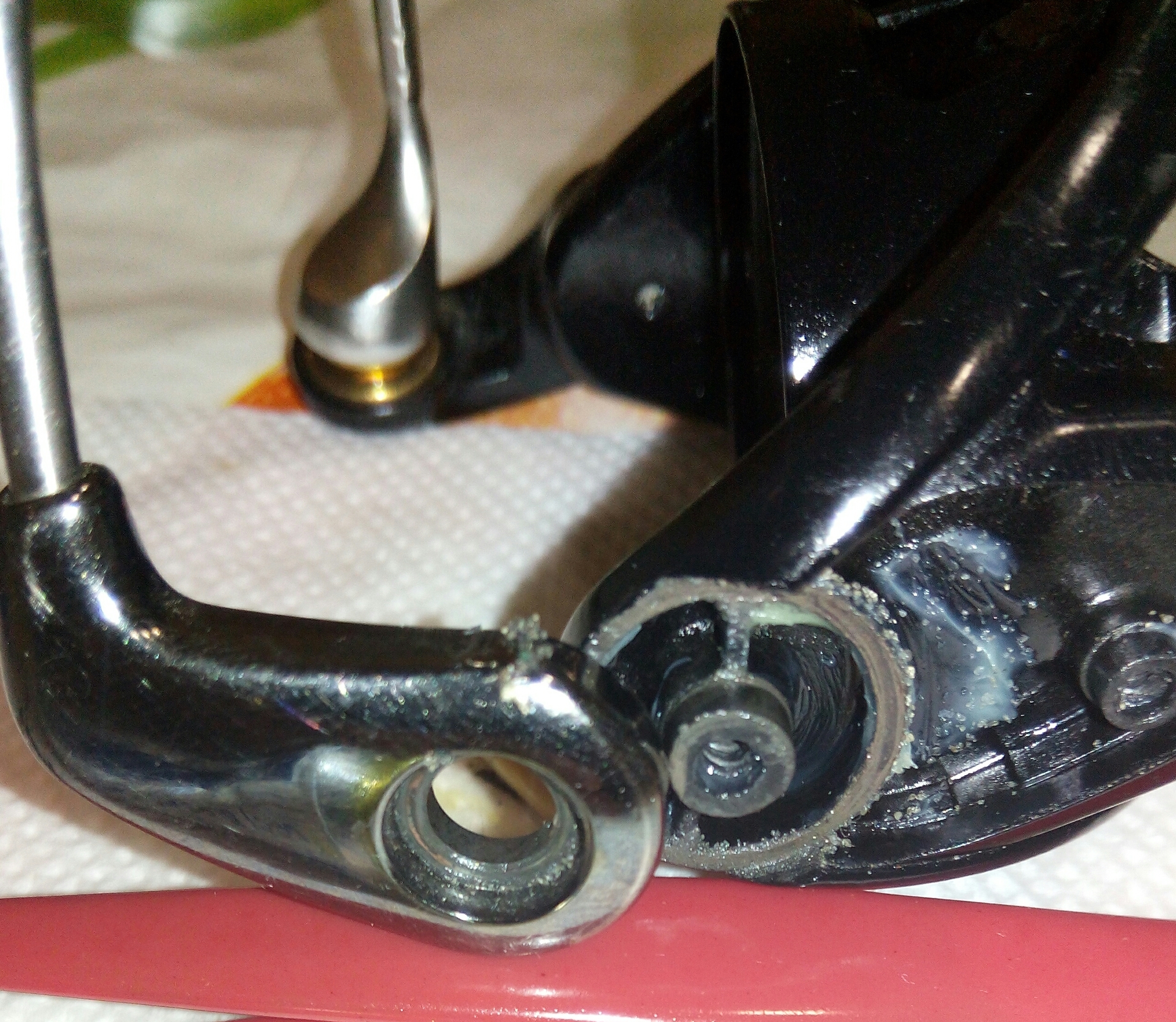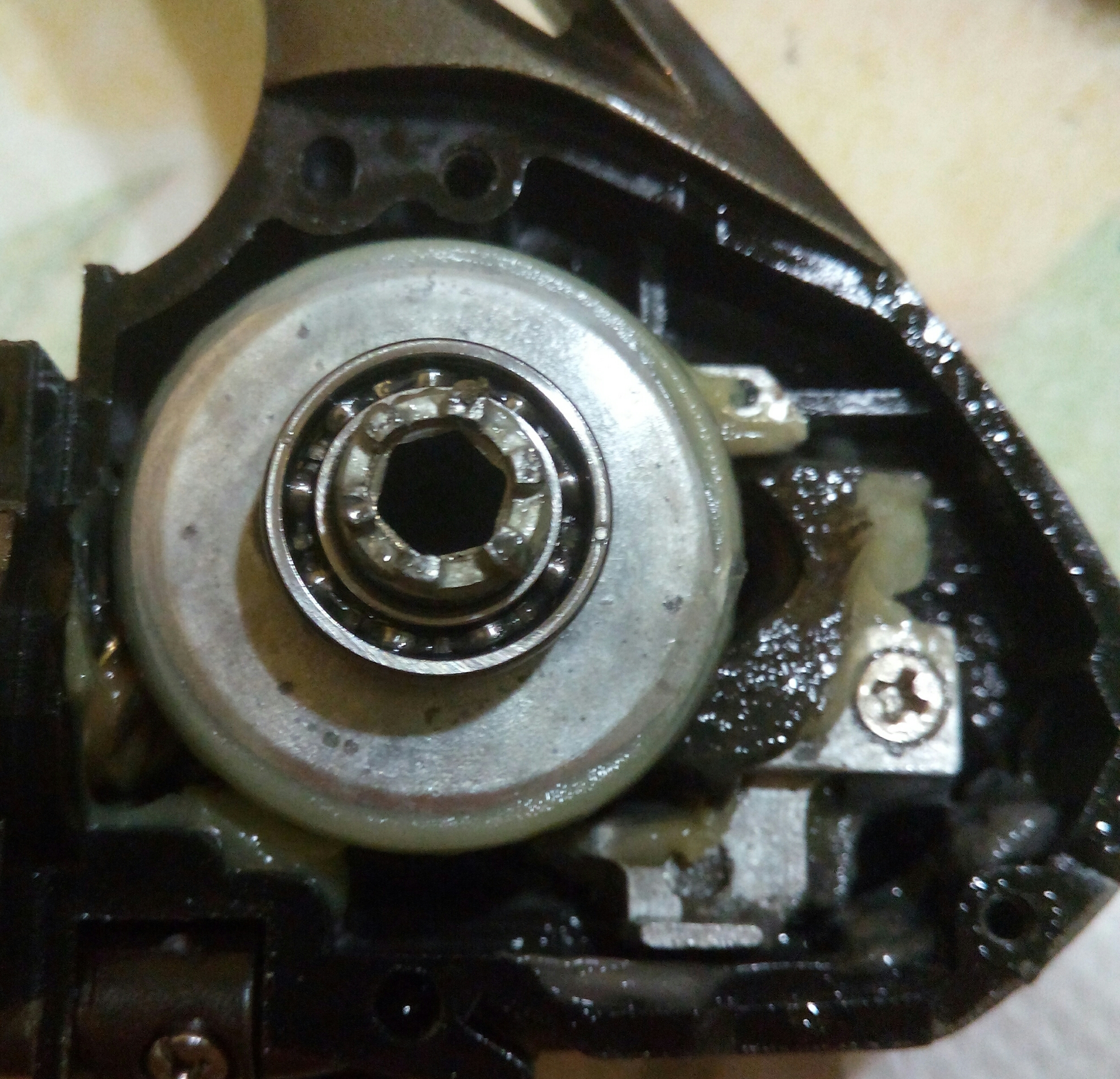 Катушка Spro Grand Arc Tuff-Body 830. Ход плавный и практически тихий, издаёт лёгкий шелест. Небольшой люфт ГП. И огромный люфт рукоятки, который присутствует везде, начиная от самого шестигранника, который болтается внутри ведущей шестерни даже при максимальном зажатии гайкой, потом в самом суставе рукоятки и люфт кноба около 2мм. В самом кнобе установлены один подшипник и одна втулка. Хороший пример, как втулка сжирает ось, даже на фото это чётко видно. Меняем на подшипник. Ролик л/у сухой полностью и грязный, подшипник на удивление живой. Фрикционные шайбы хоть и чистые, но тоже сухие. Подшипников, как и заявлено производителем 7+1, установленны в самых нужных местах, теперь будет 8+1.