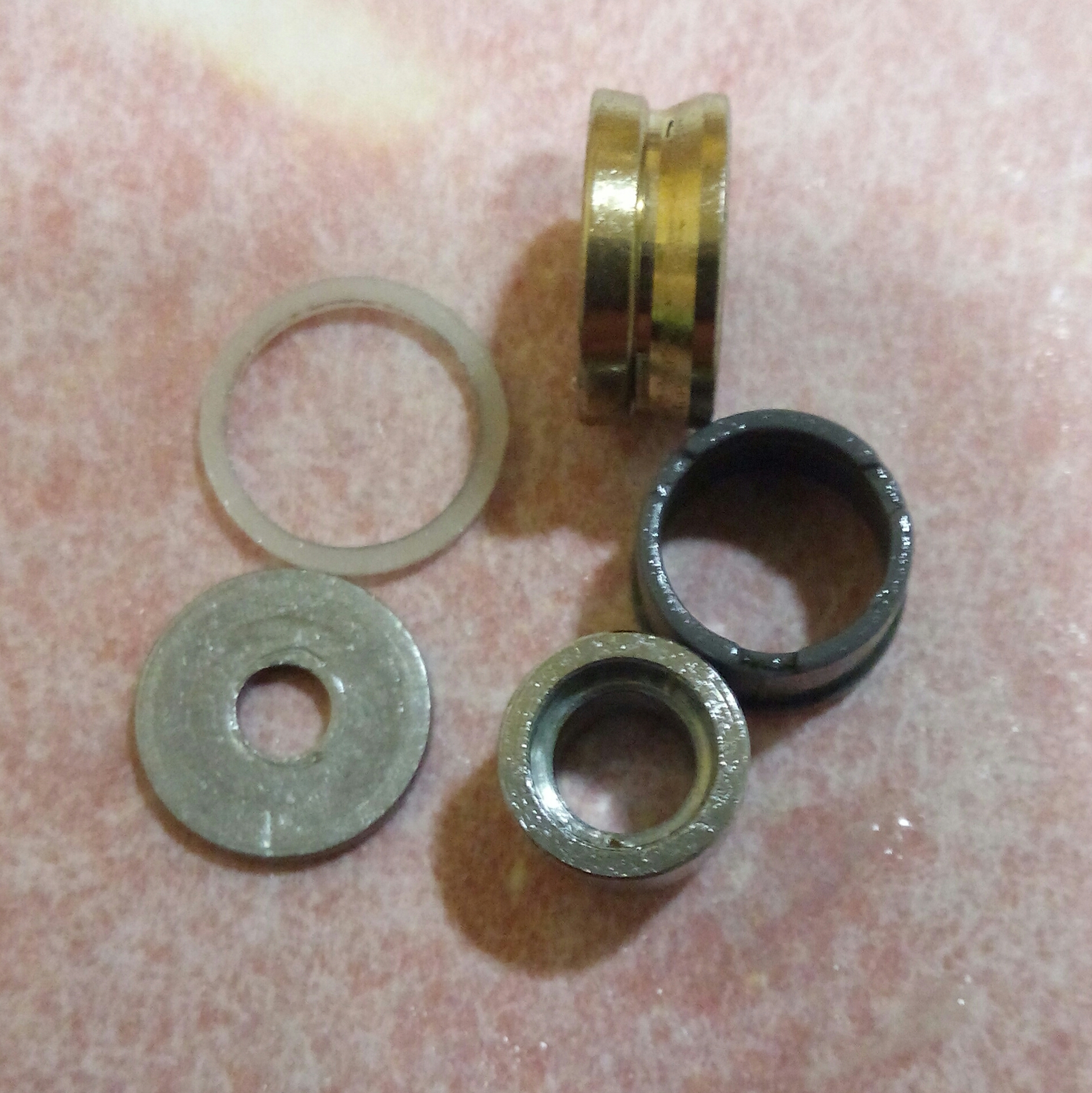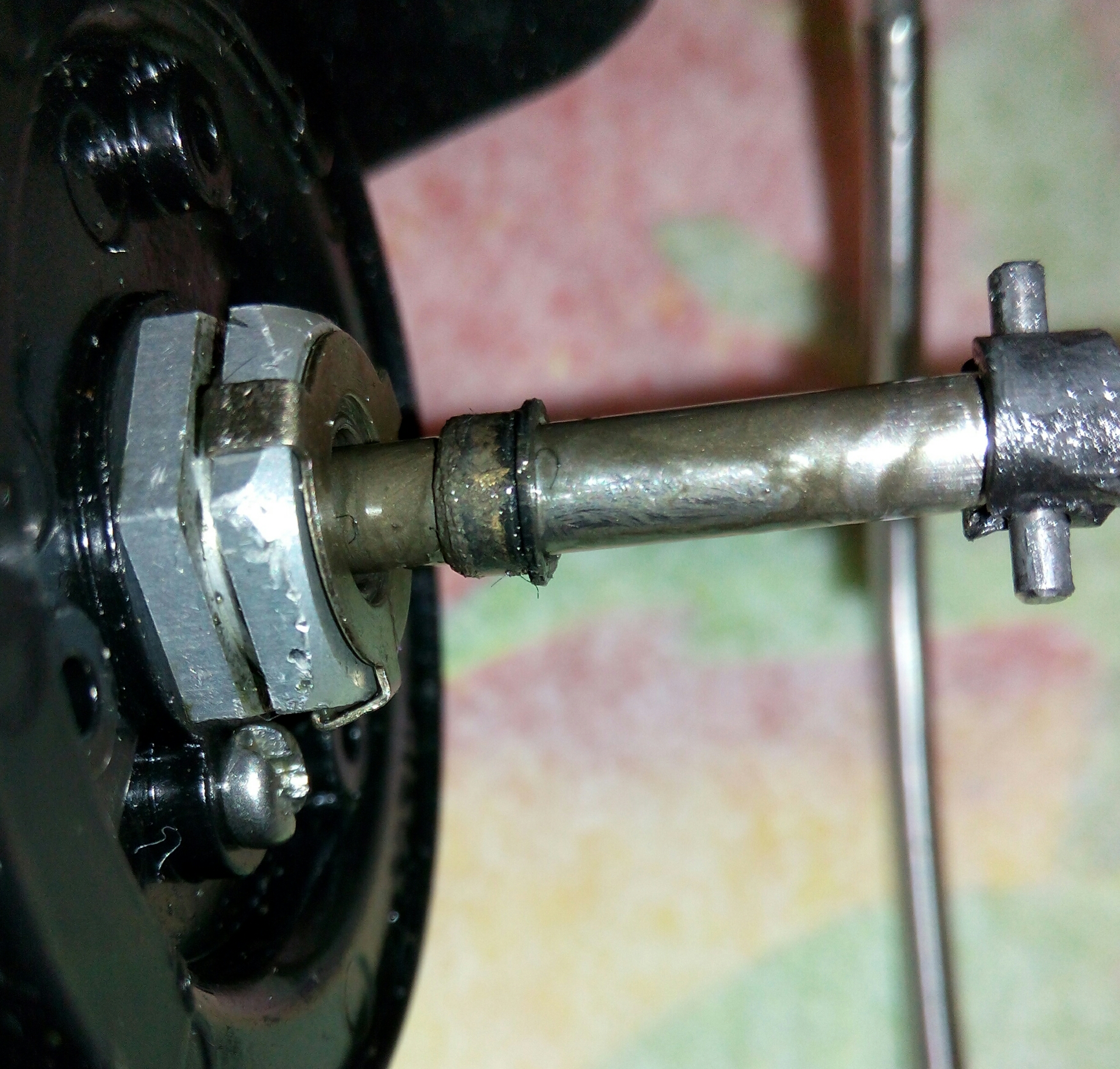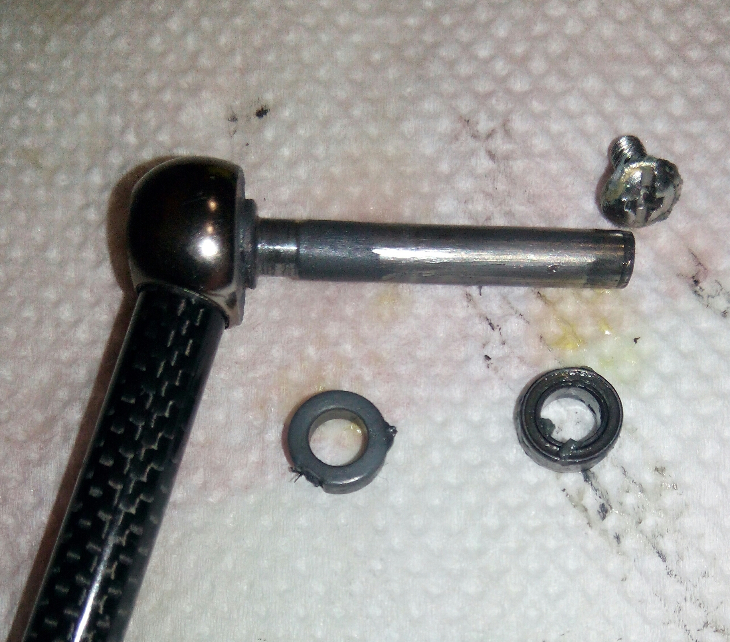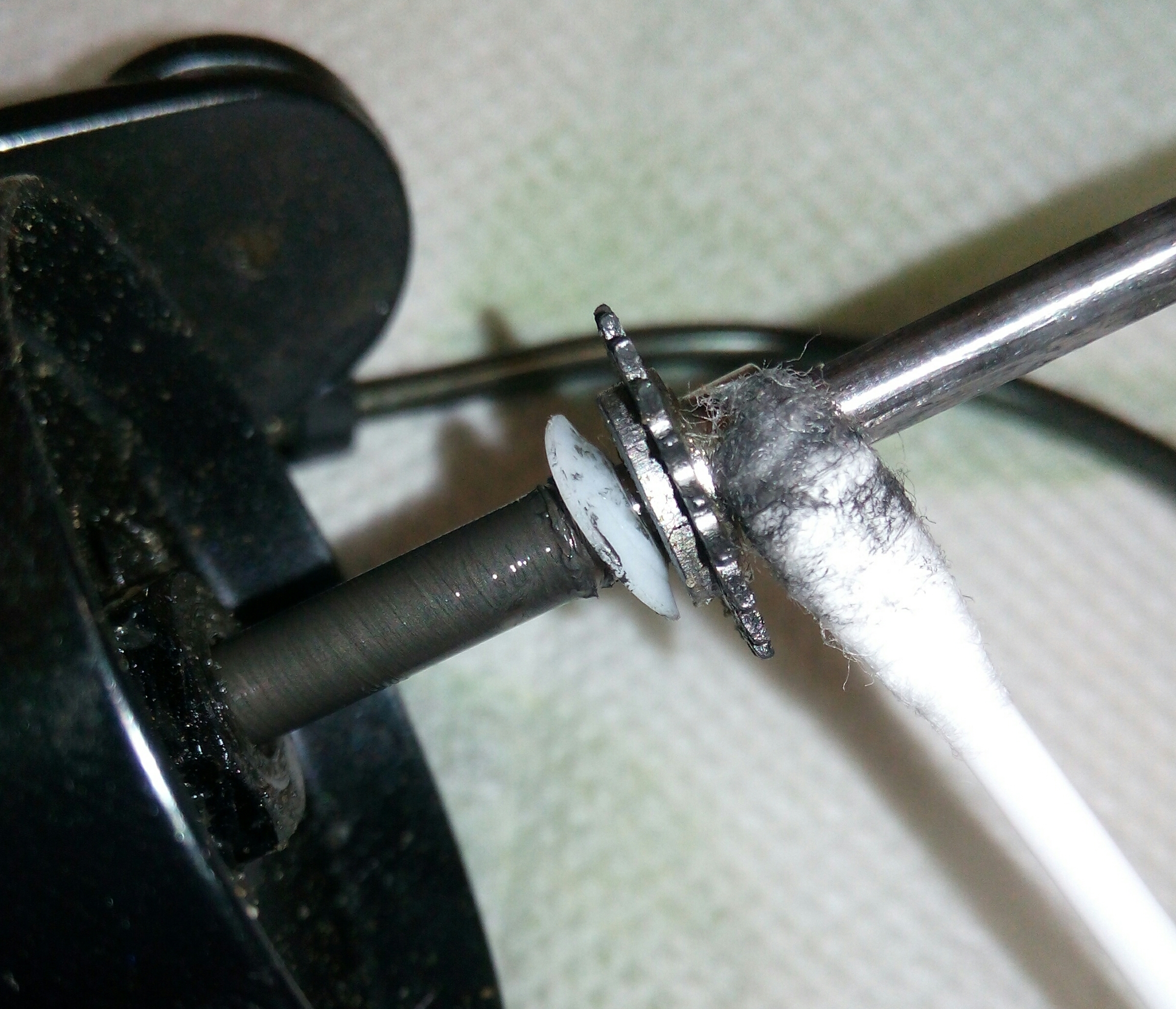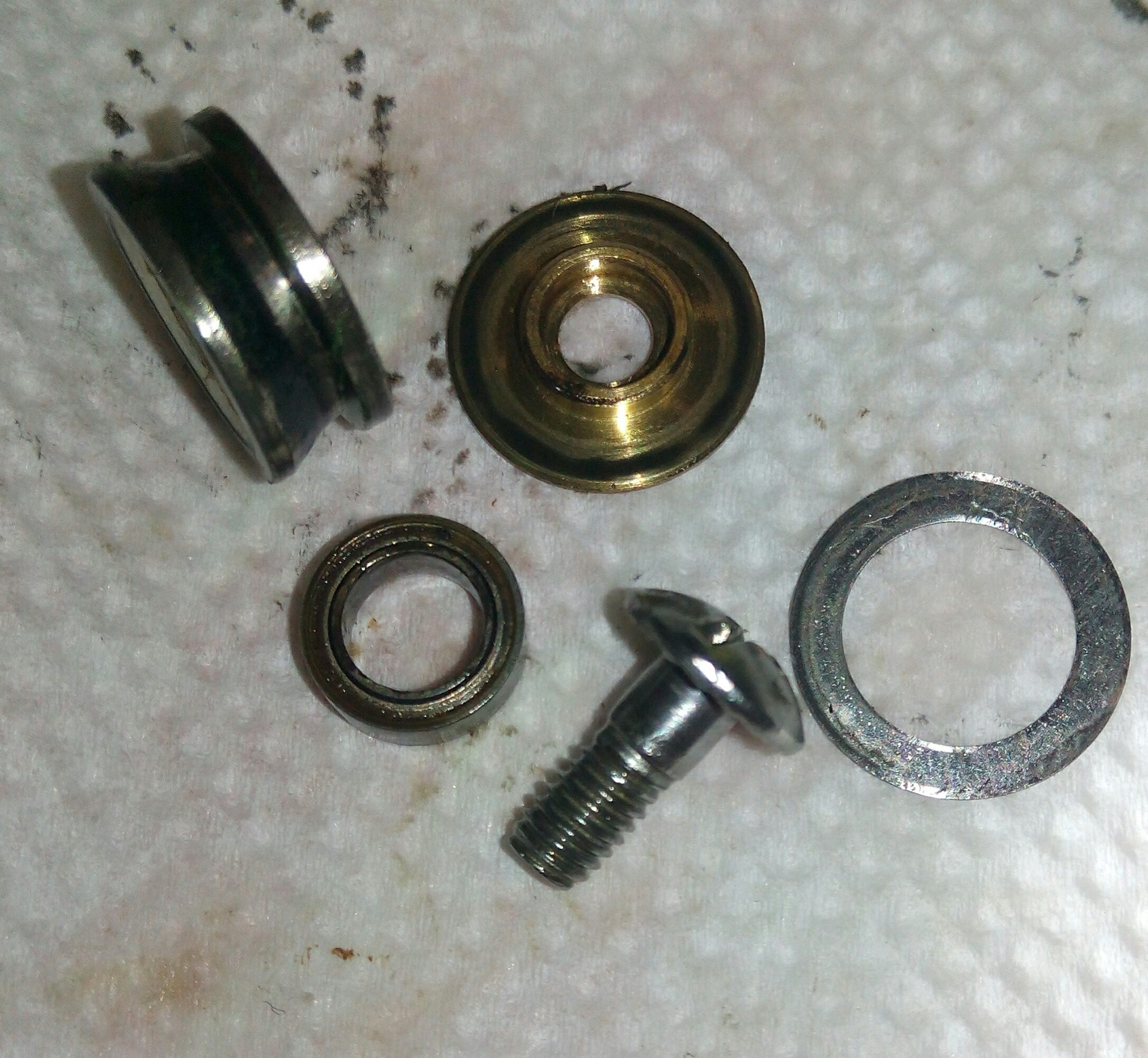 Катушка Spro Grand Arc Tuff-Body 830. Ход плавный и практически тихий, издаёт лёгкий шелест. Небольшой люфт ГП. И огромный люфт рукоятки, который присутствует везде, начиная от самого шестигранника, который болтается внутри ведущей шестерни даже при максимальном зажатии гайкой, потом в самом суставе рукоятки и люфт кноба около 2мм. В самом кнобе установлены один подшипник и одна втулка. Хороший пример, как втулка сжирает ось, даже на фото это чётко видно. Меняем на подшипник. Ролик л/у сухой полностью и грязный, подшипник на удивление живой. Фрикционные шайбы хоть и чистые, но тоже сухие. Подшипников, как и заявлено производителем 7+1, установленны в самых нужных местах, теперь будет 8+1.