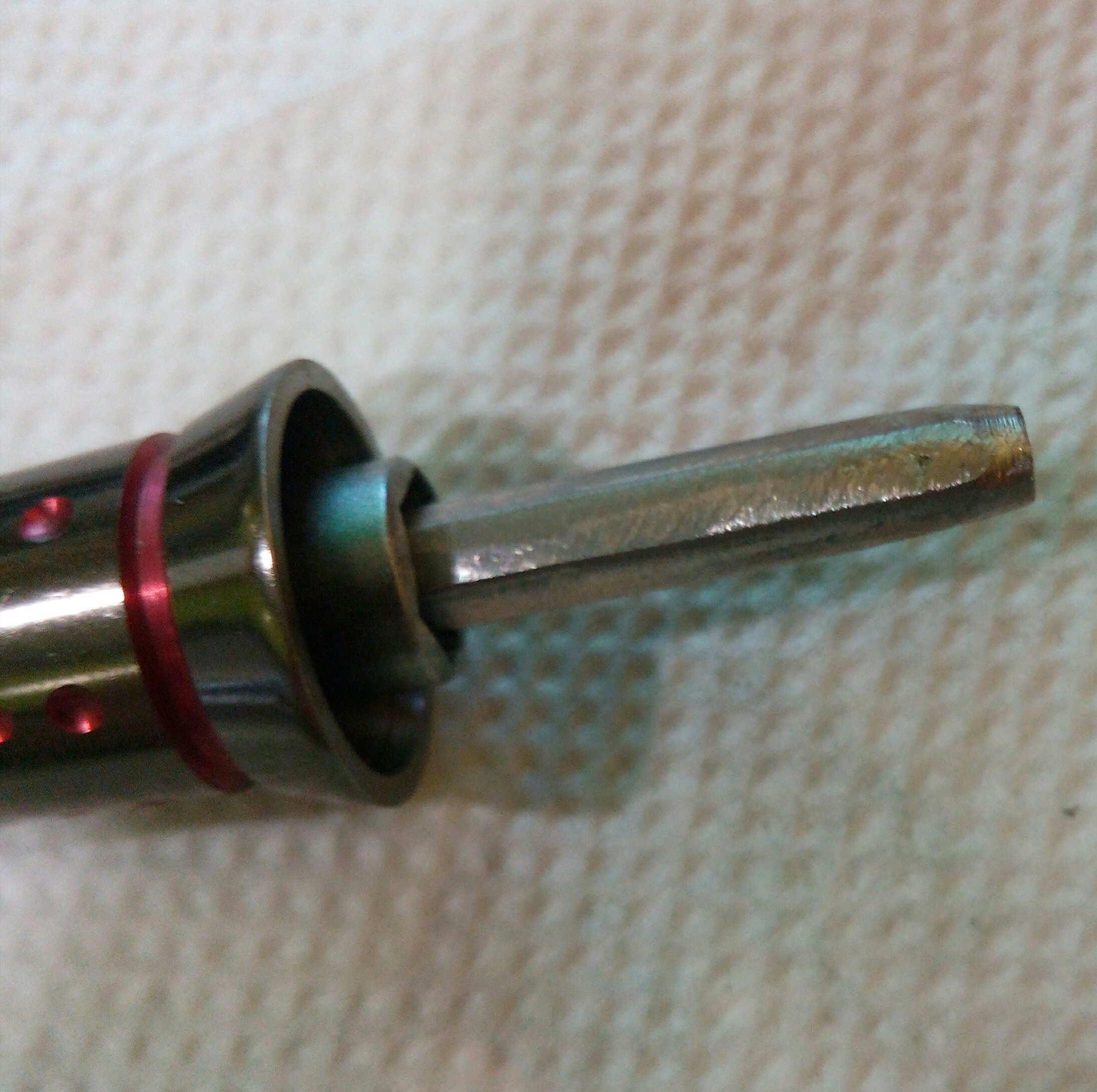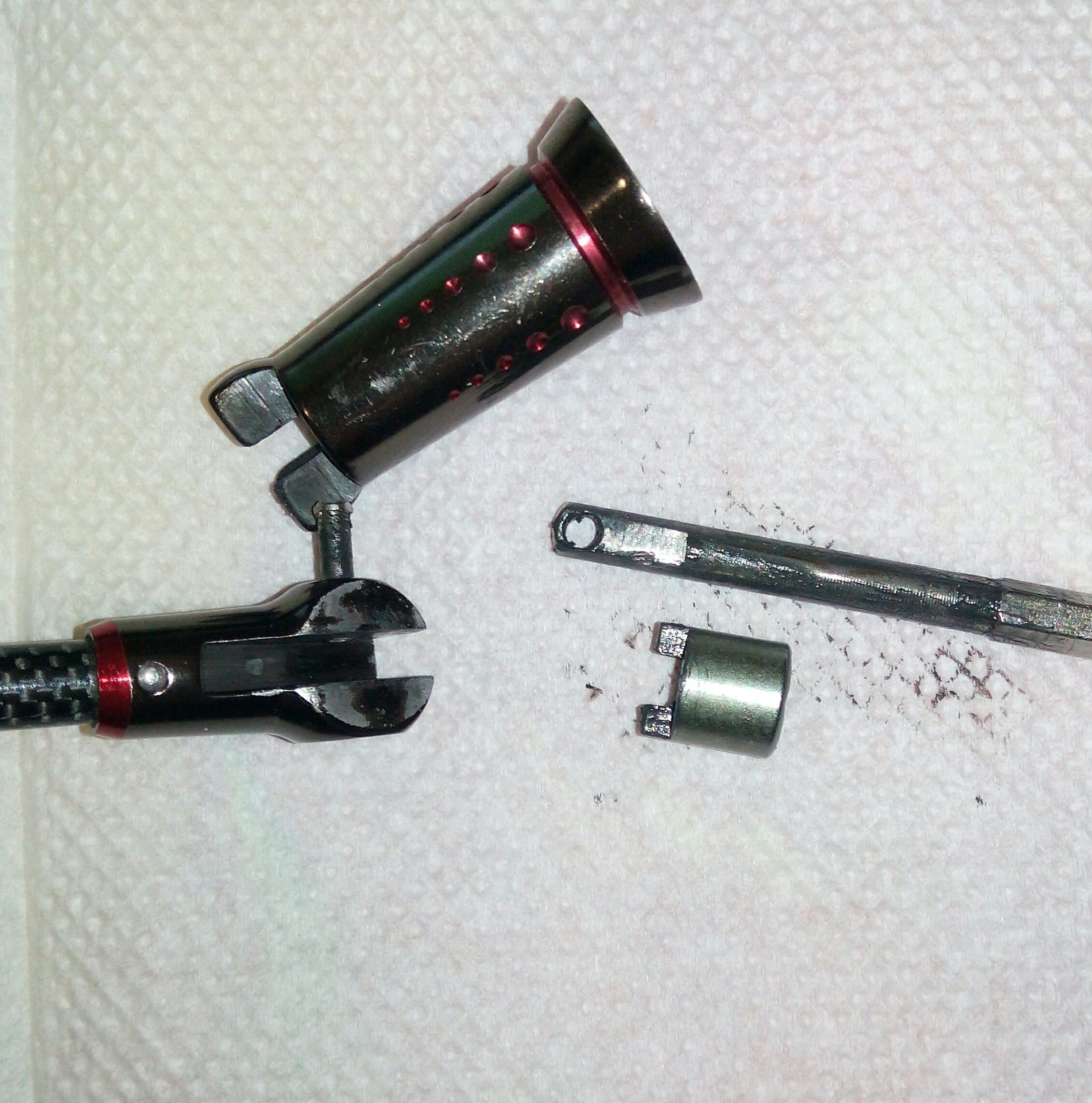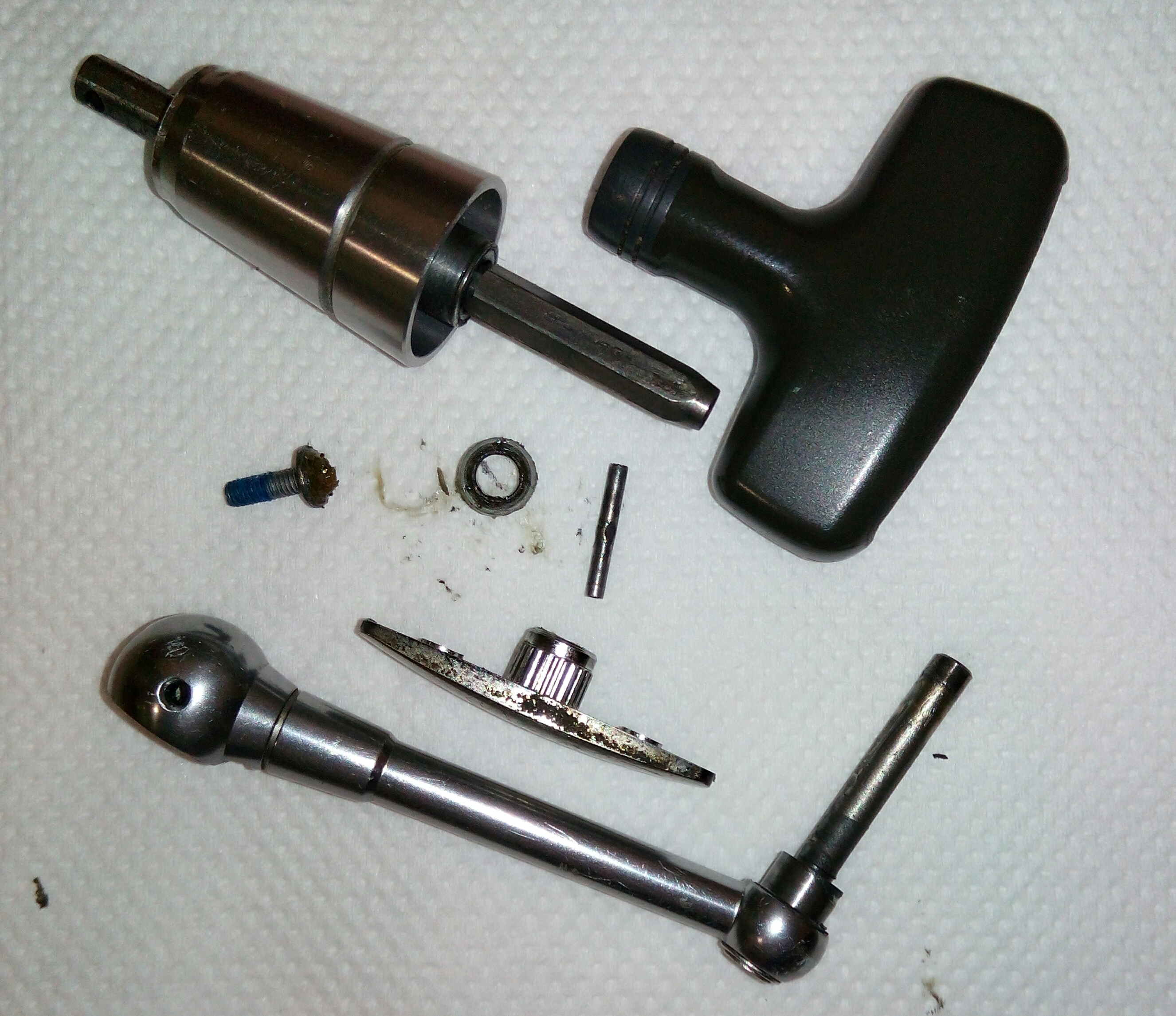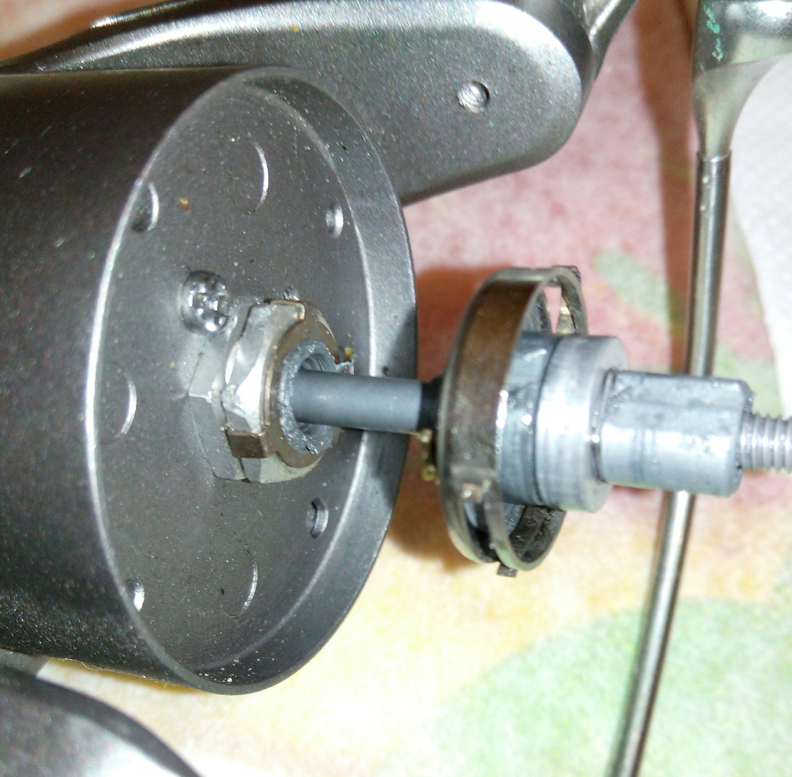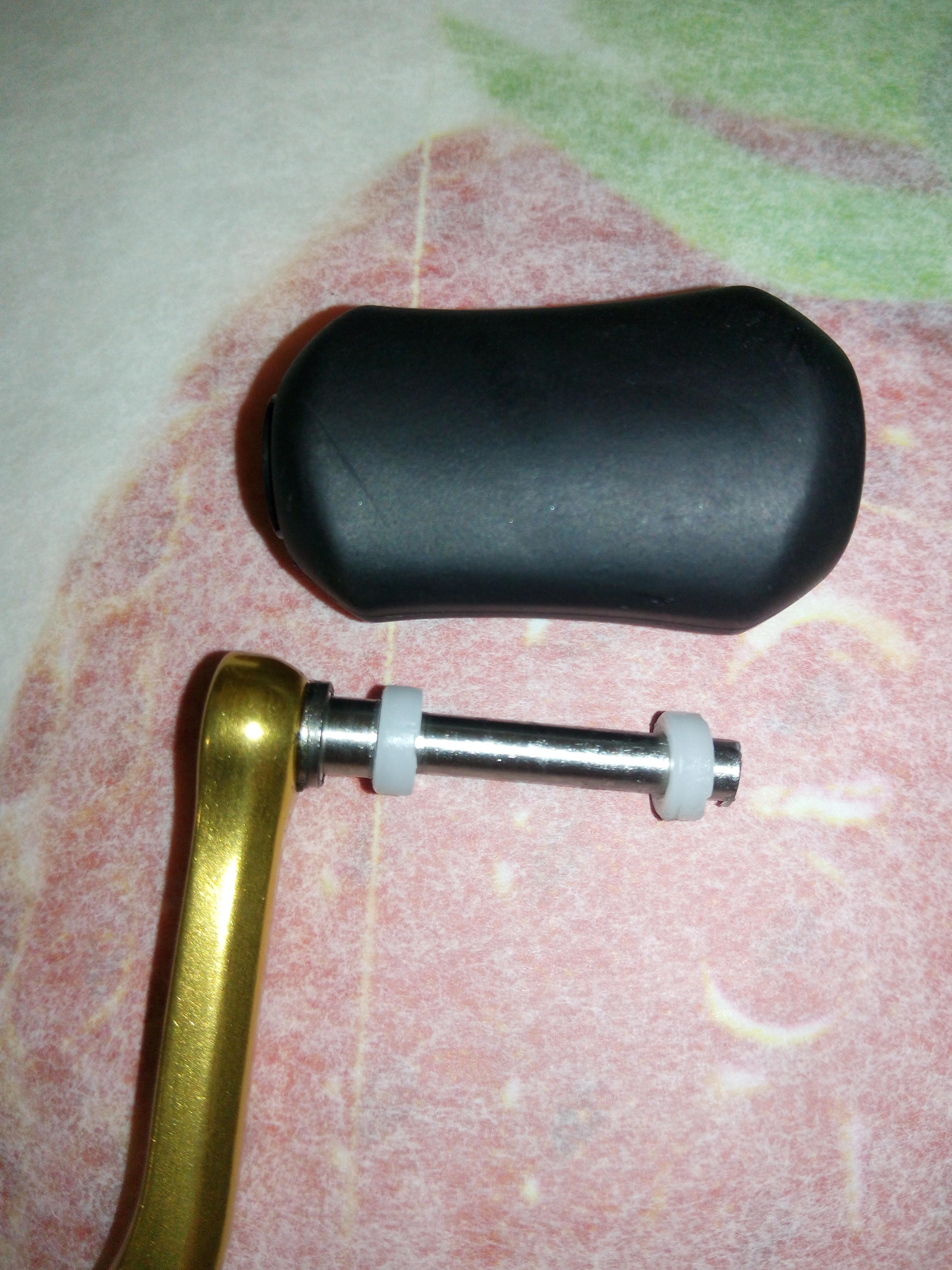 Дополнение к предыдущему посту Spro Grand Arc Tuff-Body 830. Устранение люфтов в рукоятке. Выбиваем шток сустава рукоятки. Делаю это только когда люфт действительно критичный как в данном случае. Иногда шток не поддаётся, тогда лучше не перестараться, иначе может треснуть весь узел, так как сделано всё из очень хрупкого сплава. Затем слегка оттягиваем (расклёпываем) ось, чтобы она расширилась и без зазаров входила в паз. Так как шестигранная часть оси тоже очень сильно болталась в шестерне, то её тоже подвергаем деформации. Пусть лучше рукоятка тяжелее складывается, чем на рыбалке ощущать раздражительный люфт.