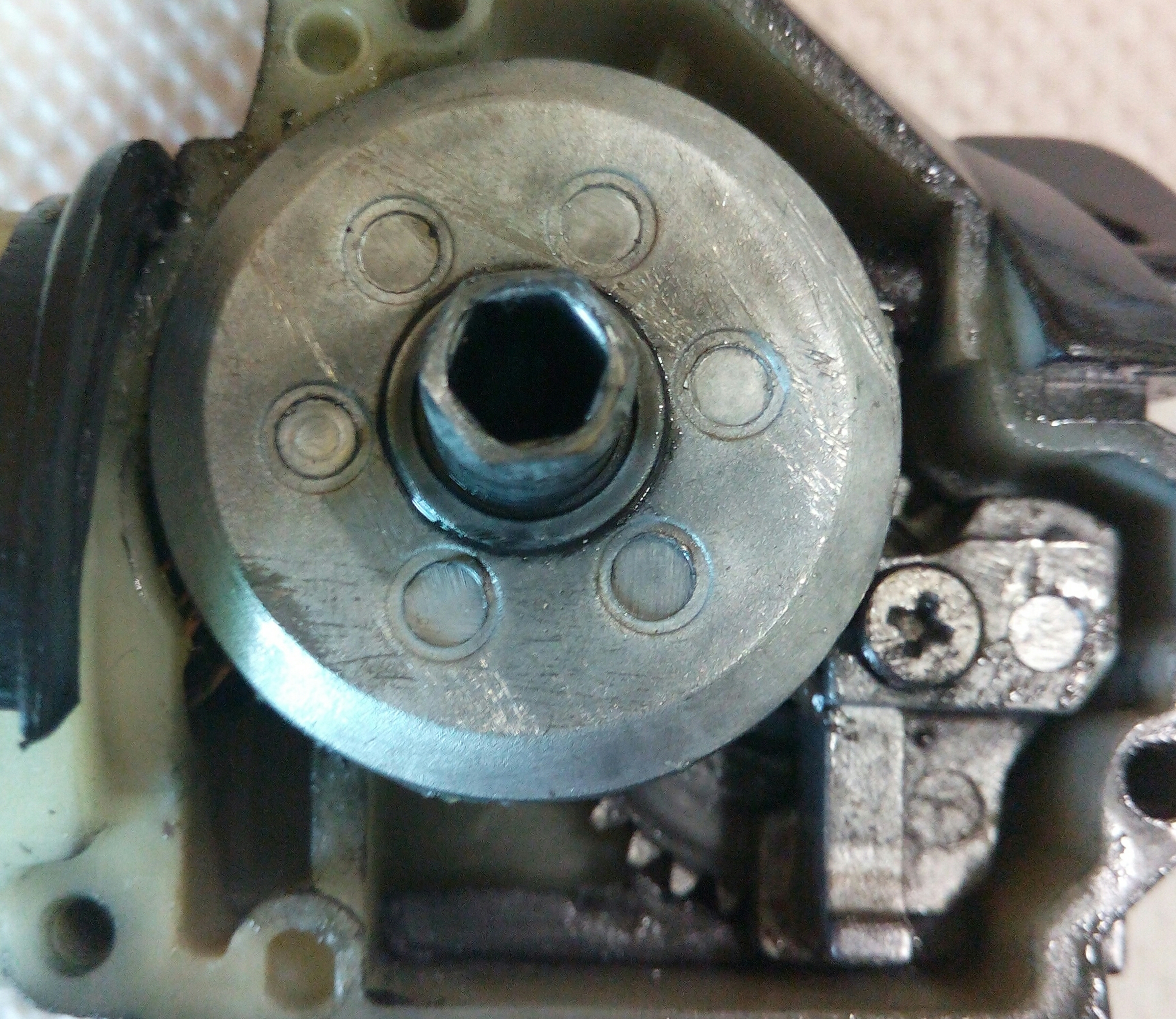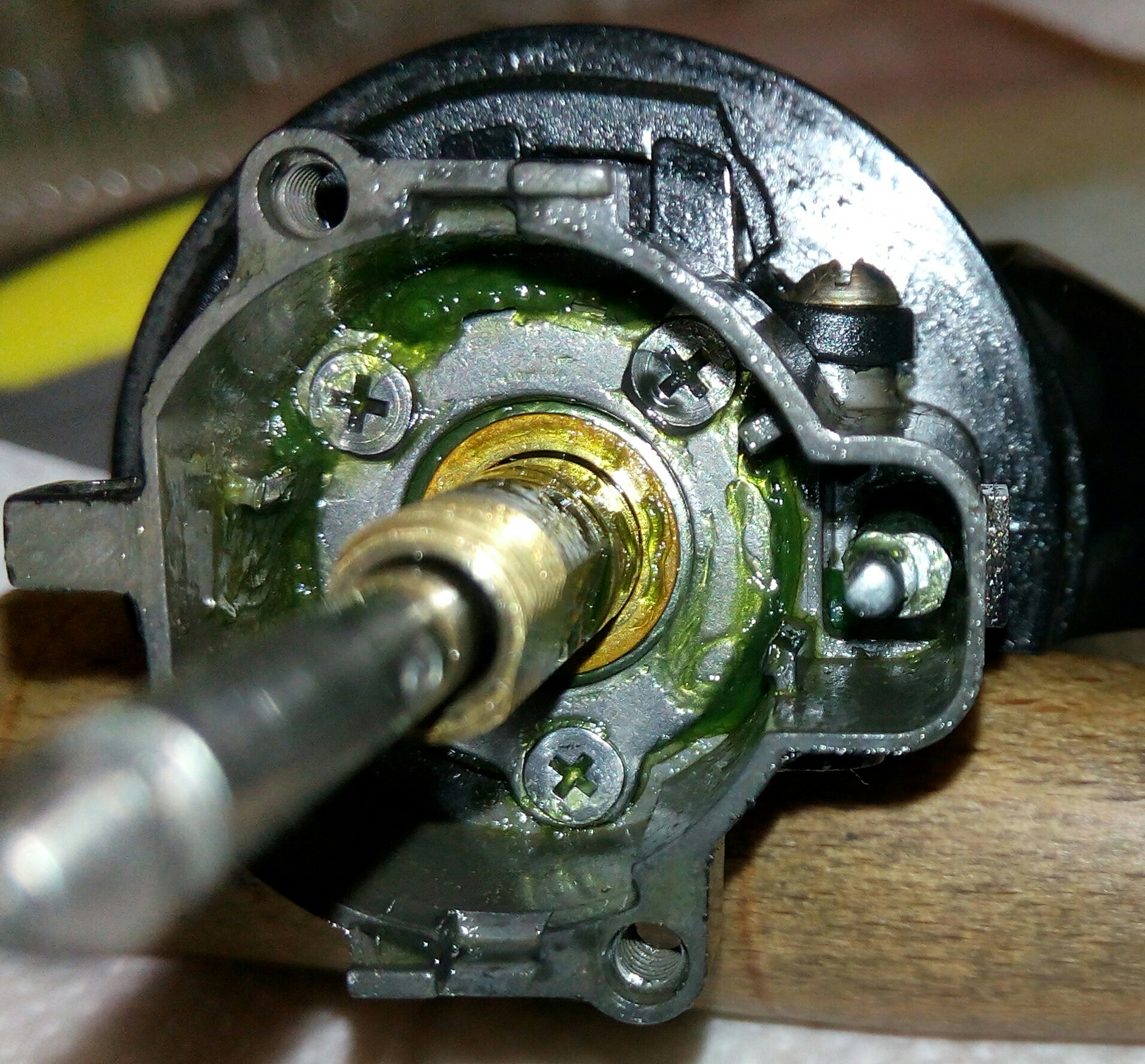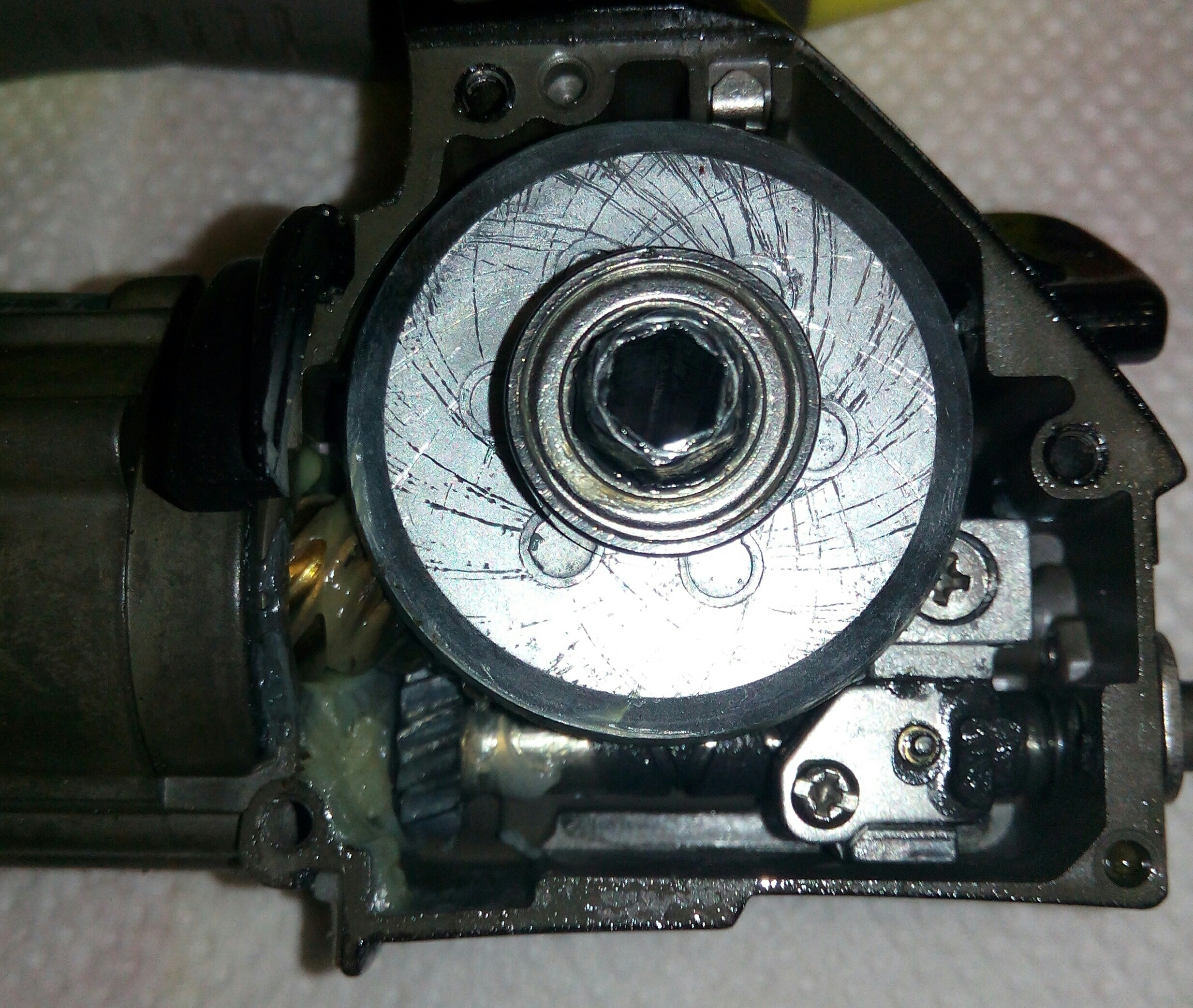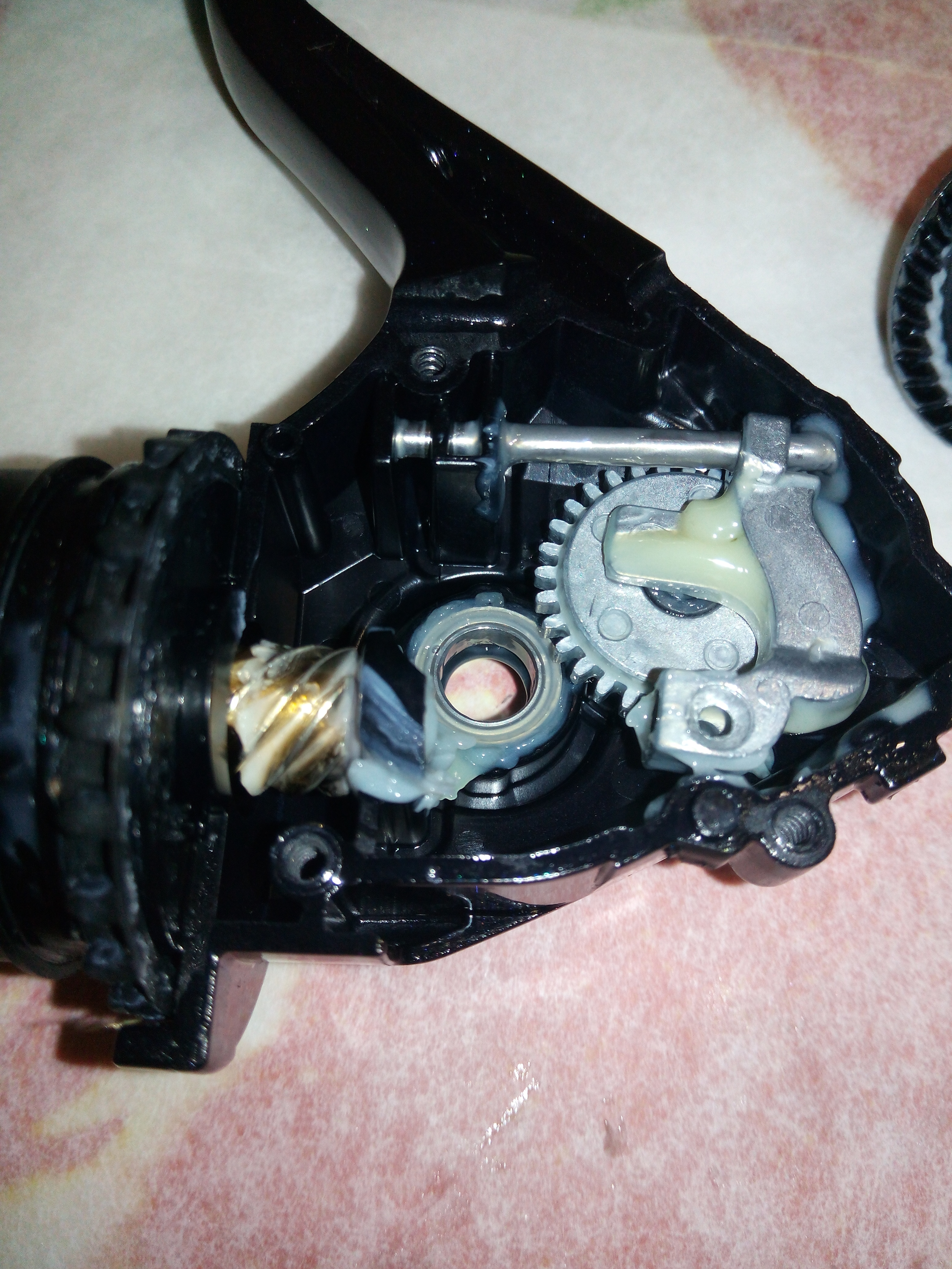 Катушка RYOBI Ecusima 2000Vi. Часто сталкиваюсь с разными моделями данной фирмы и, в основном все они «долгожители», которым под 10 лет. И почти у всех вижу одно и то же, при снятии крышки корпуса сразу бросается в глаза ослабленный винт на бегунке, который держит шток. Иногда своей шляпкой винт достаёт до зубцов ведущей шестерни, разбивая их. А в данном случае было видно, что слева от винтика отсутствует фрагмент бегунка, как оказалось позже, ослабленный шток постепенно его разрушал и при осмотре было видно, что ещё один фрагмент был отломан. Во время рыбалки он мог попасть в ГП и тогда бы могло быть на много хуже. С таким дефектом бегунок свою функциональность не потерял, винт посадил на фиксатор резьбы и шток теперь абсолютно обездвижен. За долгие годы появился износ ГП, точнее только ведущей шестерни. Износ интересный, каждый второй зубец целый, а остальные стёртые почти на треть. Так же заменил втулку на подшипник, если бы это было сделано раньше, то уверен, что такого износа точно не было бы. Естественно, часто при таком износе от рычащего звука избавиться уже не получается. Если катушку не перегружать, то она ещё долго прослужит.