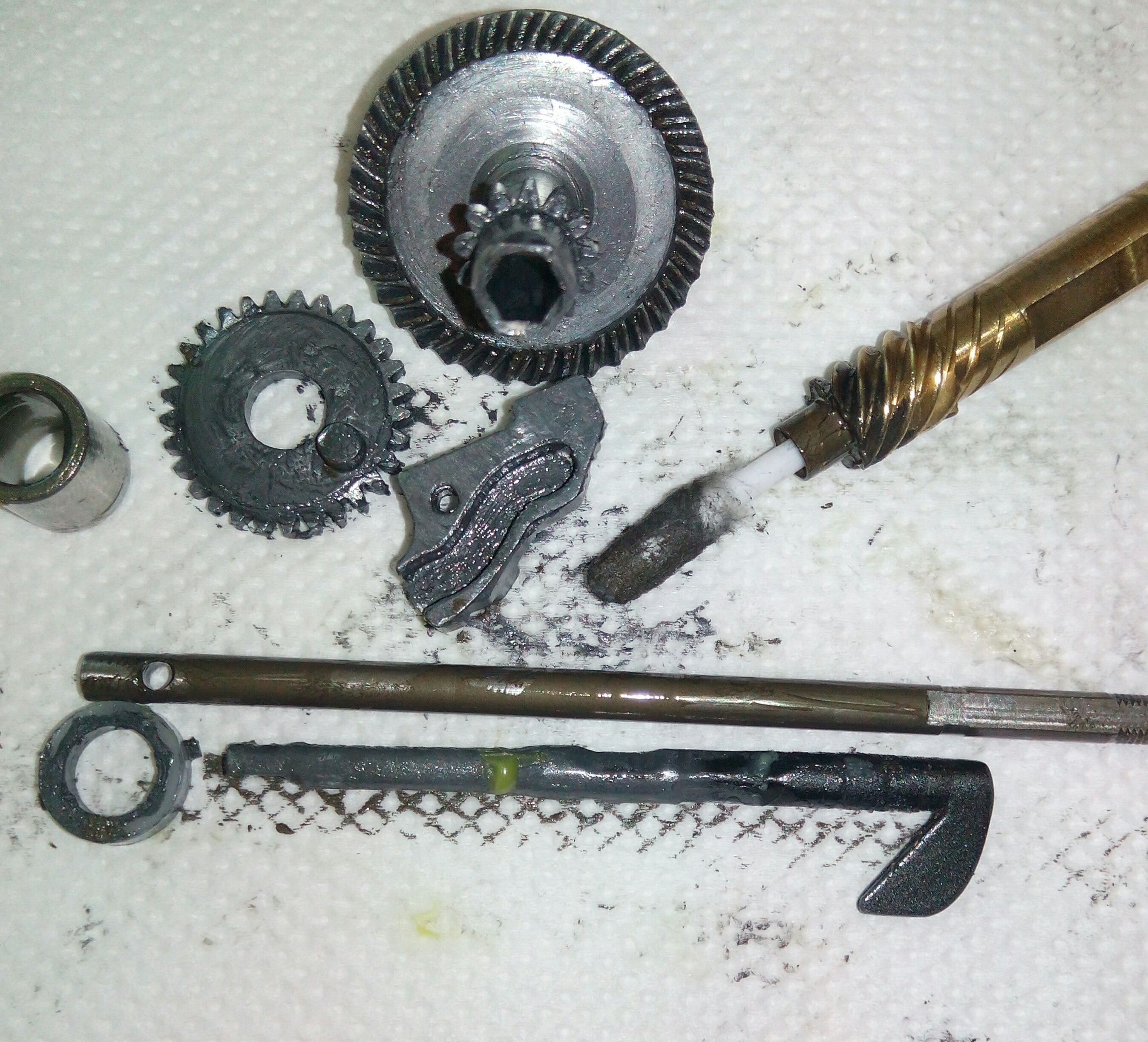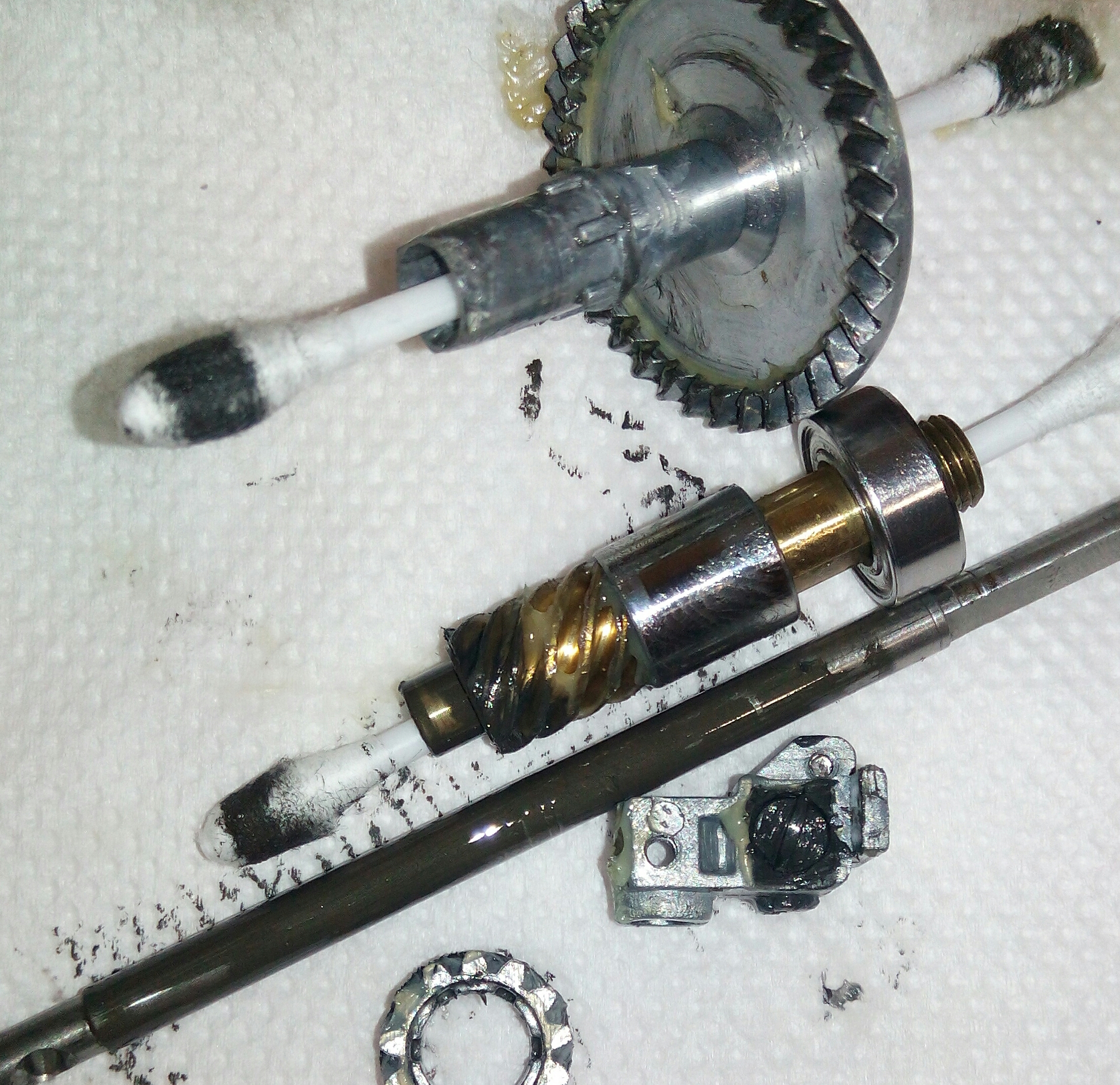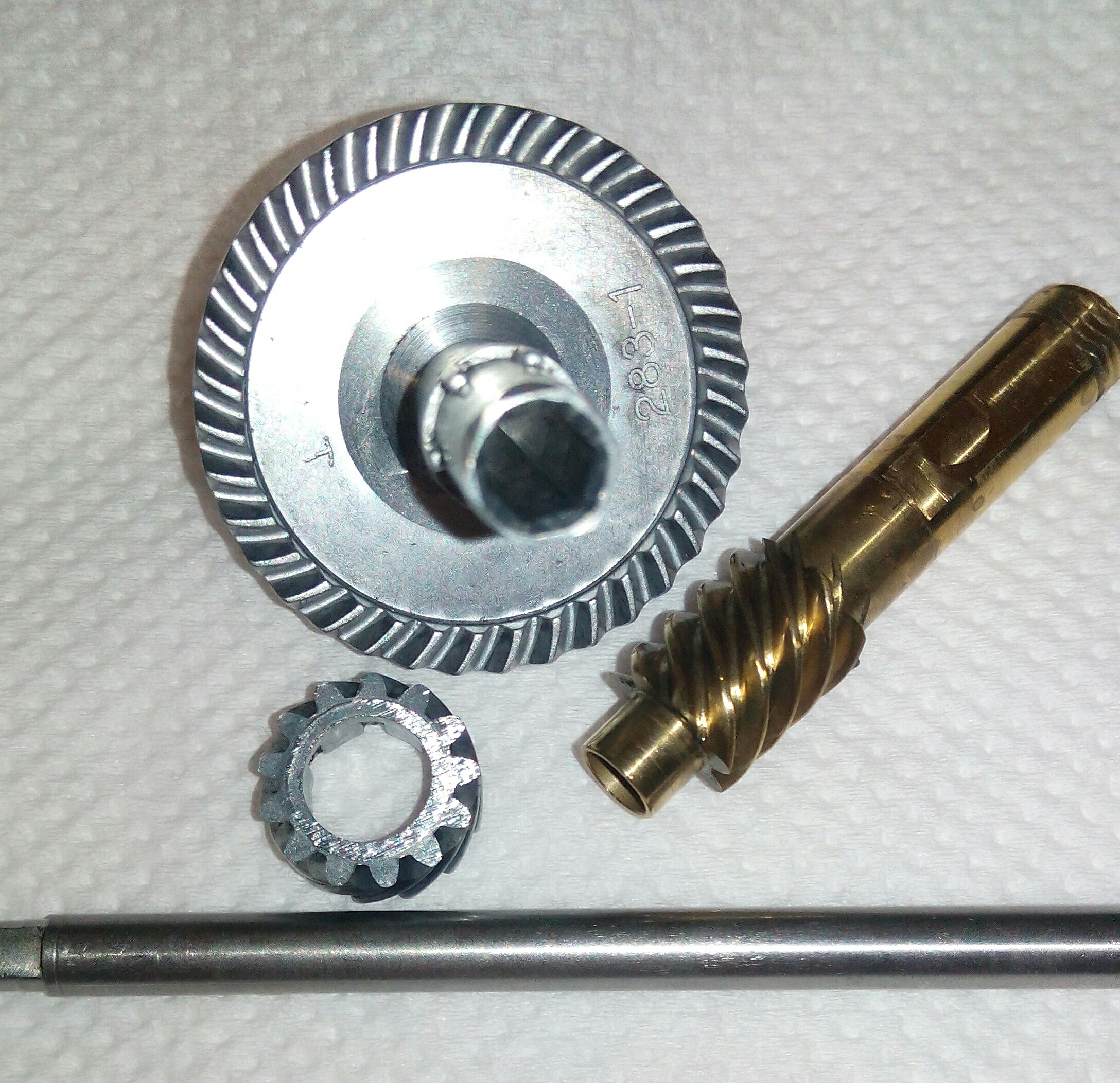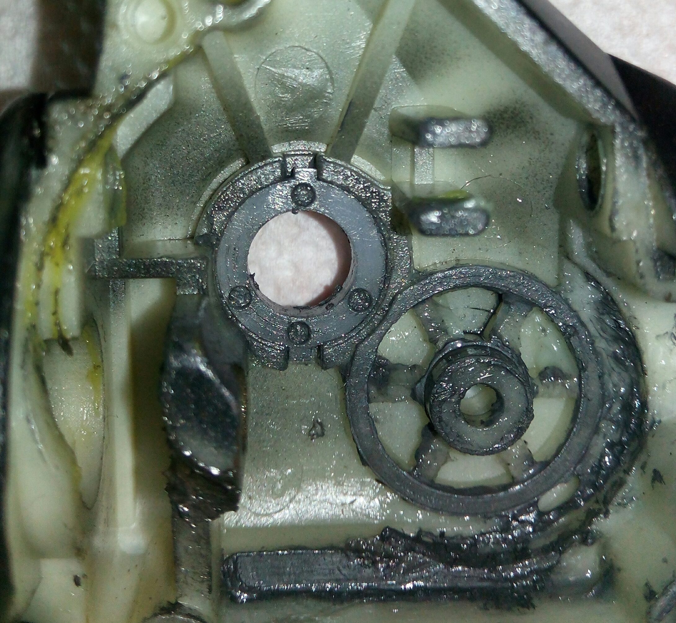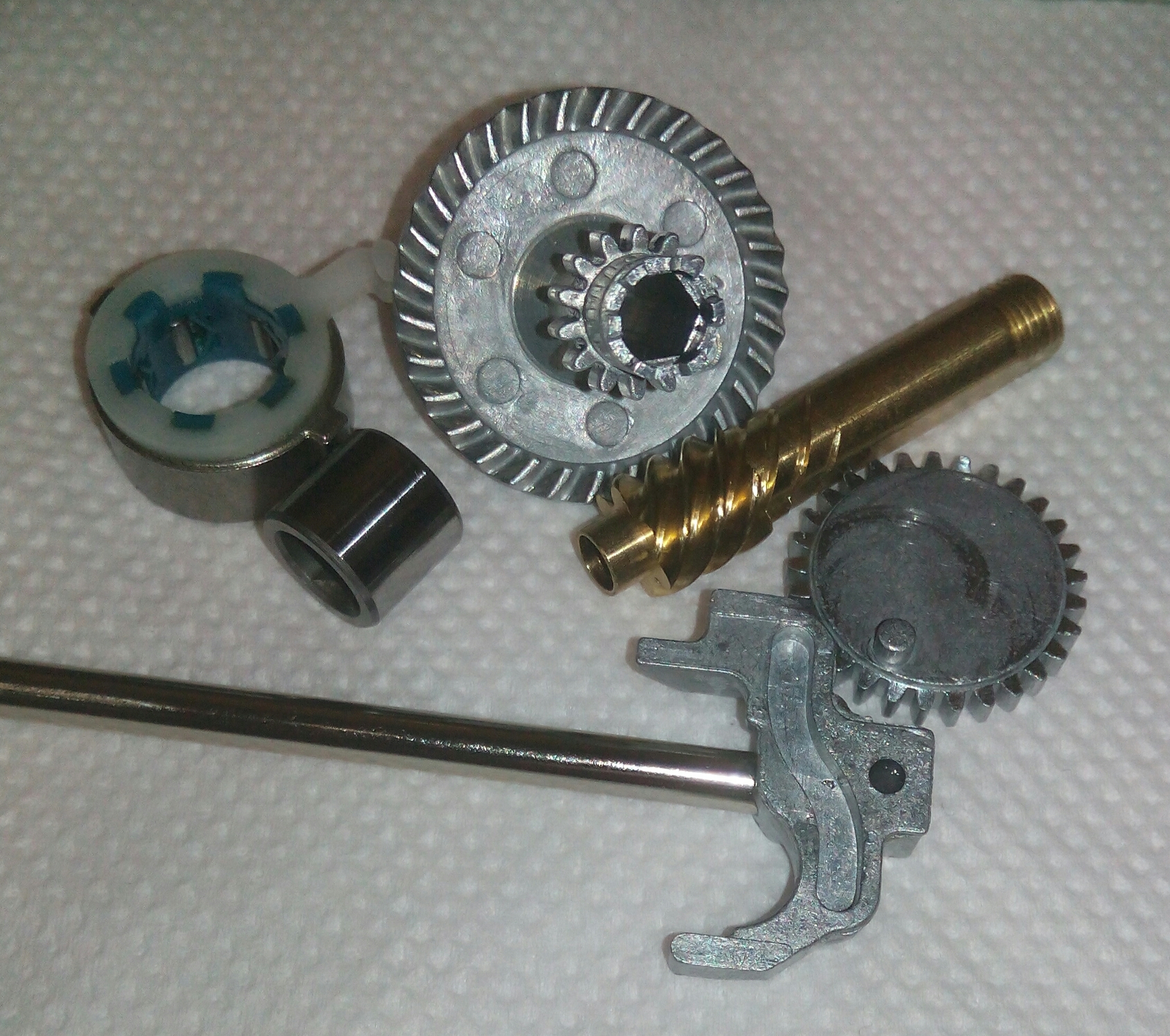 Катушка RYOBI Ecusima 2000Vi. Часто сталкиваюсь с разными моделями данной фирмы и, в основном все они «долгожители», которым под 10 лет. И почти у всех вижу одно и то же, при снятии крышки корпуса сразу бросается в глаза ослабленный винт на бегунке, который держит шток. Иногда своей шляпкой винт достаёт до зубцов ведущей шестерни, разбивая их. А в данном случае было видно, что слева от винтика отсутствует фрагмент бегунка, как оказалось позже, ослабленный шток постепенно его разрушал и при осмотре было видно, что ещё один фрагмент был отломан. Во время рыбалки он мог попасть в ГП и тогда бы могло быть на много хуже. С таким дефектом бегунок свою функциональность не потерял, винт посадил на фиксатор резьбы и шток теперь абсолютно обездвижен. За долгие годы появился износ ГП, точнее только ведущей шестерни. Износ интересный, каждый второй зубец целый, а остальные стёртые почти на треть. Так же заменил втулку на подшипник, если бы это было сделано раньше, то уверен, что такого износа точно не было бы. Естественно, часто при таком износе от рычащего звука избавиться уже не получается. Если катушку не перегружать, то она ещё долго прослужит.