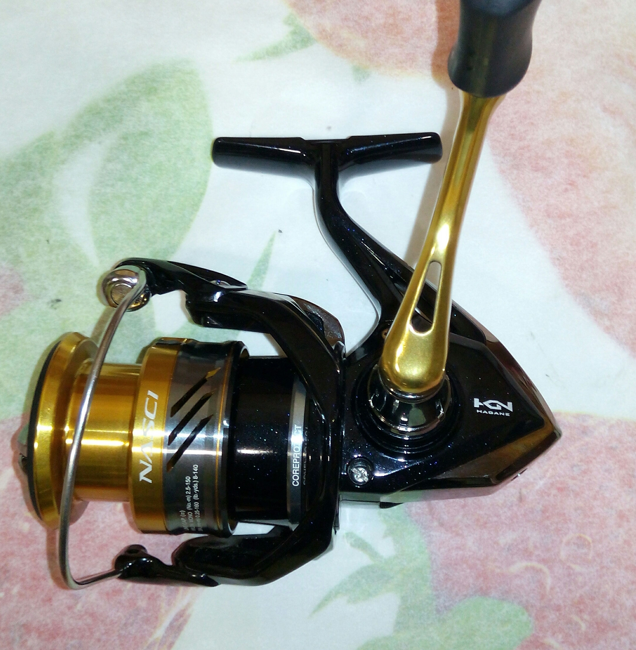 Shimano 16 Nasci 2500. Абсолютно новая катушка, владелец её приобрёл в США. Катушка обладает лёгким стартом с очень плавным ходом. Звуков не издаёт вообще, настолько тихих катушек давно уже не видел. Только кноб немного люфтил, но после замены втулок на подшипники и регулировки зазора всё стало совсем по другому. Абсолютная тишина, разве что, если сильно раскрутить, то слышно как ротор гоняет ветер