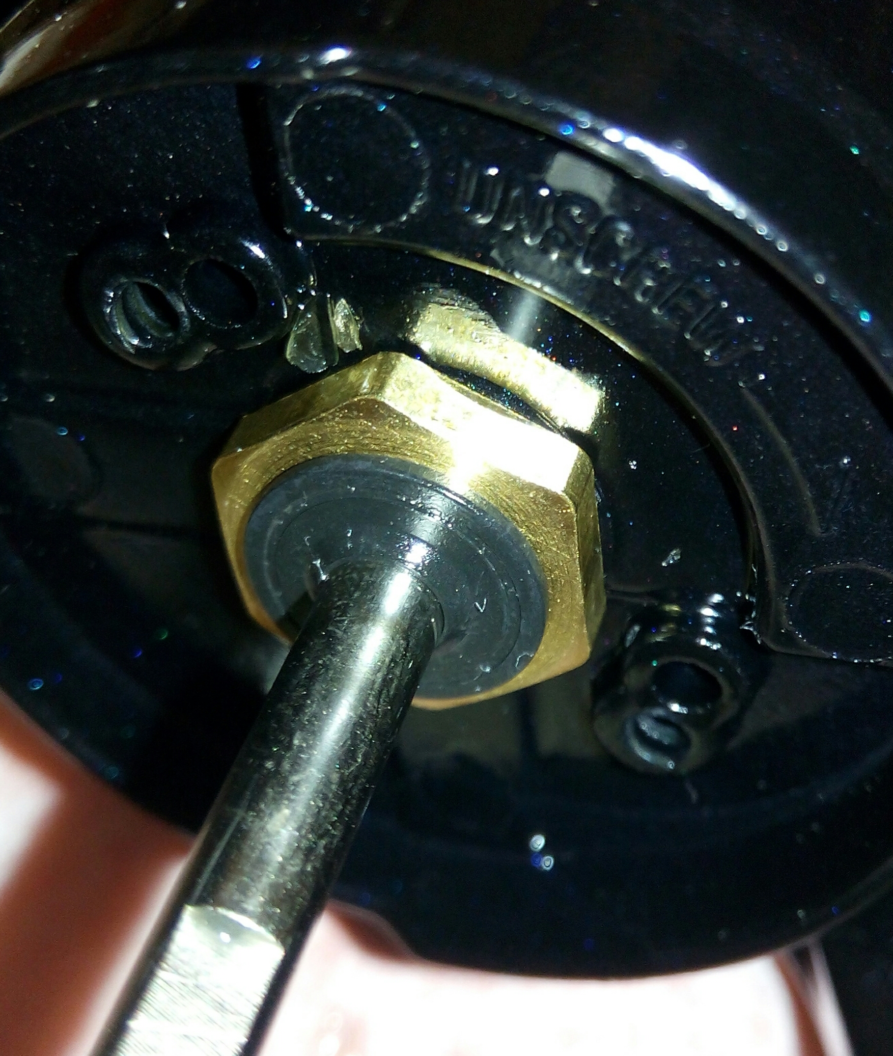 Кноб. Многие производители комплектуют свои катушки подобным кнобом с красивой заглушкой разного цвета. Очень часто, почти постоянно, сталкиваюсь с тем, что эту заглушку не возможно открутить чтобы её не повредить. Мало того, что её садят на герметик, так ещё и не всегда знаешь в какую сторону её крутить так как они бывают как с правой так и левой резьбой. Пластиковая отвёртка не берёт, а металлическая, даже если битку чем нибудь обмотать, всё равно наносит повреждение, потому что заглушка сделана с очень мягкого сплава. На функциональность катушки это, естественно, не влияет, но эстетический вид портит. В помощь приходит баллончик с краской.