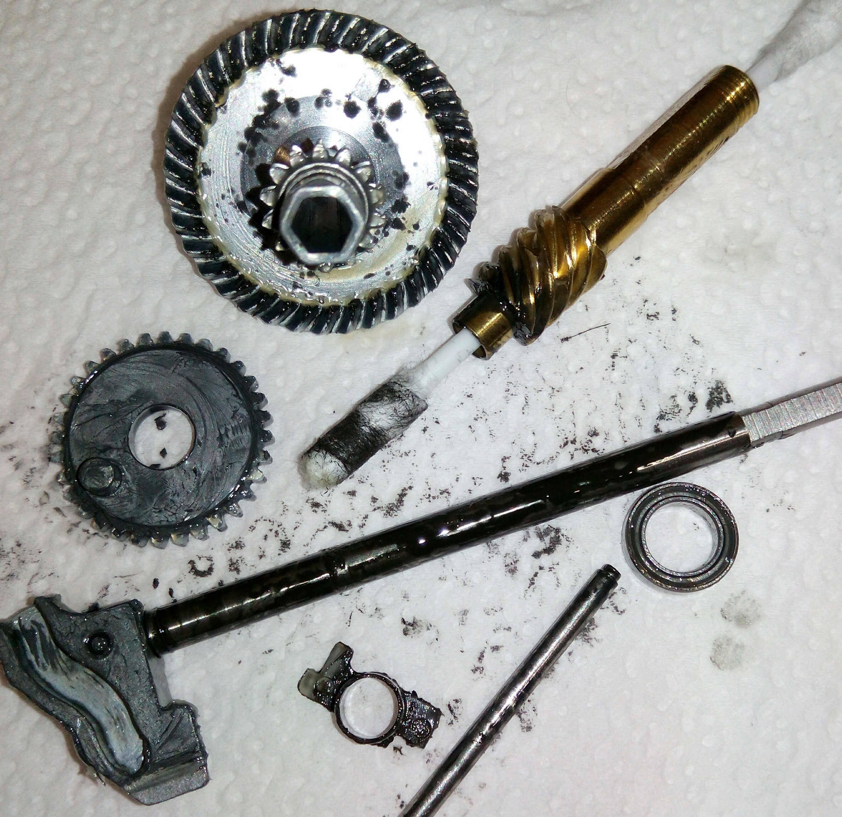 Катушка Shimano 15 Stradic 2500S. Был люфт на ГП и в держателях дужки л/у ощутимые в руку при вращении рукоятки. Смазки на ГП было не достаточно, зато паразитки купались в масле. Моё мнение - не желательно эксплуатировать полусухую катушку. Втулки в кнобе, на бесконечнике и в подшпульном механизме заменены на подшипники. Так же исправил намотку, так как хоть и не сильно, но наползание шнура на бортик шпули присутствовало.