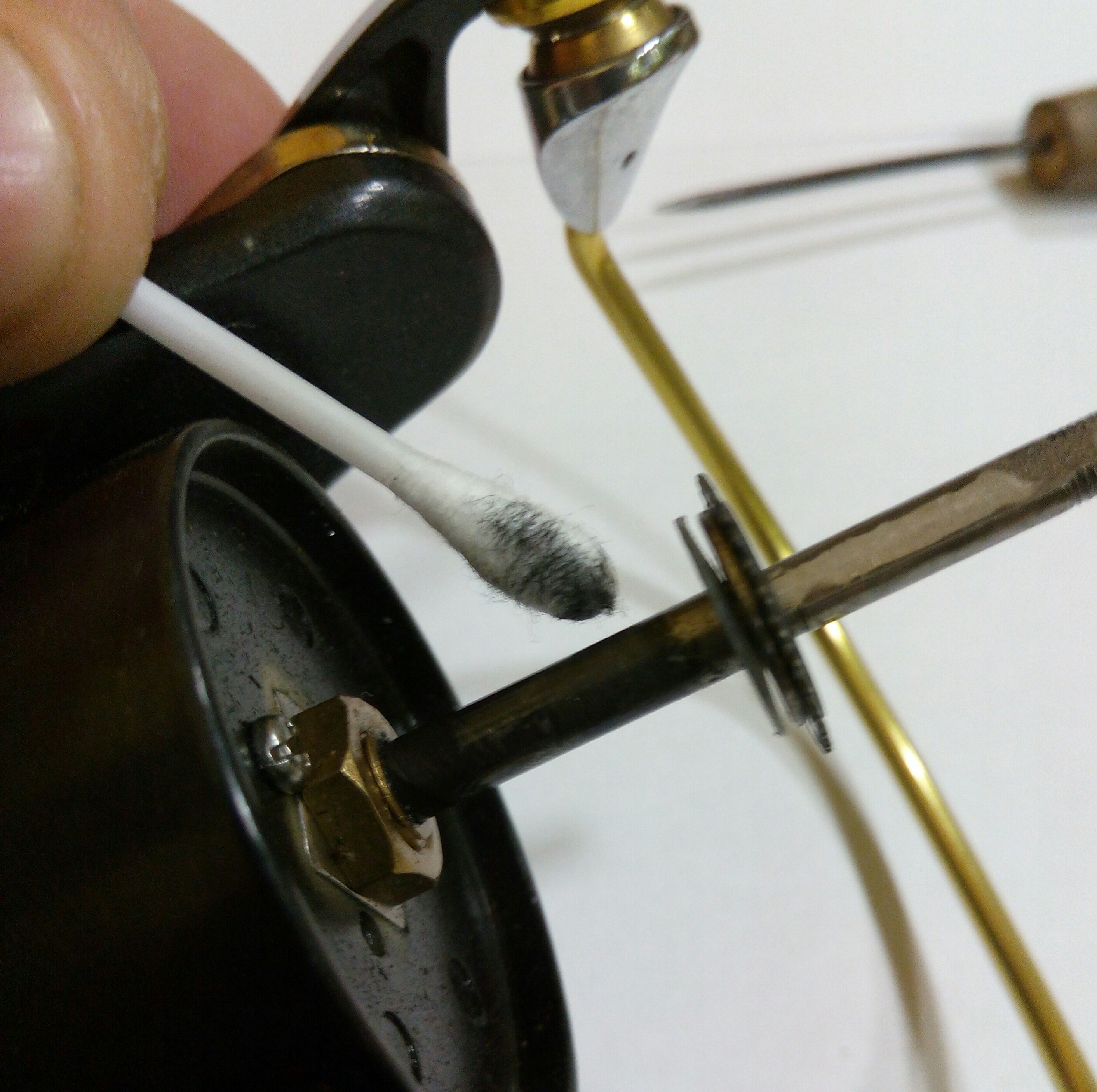Снимаю шпулю и вижу, что шток очень чёрный - первый признак, что пора делать ТО