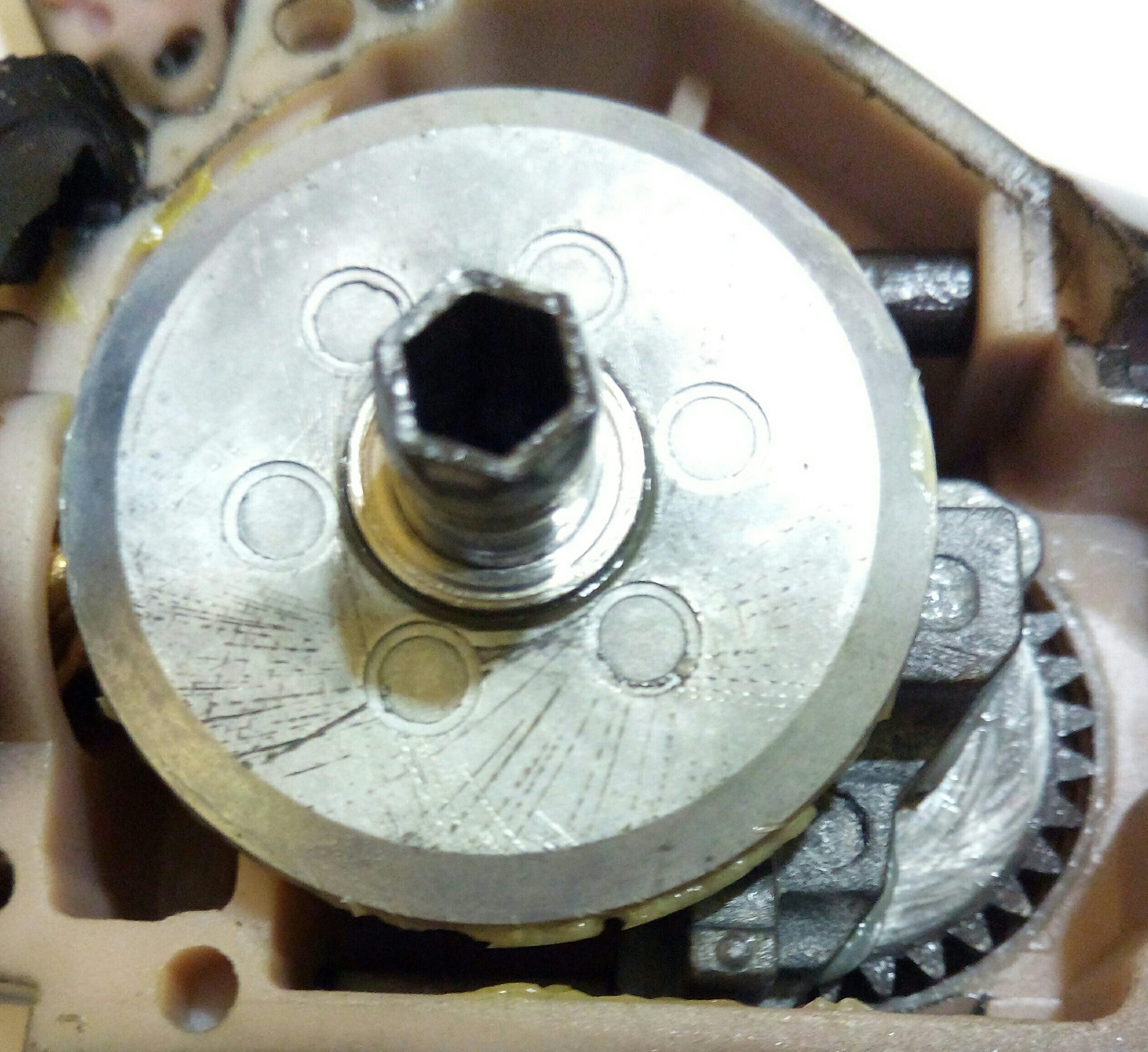 Кстати, крутилась она идеально без посторонних шумов. Так как эти две половинки были стянуты между собою винтом, который прижимает рукоять к шестерне. Плюс к тому, шток рукояти шестигранный, соответственно ведущая шестерня внутри тоже шестигранная поэтому эти два куска не могут сместиться относительно друг друга.