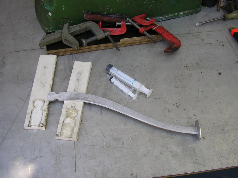 Чуть продвинулся. Нагрел заднюю часть ножа, выпалил ним в пенопласте (за правильный пенопласт спасибо Сергею Shel) под него "посадку", склеил 2 половинки эбоксидкой, по черновому обточил ручку. Чуть поже будет время заточу и шлифану нож, обточу, шлифану и пропитаю эпоксидкой пенопластовую ручку