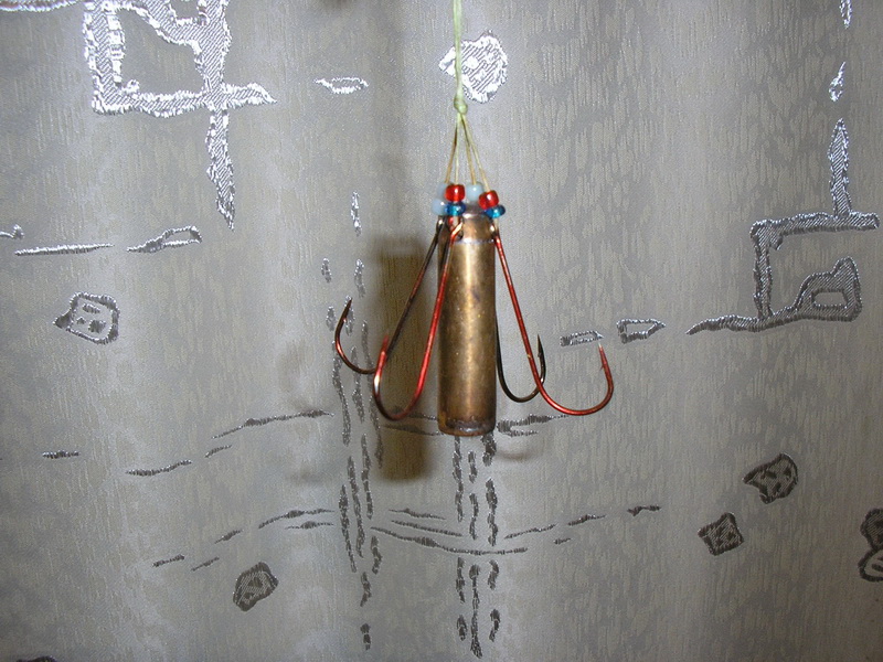 Заливаем в гильзу свинец, обрезаем "юбку" которая зажимает патрон, на наждаке скругляем срез и обтачиваем "юбку" в районе капсуля. На скруглении сверлим перпендикулярно 2 отверстия и вяжем крючки.